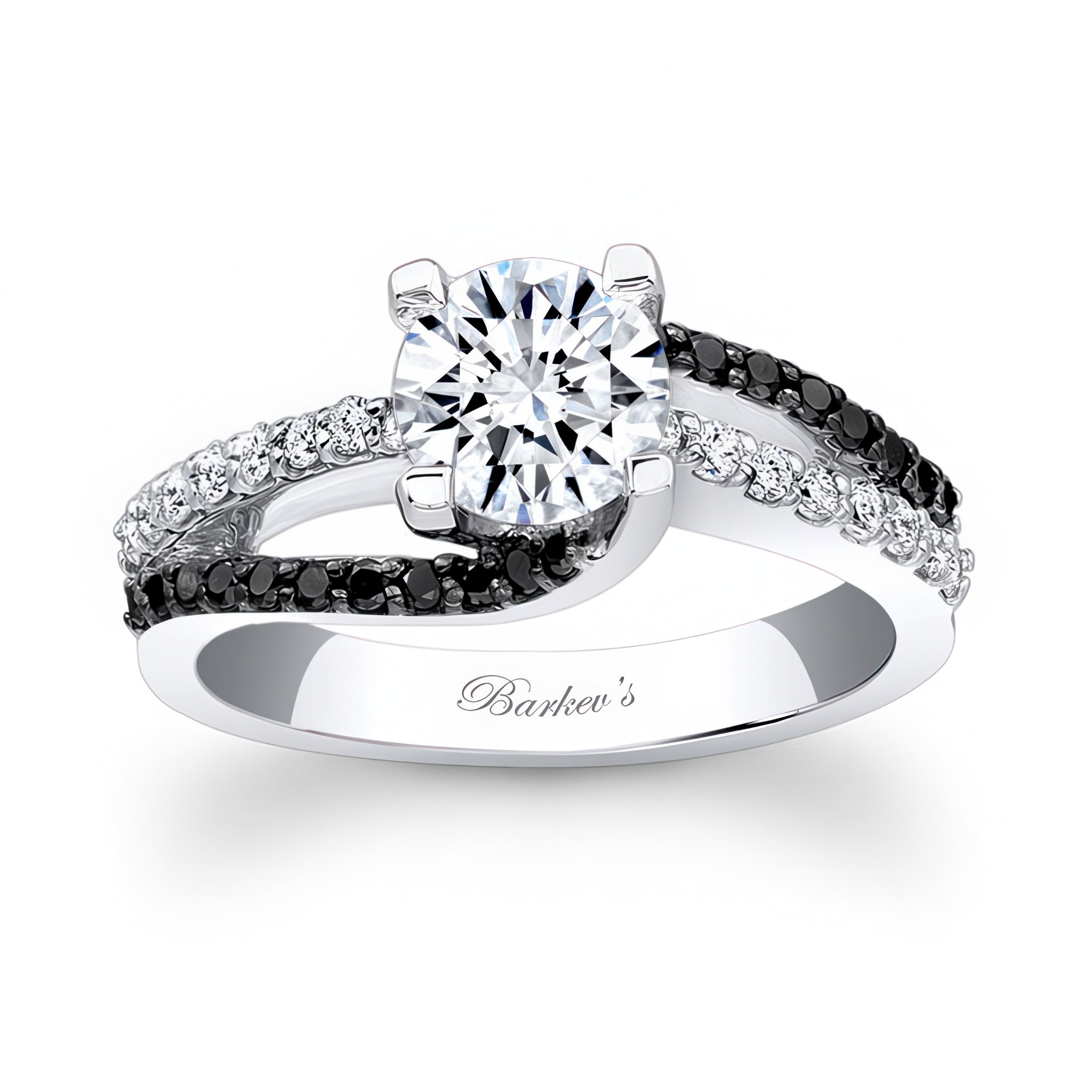 A classic 1 carat round cut black diamond accent ring featuring a prong set center with shared prong set black diamonds adorning the sides and white diamonds set on the bridge for an elegant touch of drama.