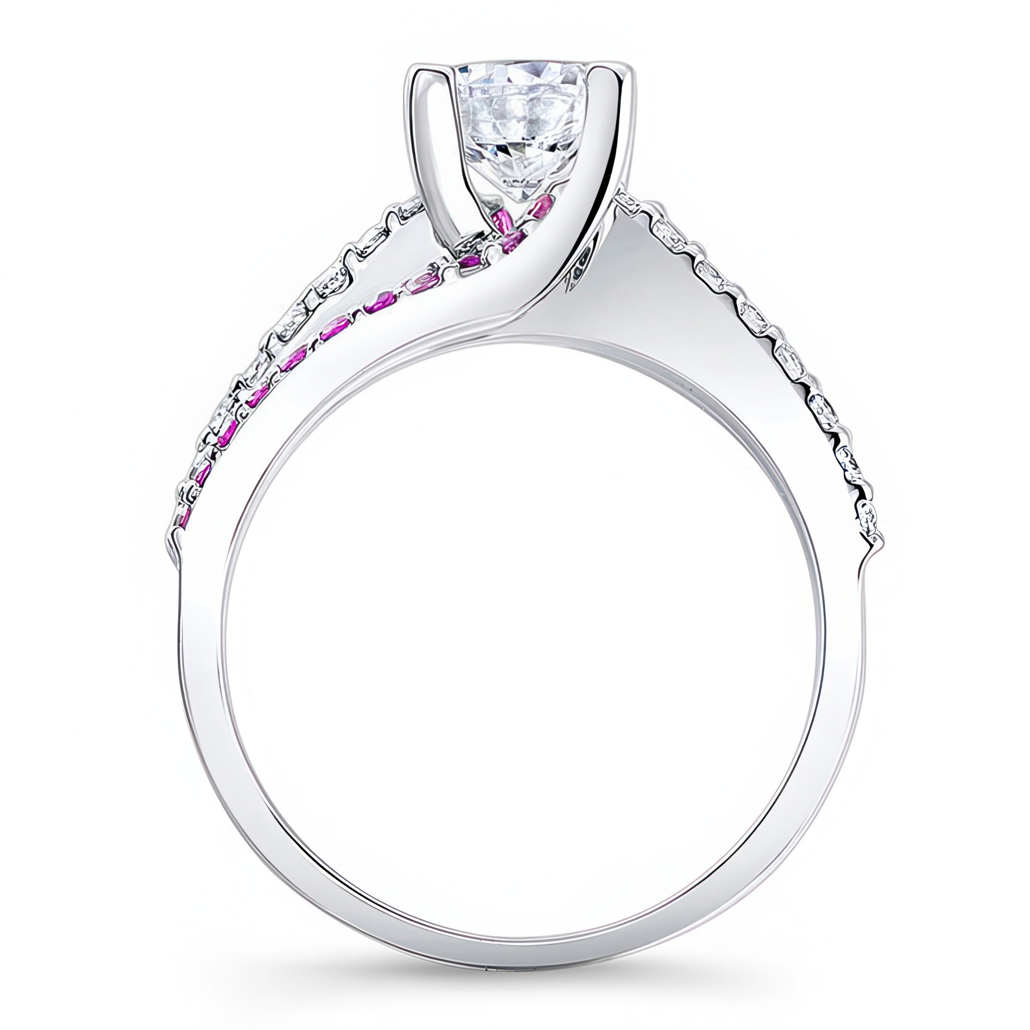 A classic 1 carat round cut pink sapphire accent ring featuring a prong set center with shared prong set pink sapphires adorning the sides and diamonds set on the bridge for an elegant touch of drama.