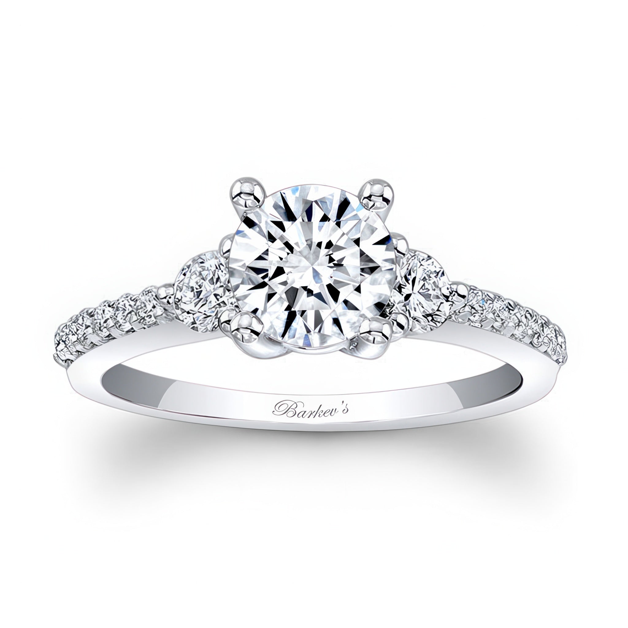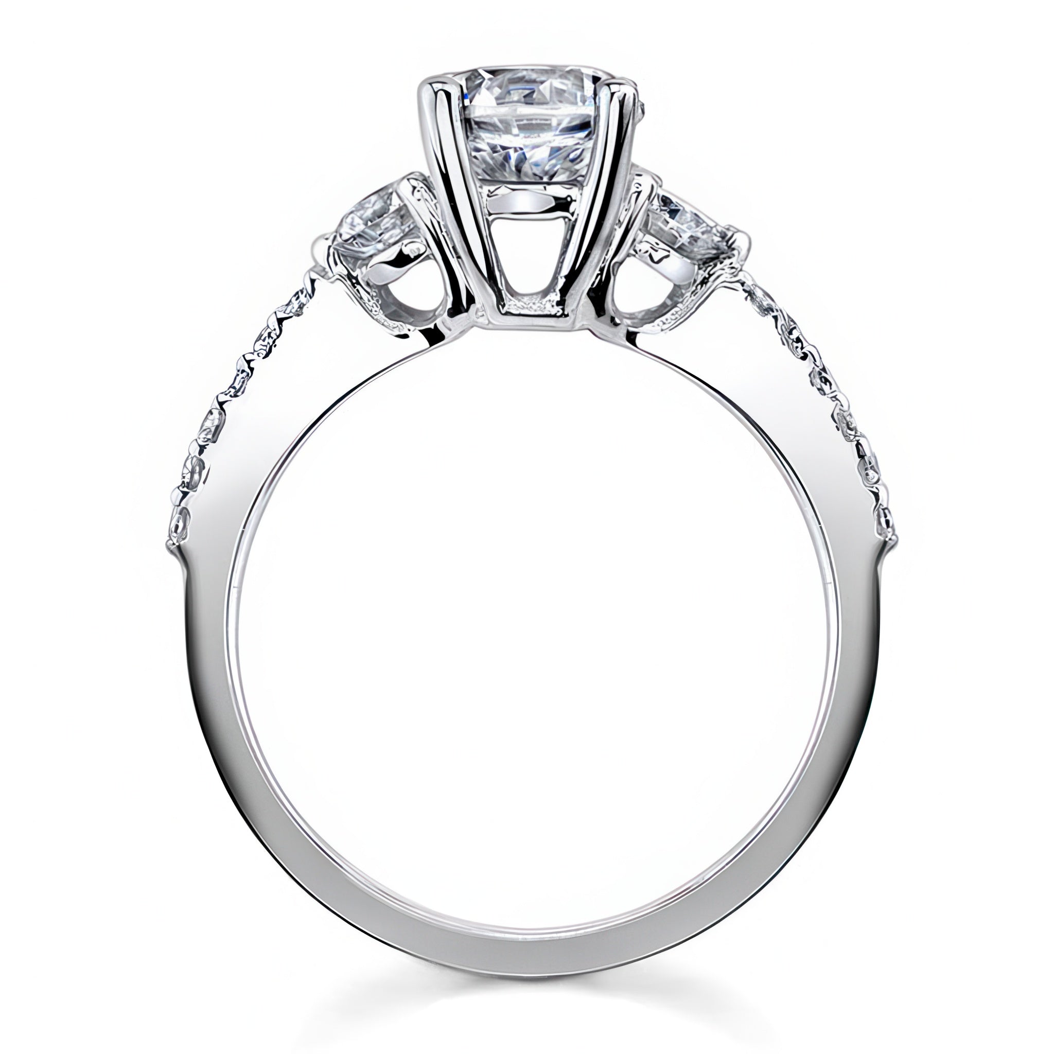 This 3 stone diamond ring features diamonds flanking the prong-set round center. The dainty shoulders are adorned with shared prong set melees adding the finishing touch of elegance to this ring.