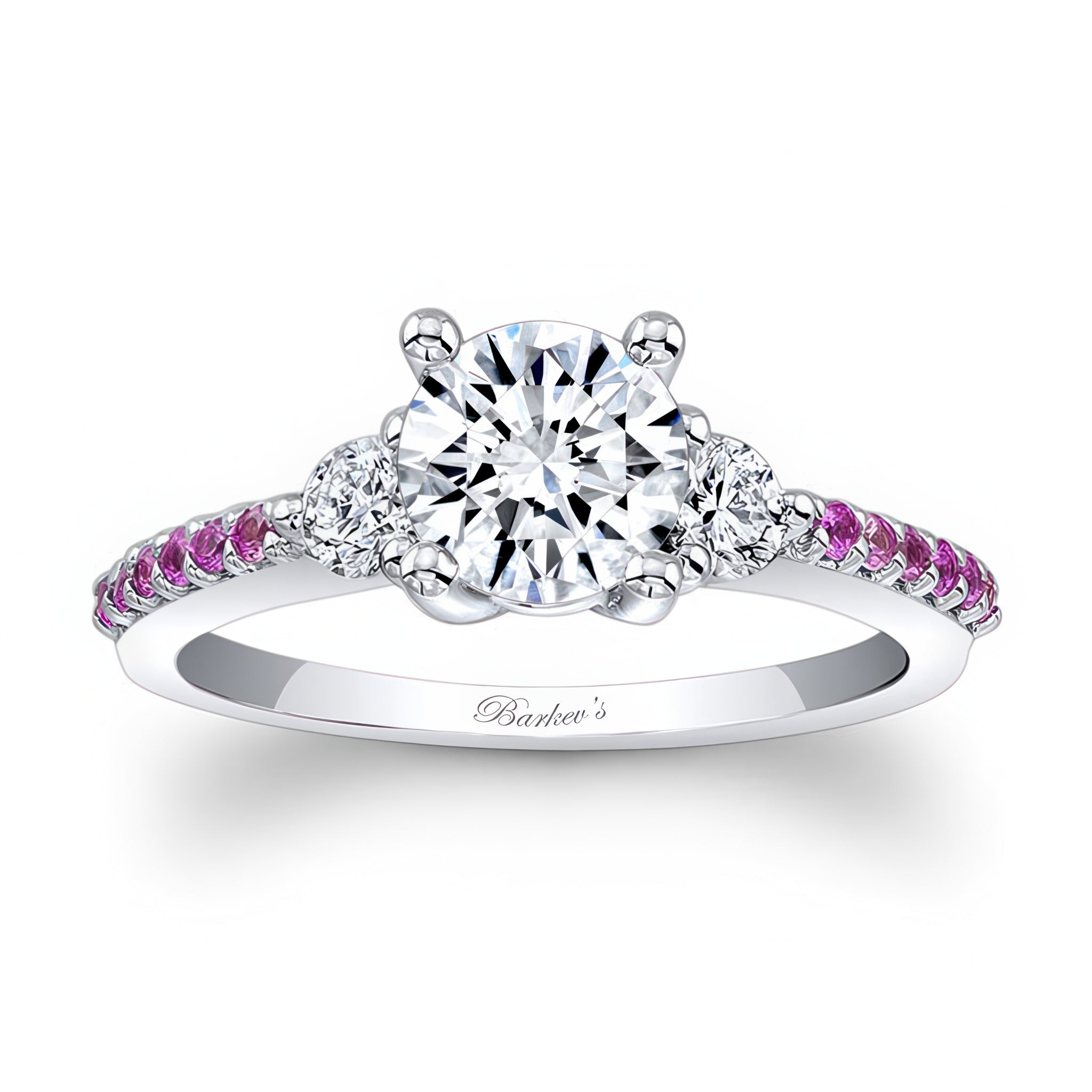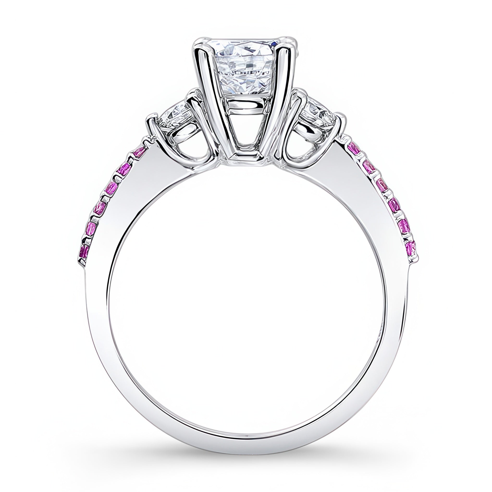 This 3 stone pink sapphire ring features accent stones flanking the prong-set round center. The dainty shoulders are adorned with shared prong set melees adding the finishing touch of elegance to this ring.