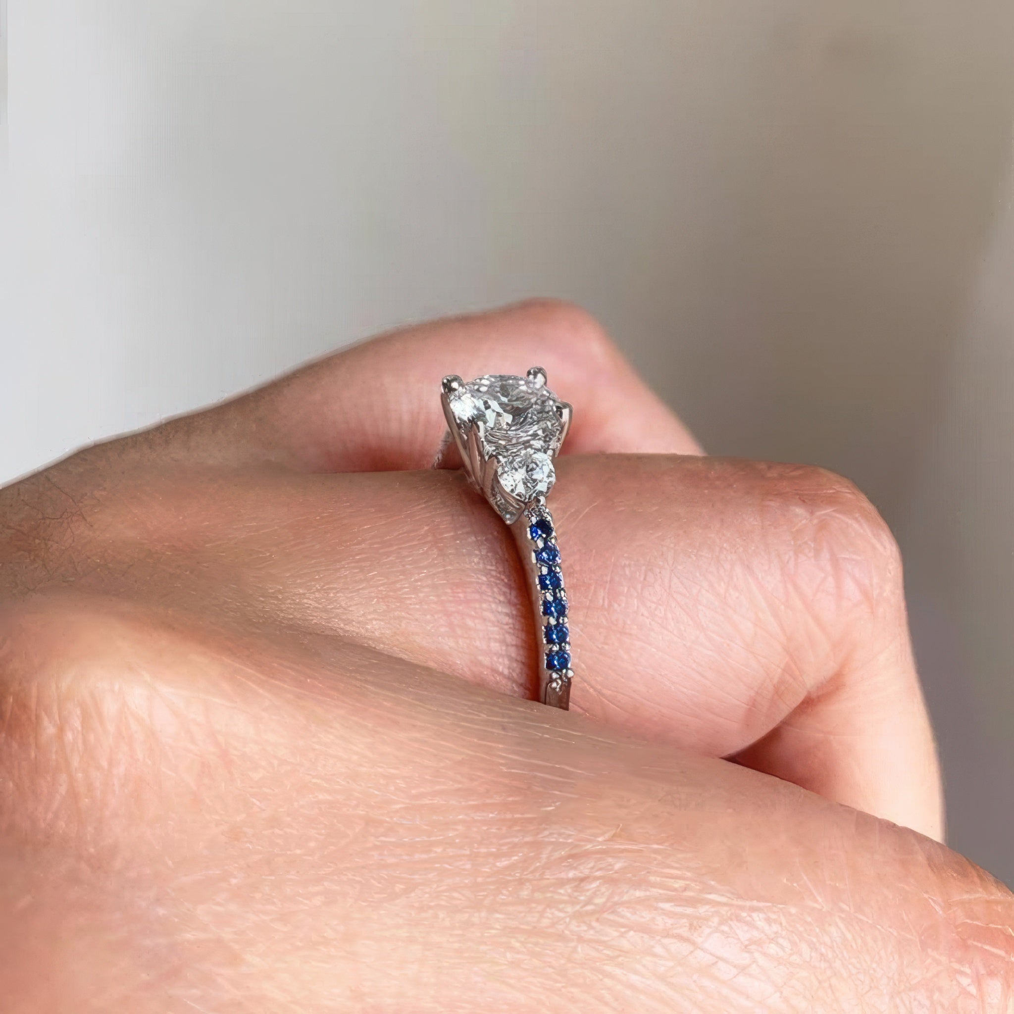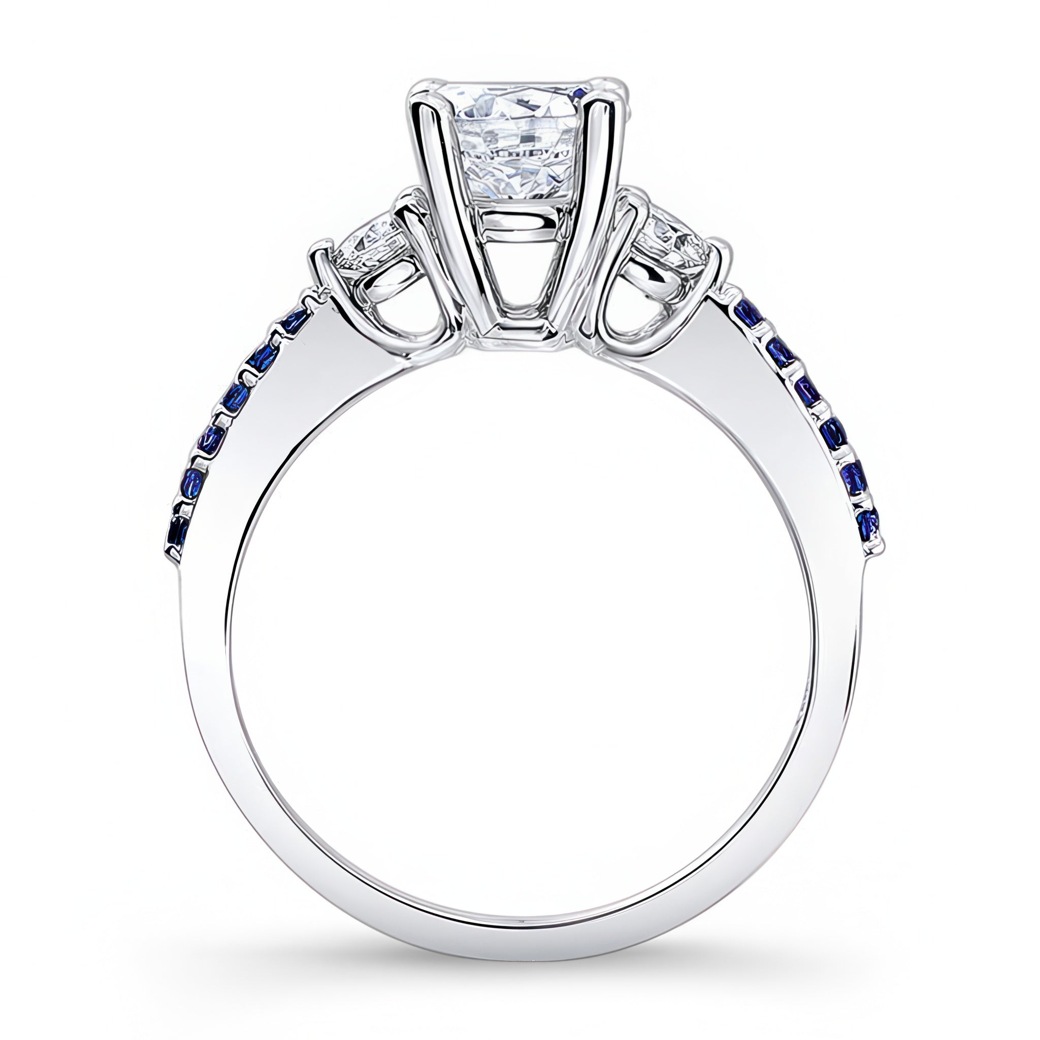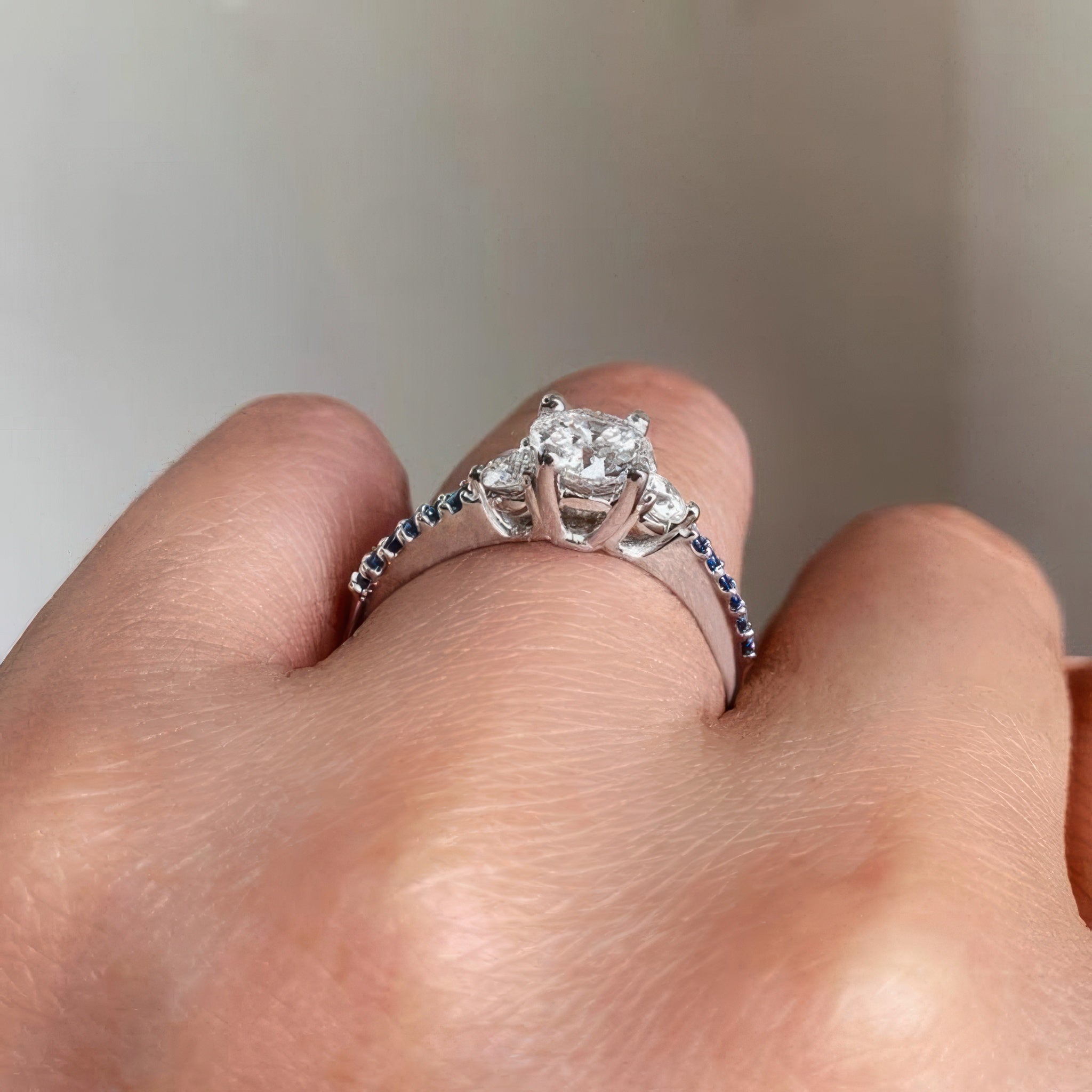 This 3 stone sapphire ring features accent stones flanking the prong-set round center. The dainty shoulders are adorned with shared prong set melees adding the finishing touch of elegance to this ring.