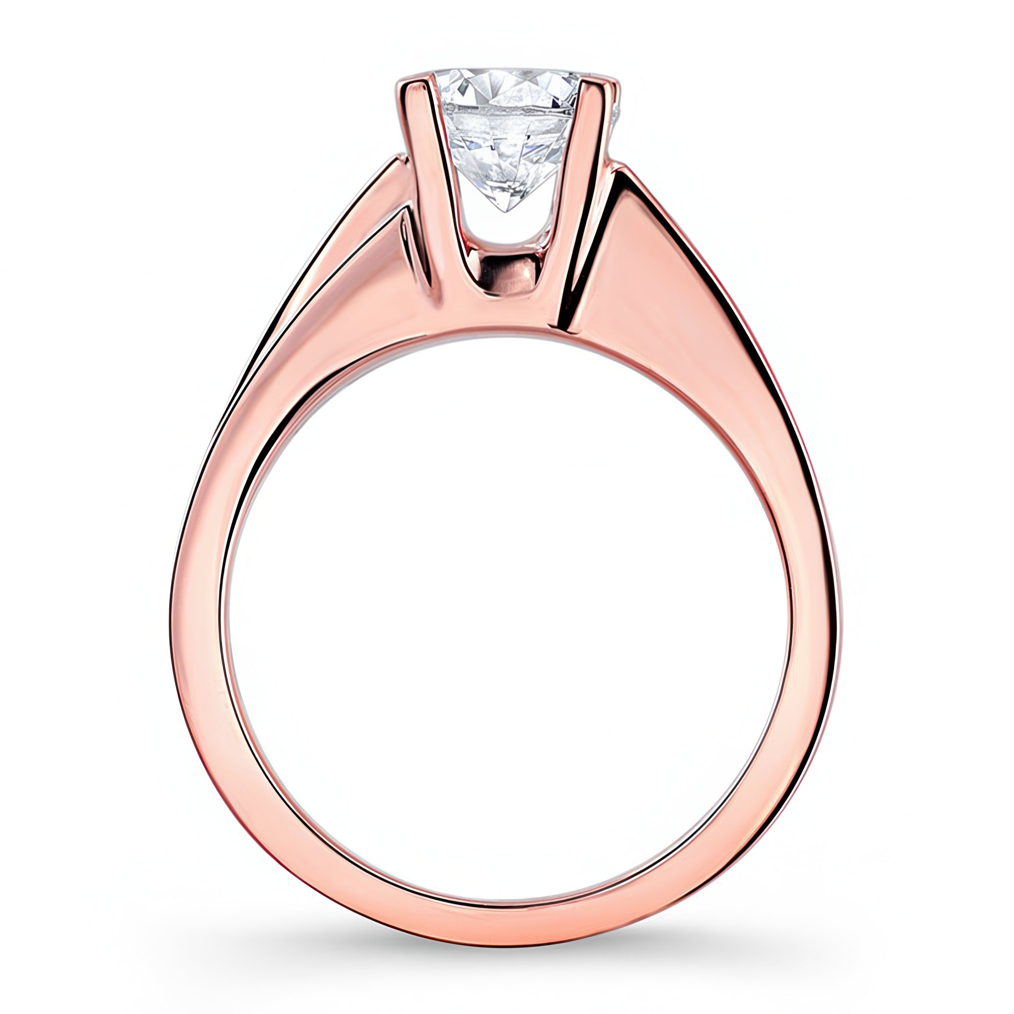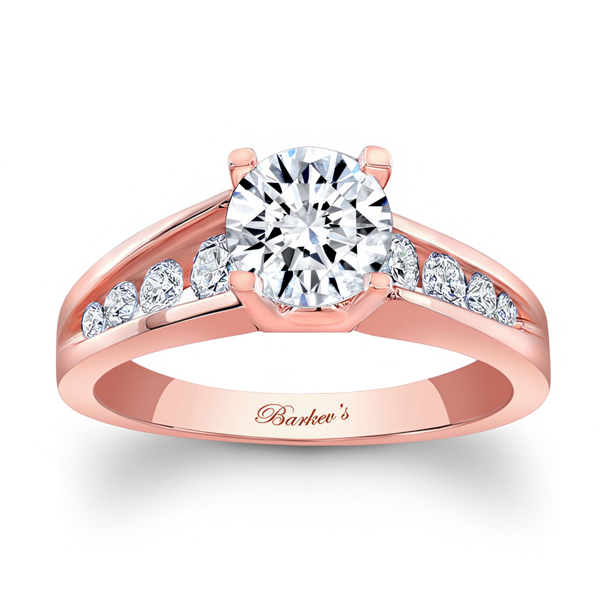 A simple channel band ring featuring a prong set round center and channel set diamonds gracing the varying width shoulders.