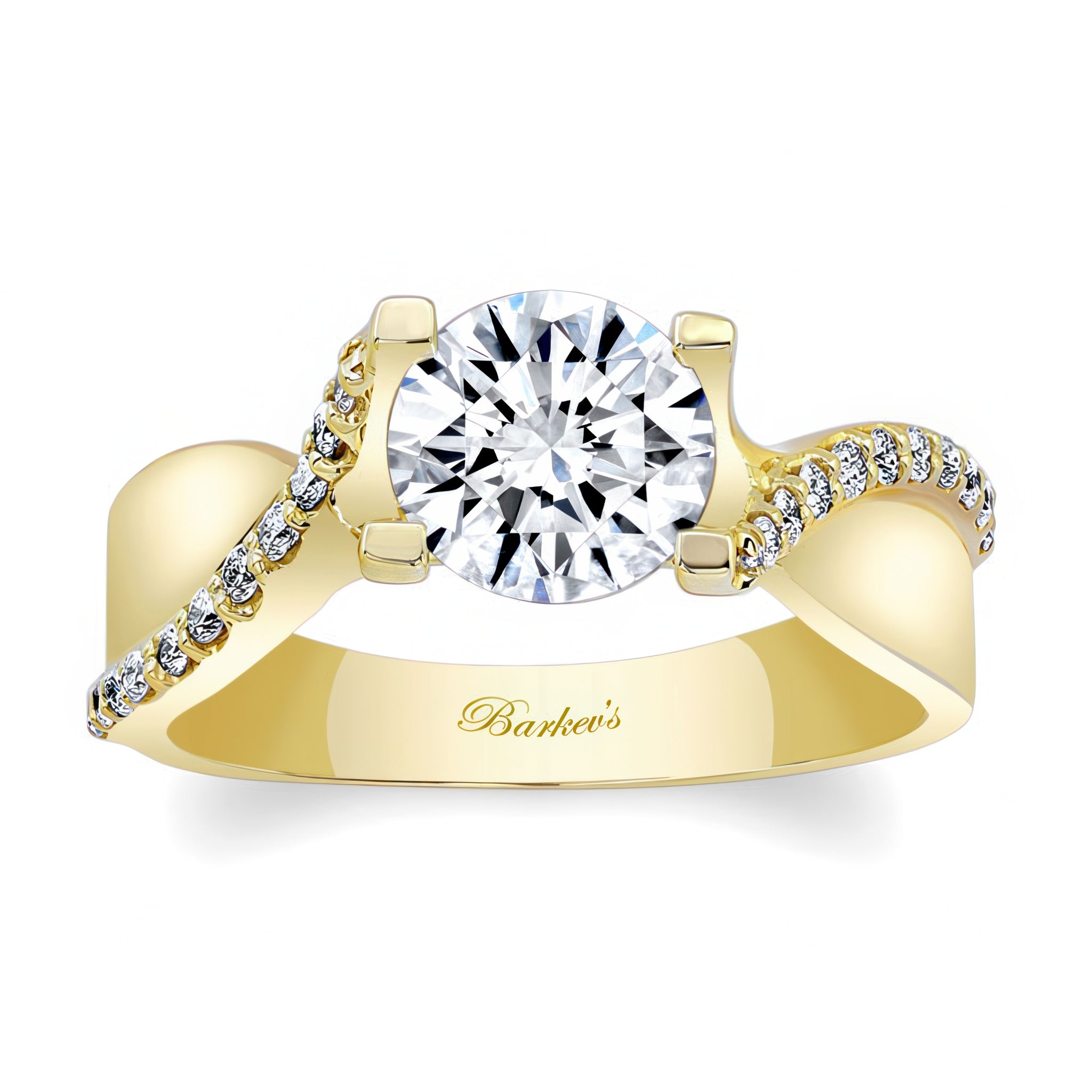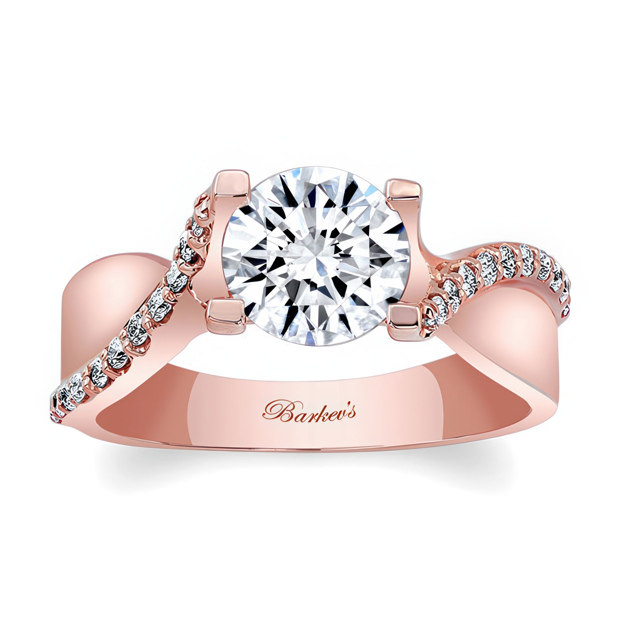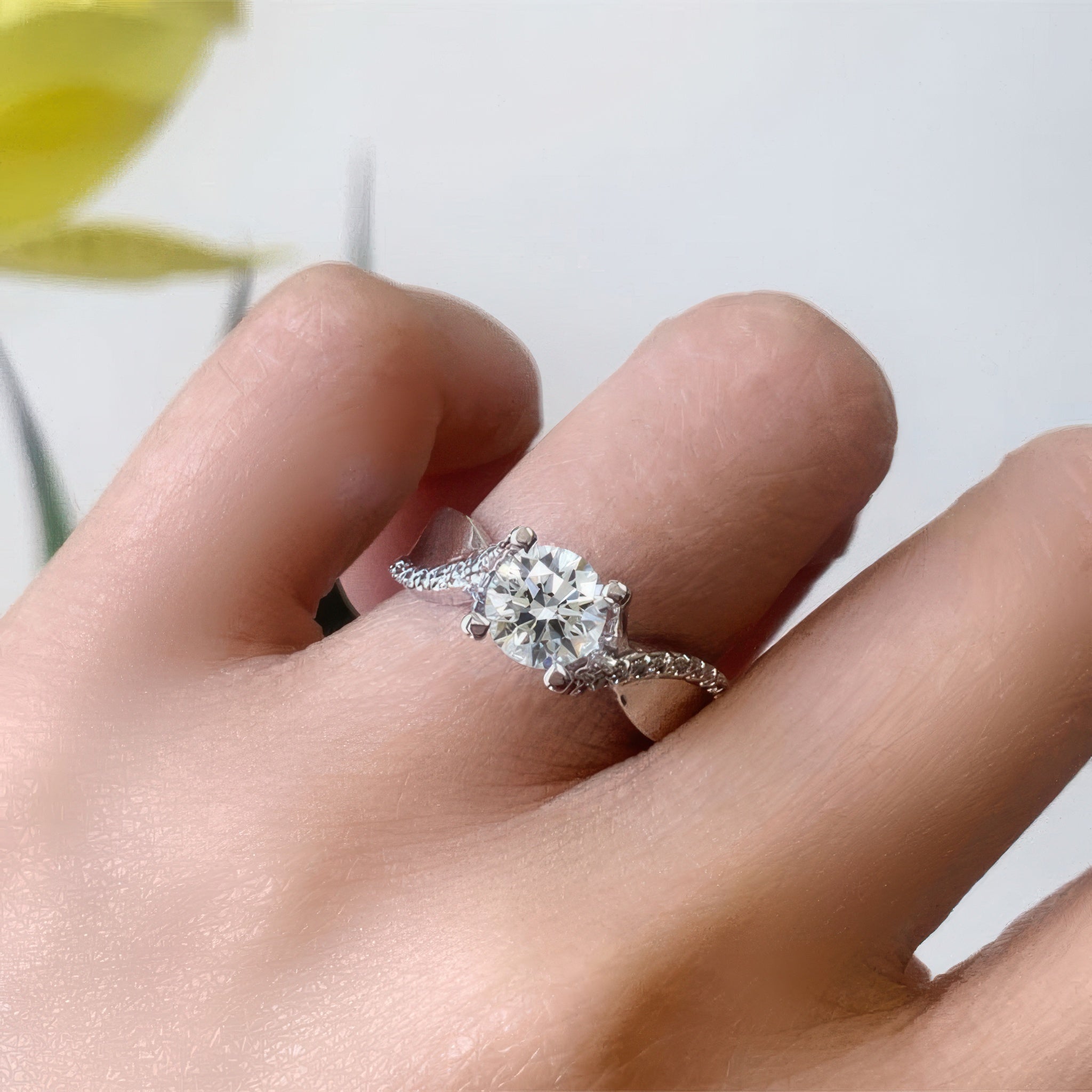 This criss cross band ring sports a round center with shared prong set diamonds on the shoulders for the ultimate in elegance.