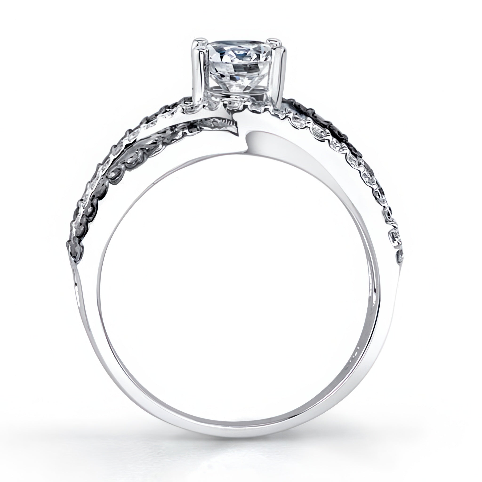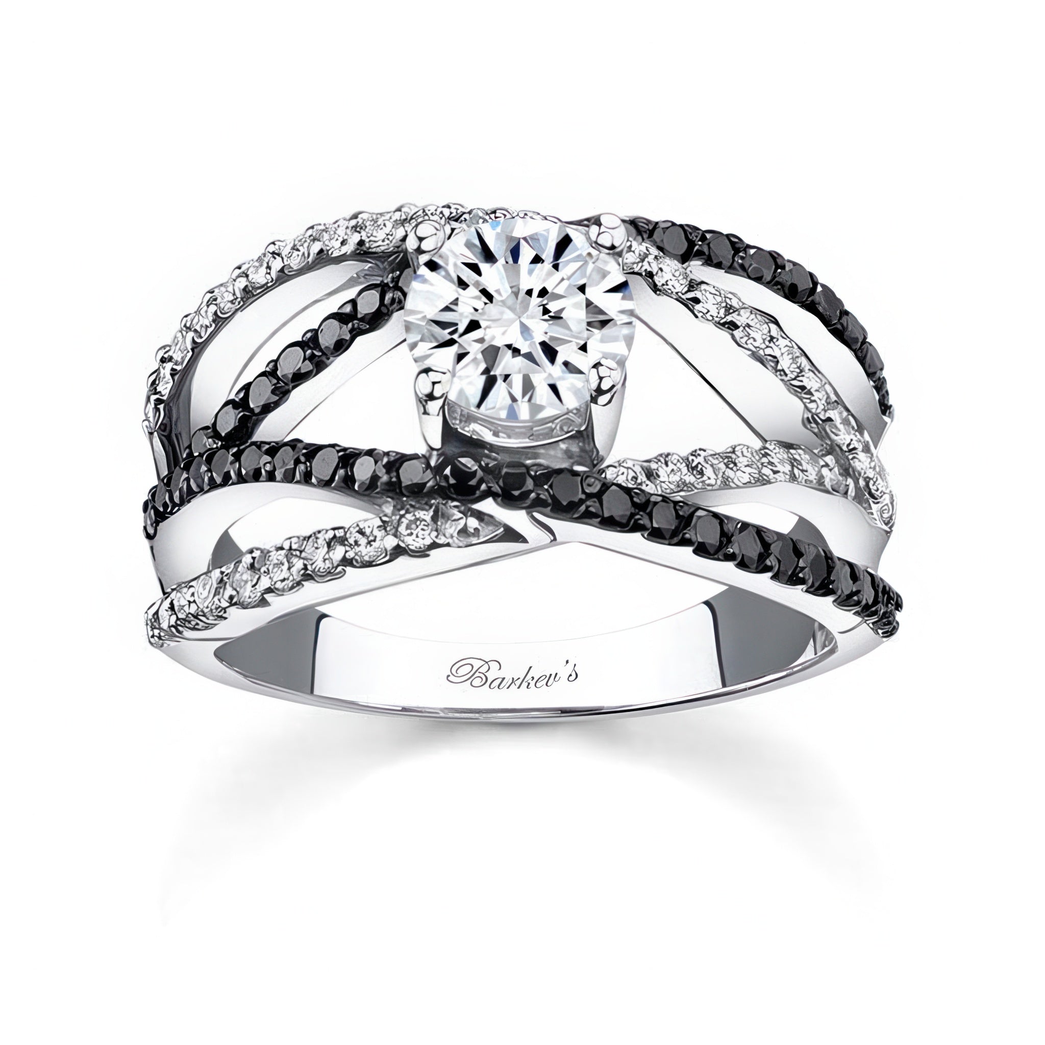 This unique criss cross black diamond accent ring features a prong set round center with a criss crossing shank adorned with black and white diamonds for a dramatic look that is nothing short of spectacular.