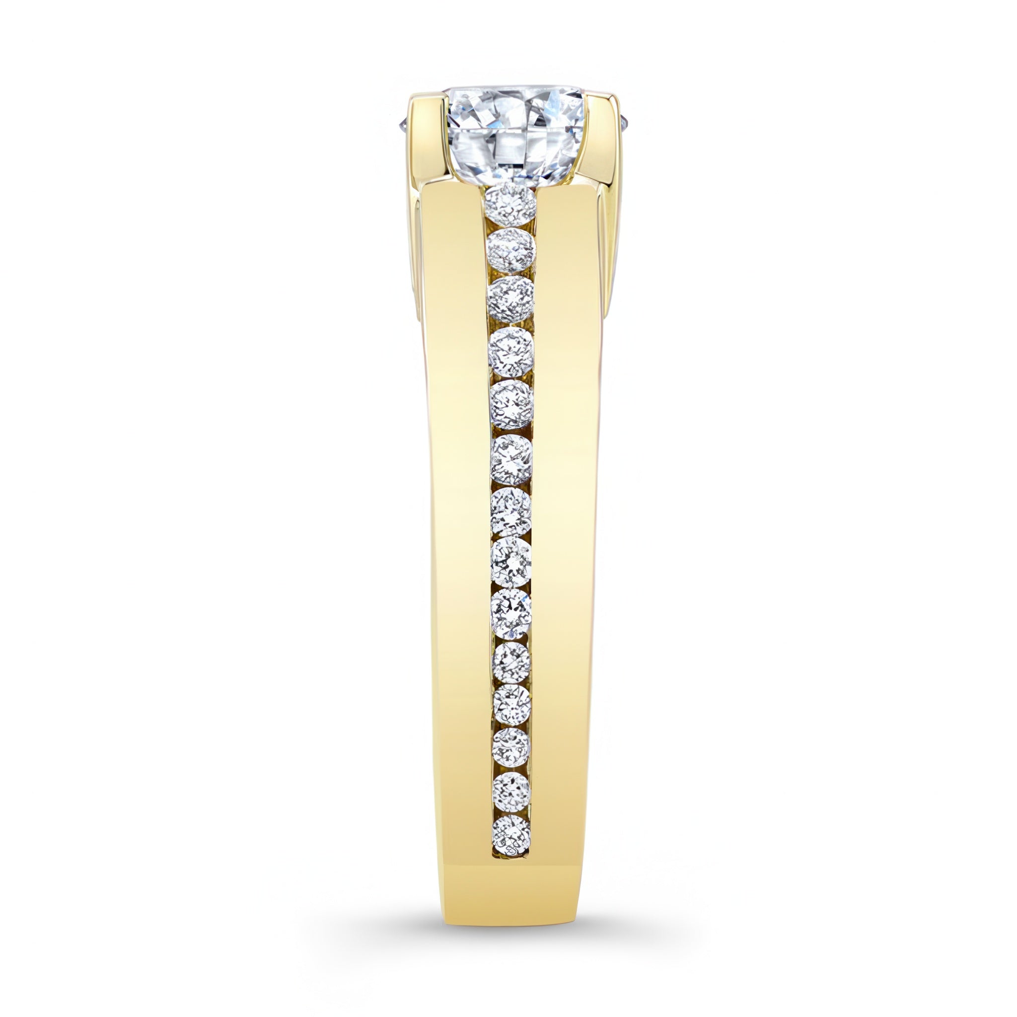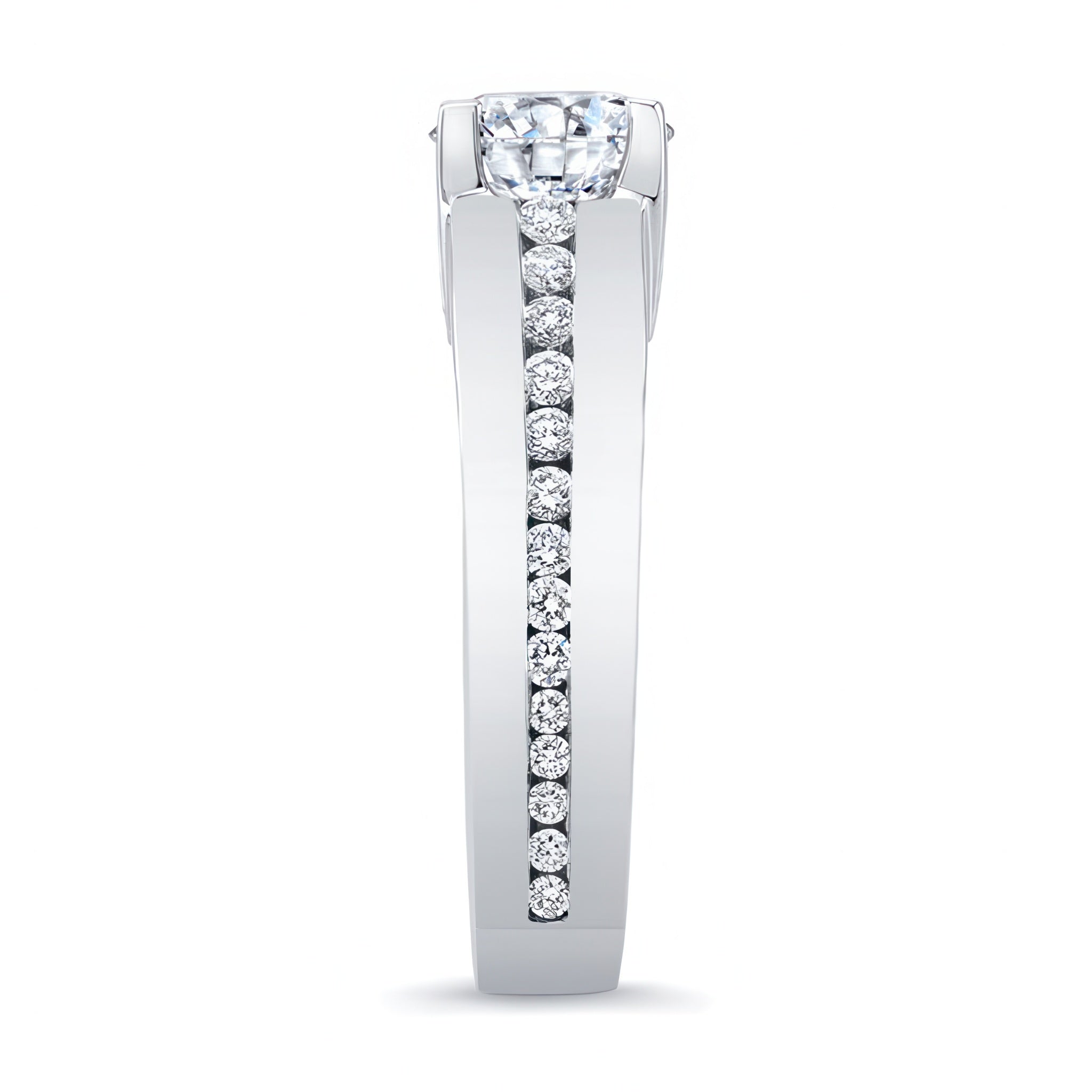 This beautiful graduated diamond ring features a prong set round center with channel set diamonds adorning the shank while gracefully graduating in size for a look that's nothing short of stunning.