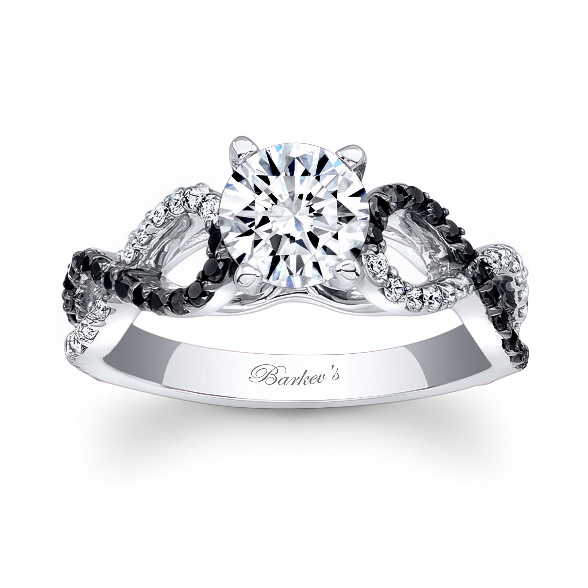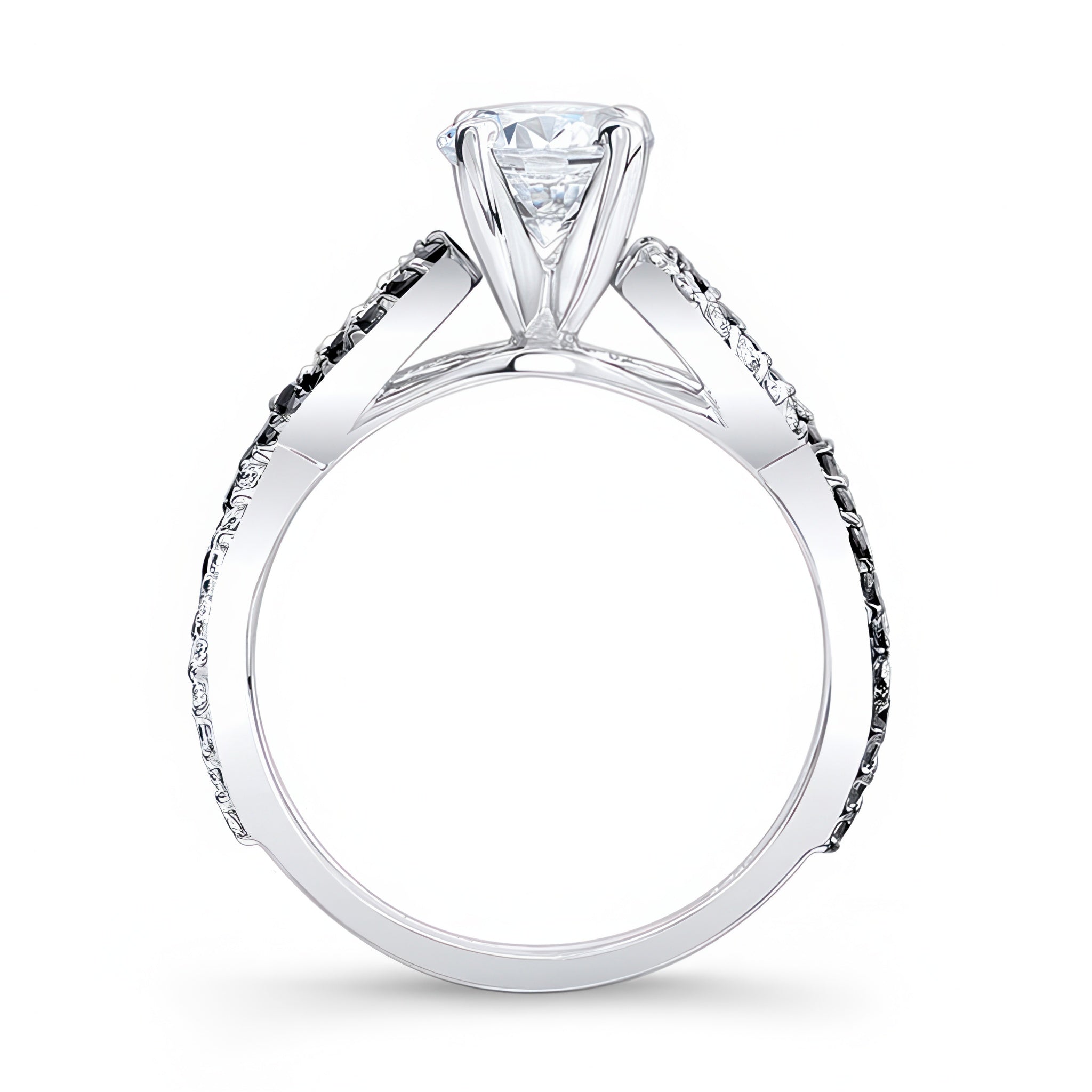 This infinity black and white diamond ring features a prong set round center with an artfully curving cathedral shank that crisscrosses down the shoulders adorned with shared prong set black and white diamonds for a glamorous look sure to be treasured.