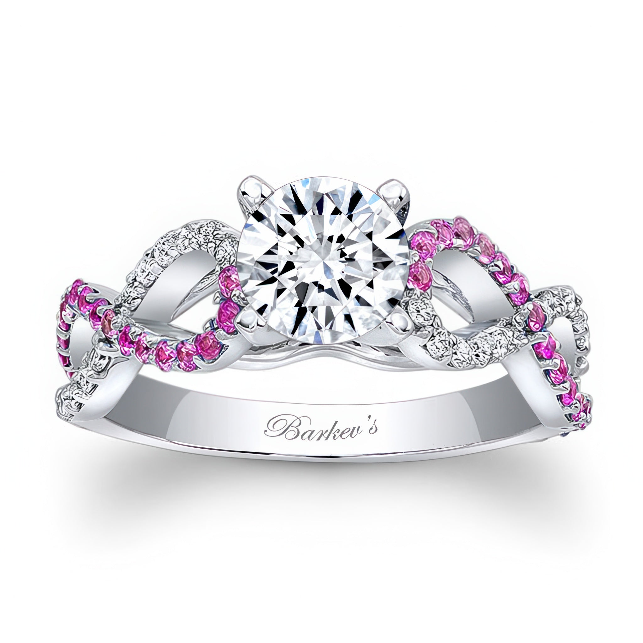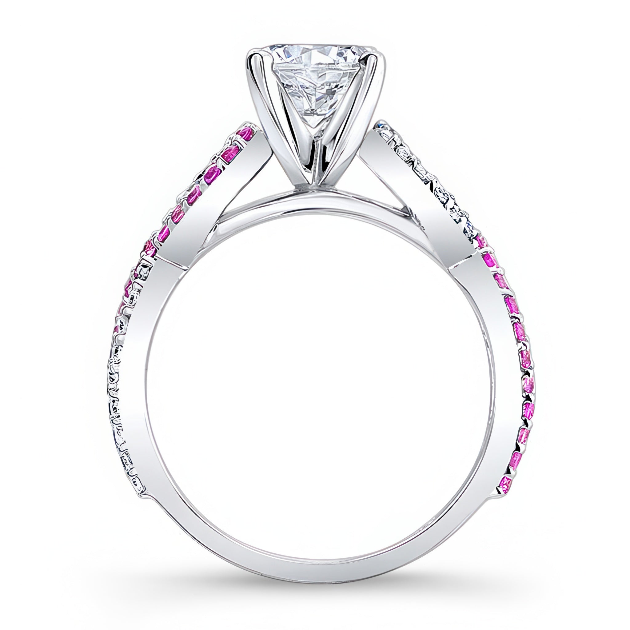 This pink sapphire and diamond infinity ring features a prong set round center with an artfully curving cathedral shank that crisscrosses down the shoulders adorned with shared prong set diamonds and pink sapphires for a glamorous look sure to be treasured.