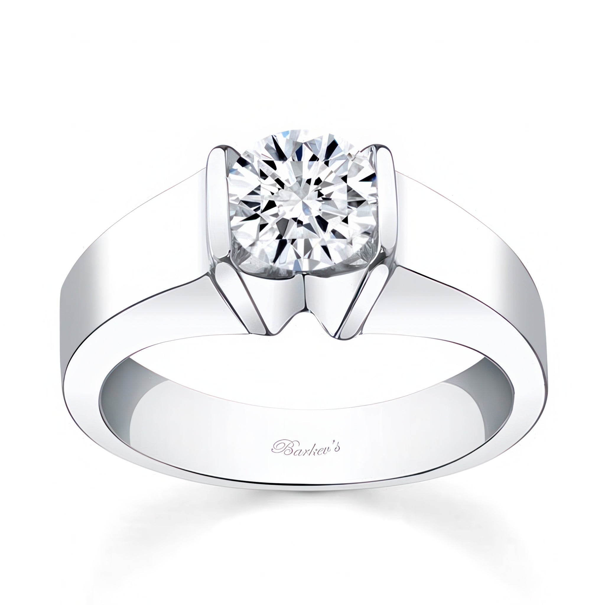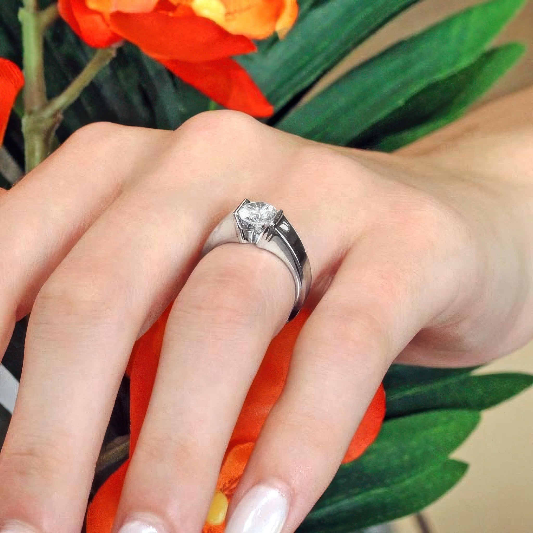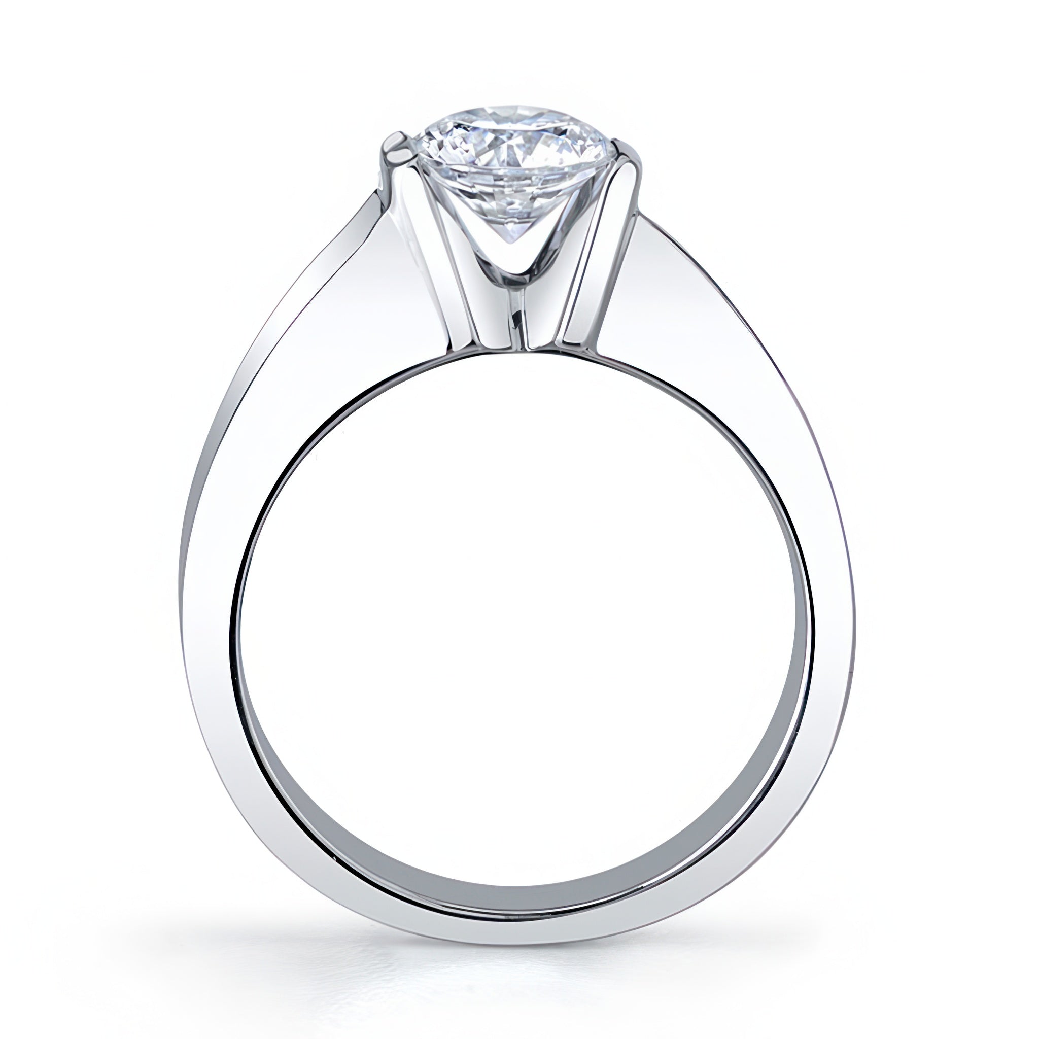 This round cut solitaire diamond ring features a channel set round center with bold lines and a contemporary style.
