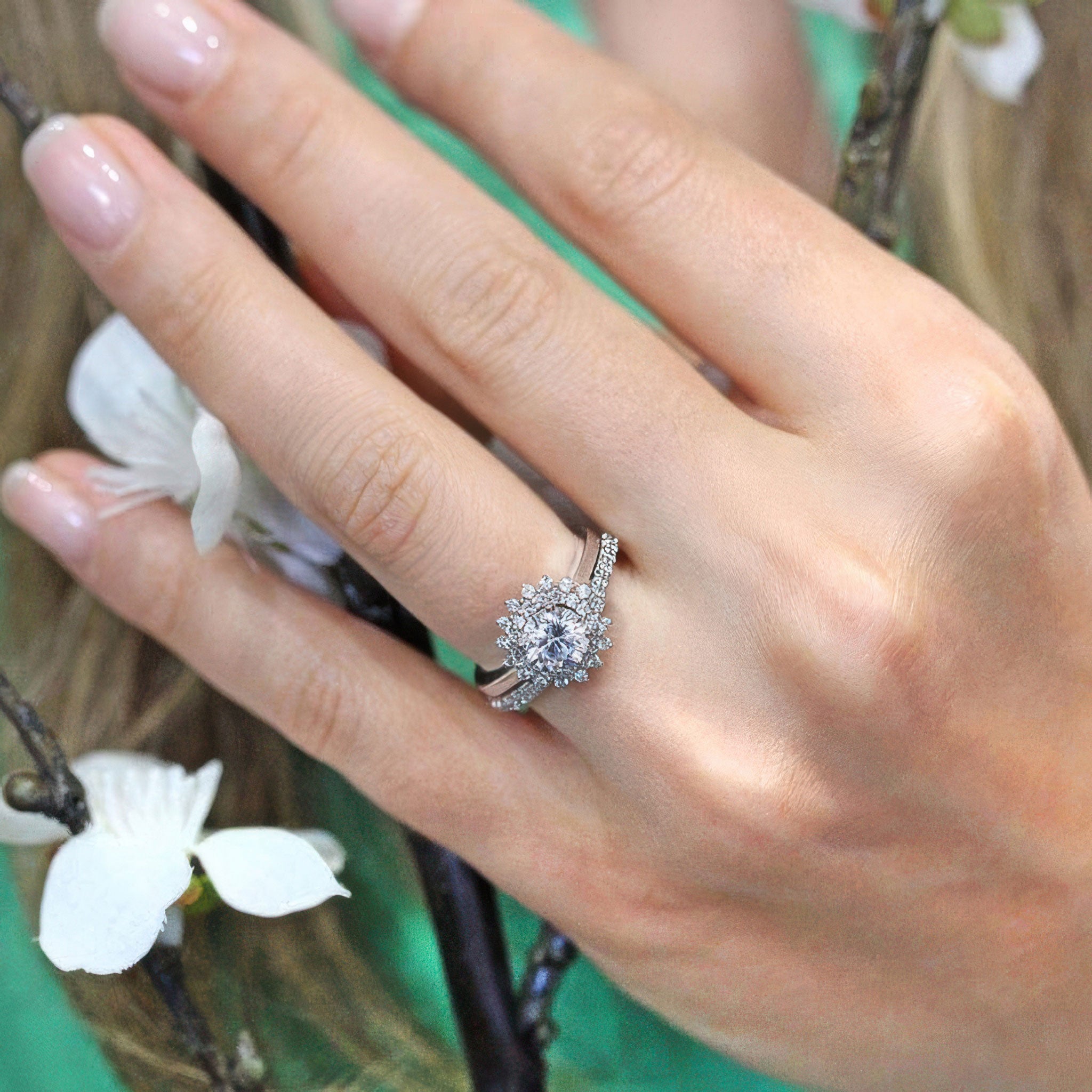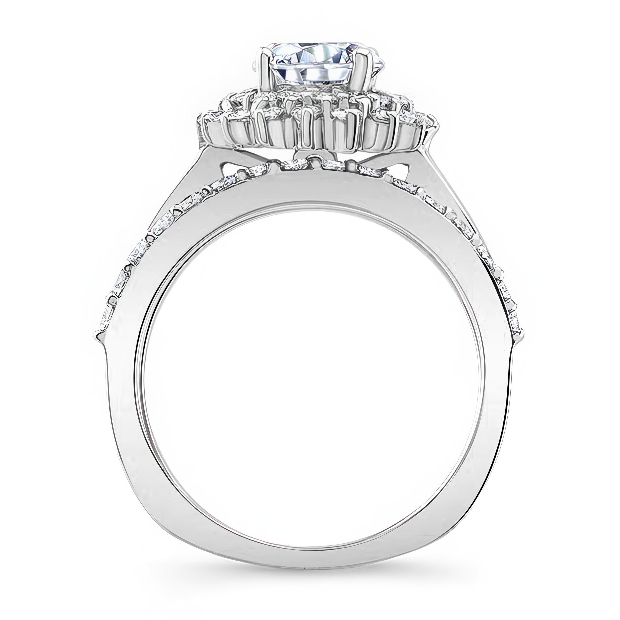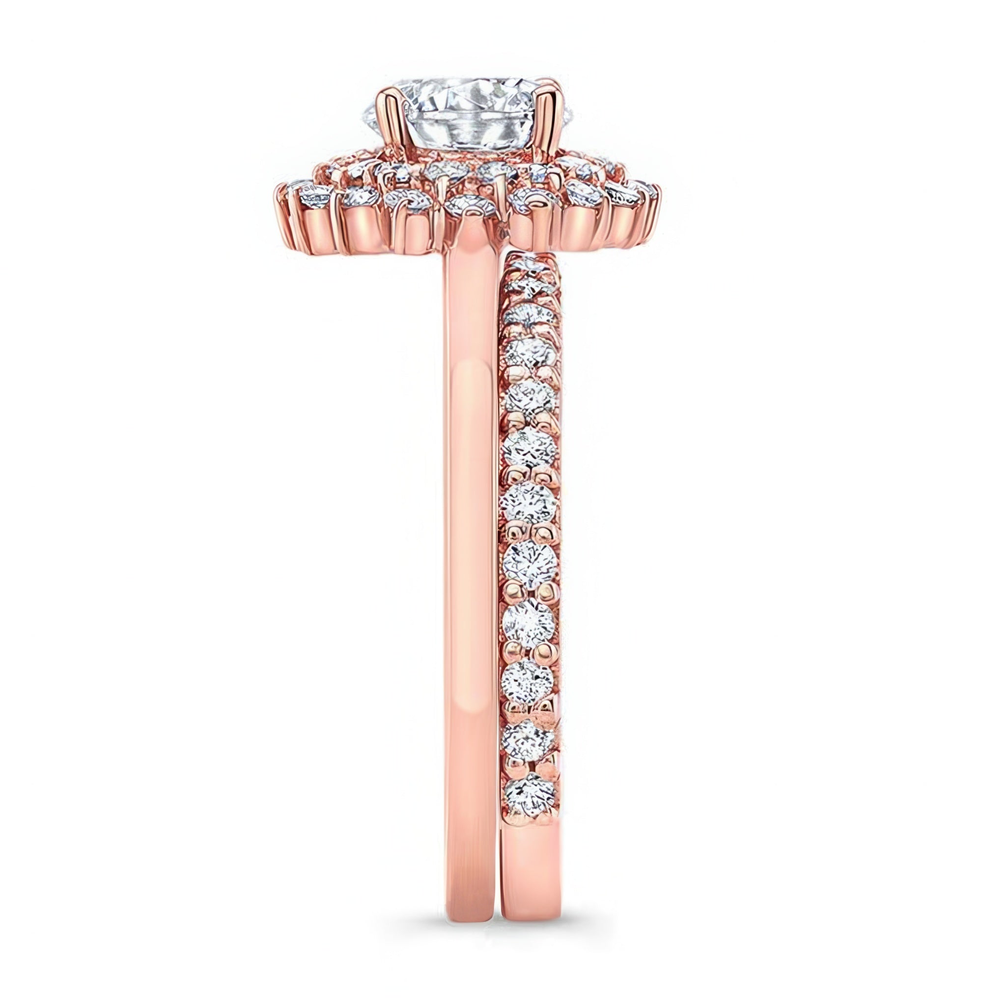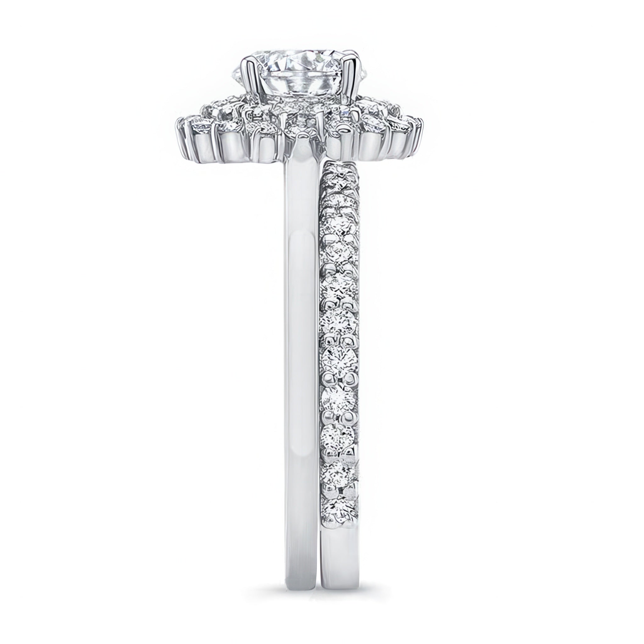 An exquisite starburst bridal set featuring an engagement ring with a prong set round center encircled with two diamond halos with the outer one giving the illusion of a burst pattern. The final touch is visible on the profile view with a dainty polished shank featuring a simple motif design. A shared prong set wedding band snuggles up close on the side for a stunning look.