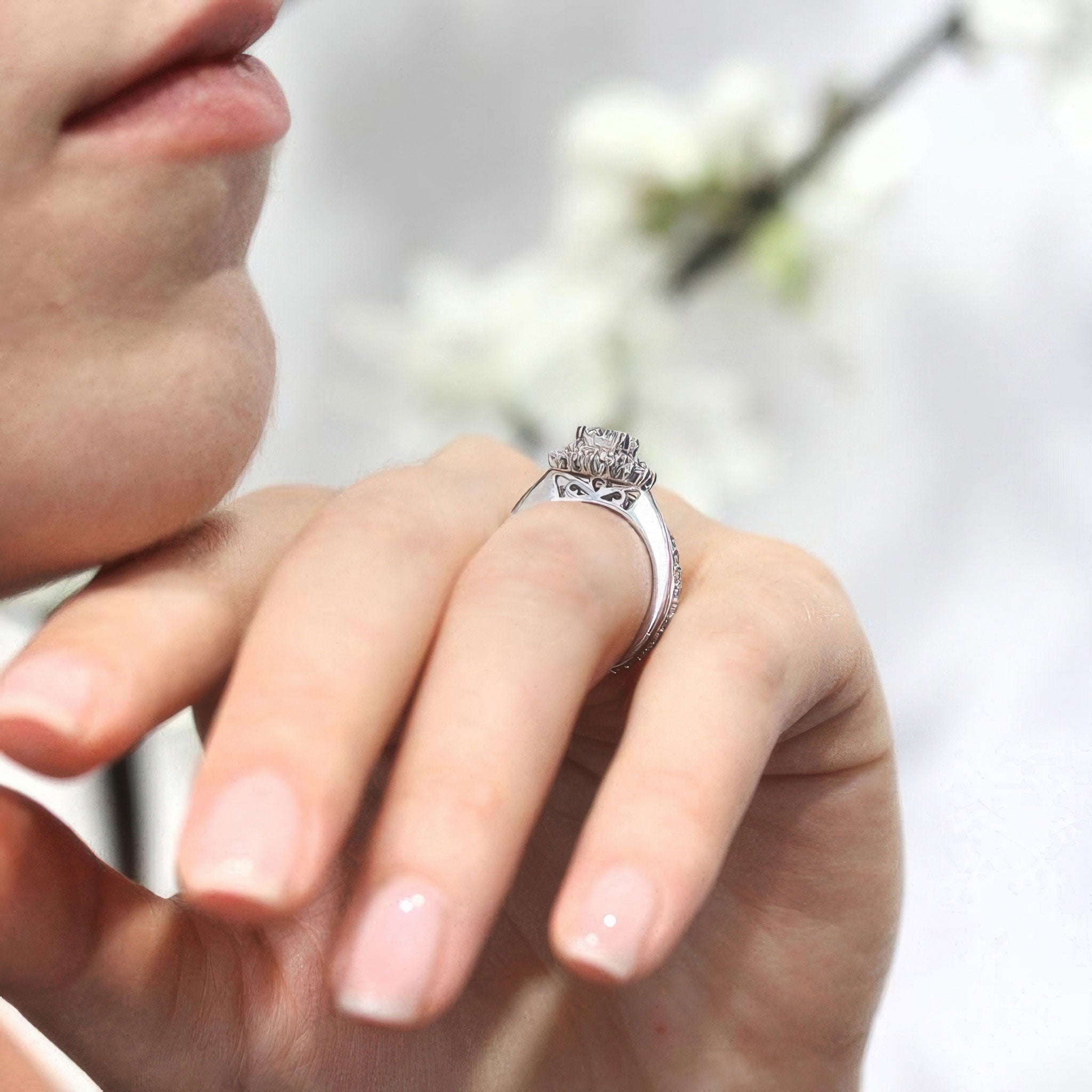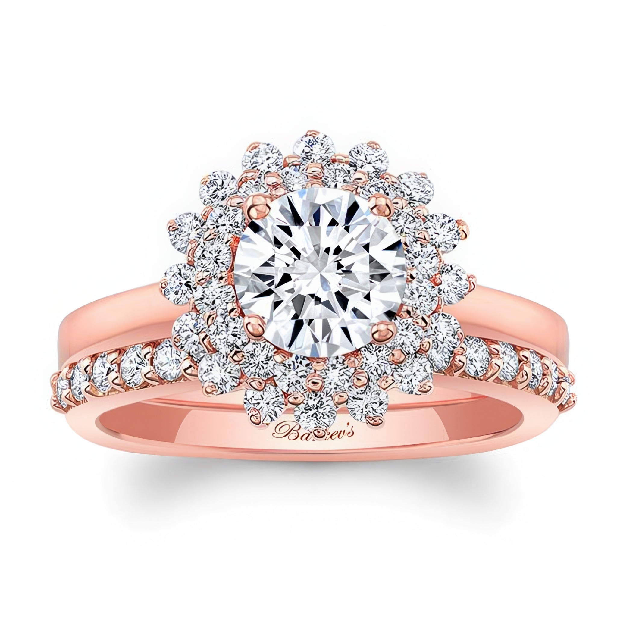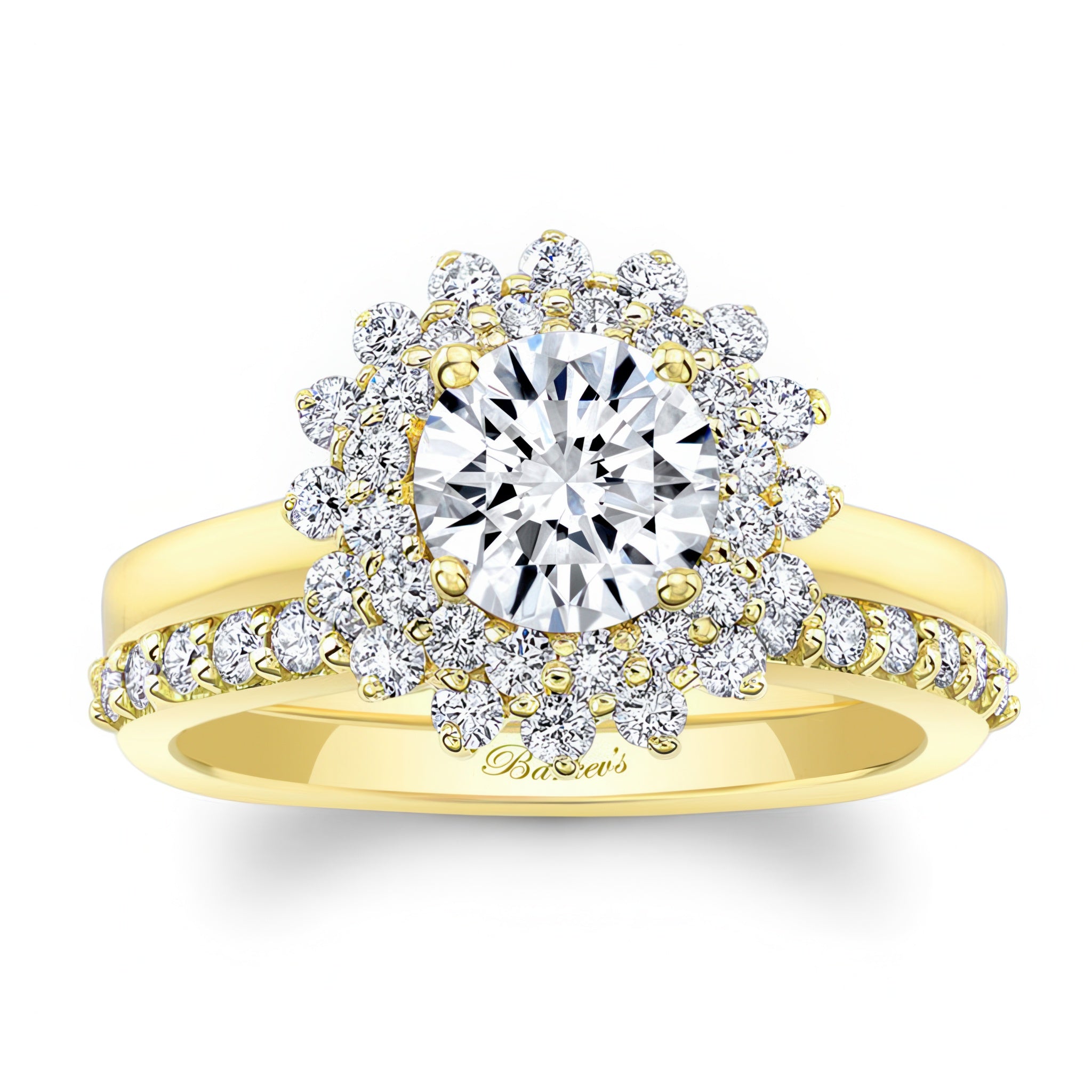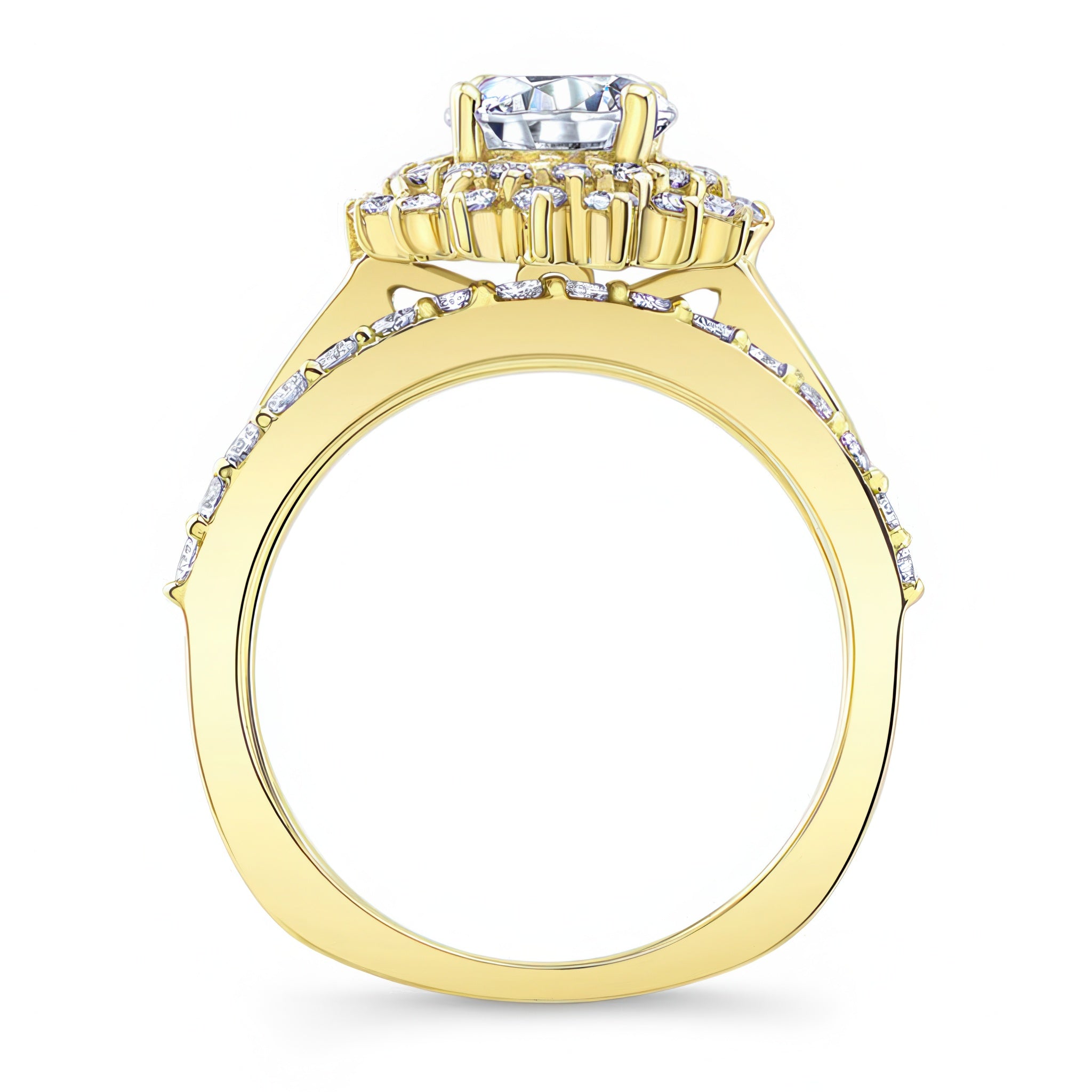 An exquisite starburst bridal set featuring an engagement ring with a prong set round center encircled with two diamond halos with the outer one giving the illusion of a burst pattern. The final touch is visible on the profile view with a dainty polished shank featuring a simple motif design. A shared prong set wedding band snuggles up close on the side for a stunning look.
