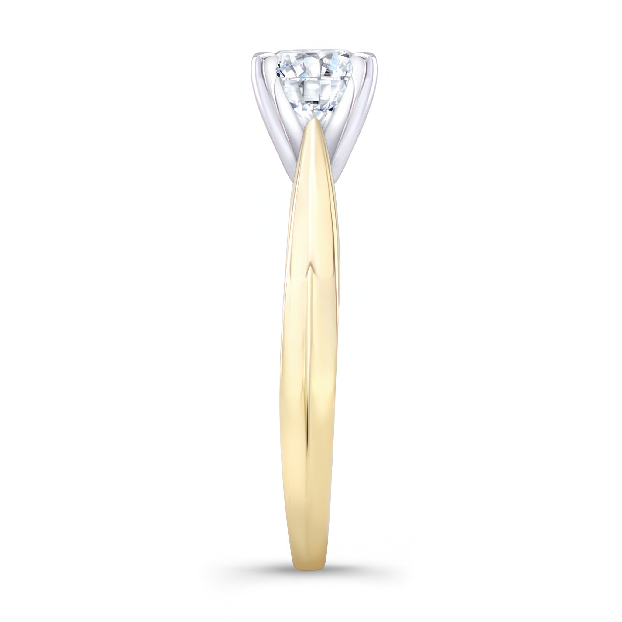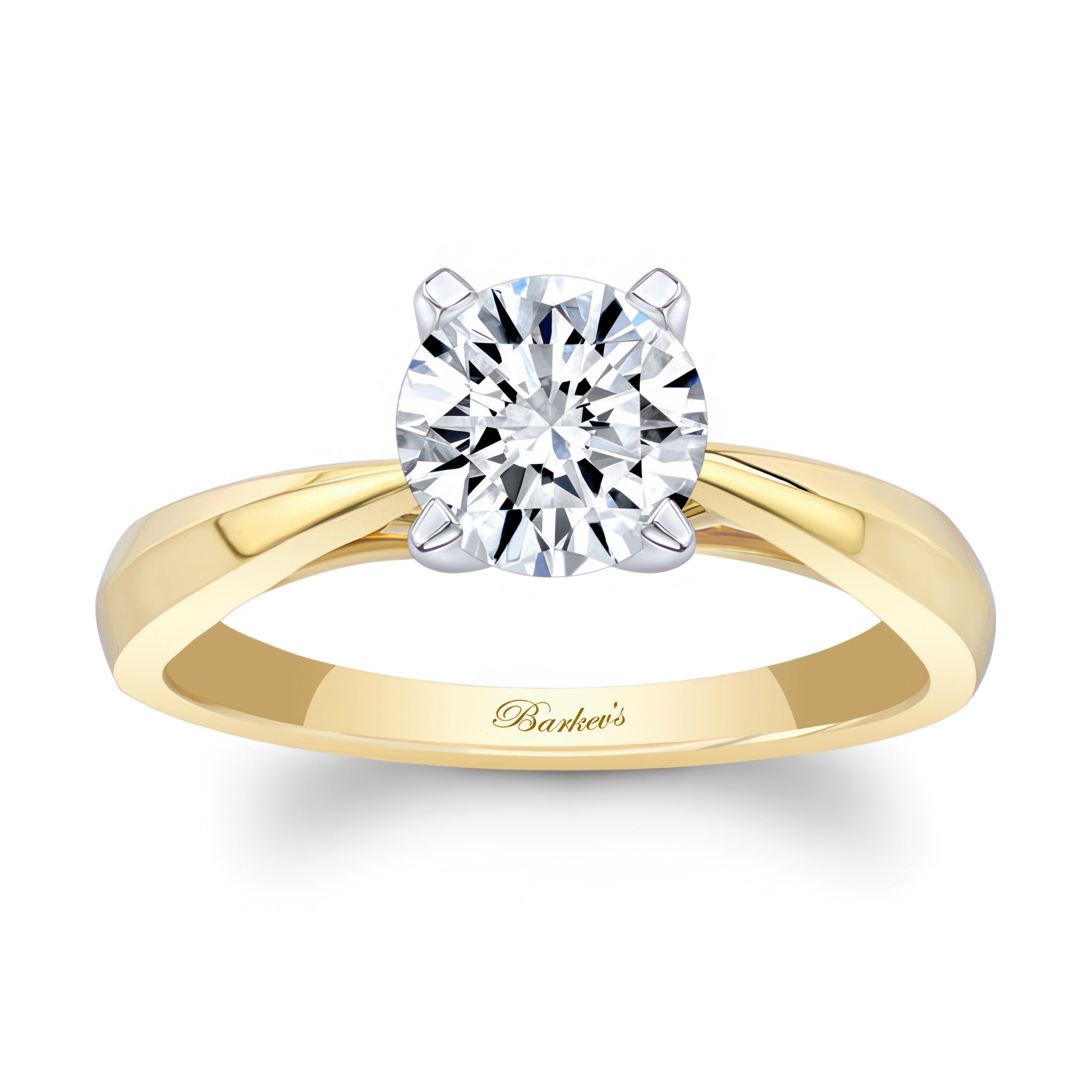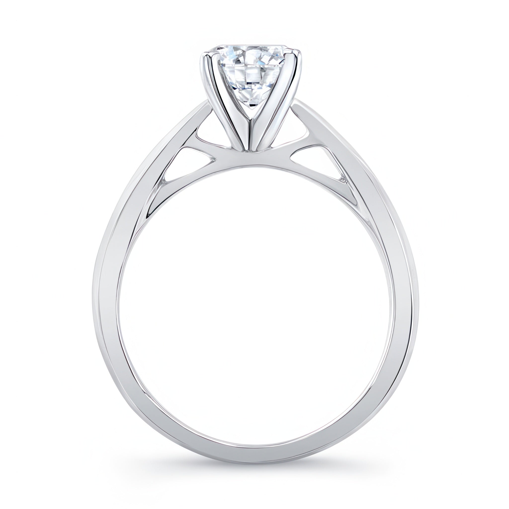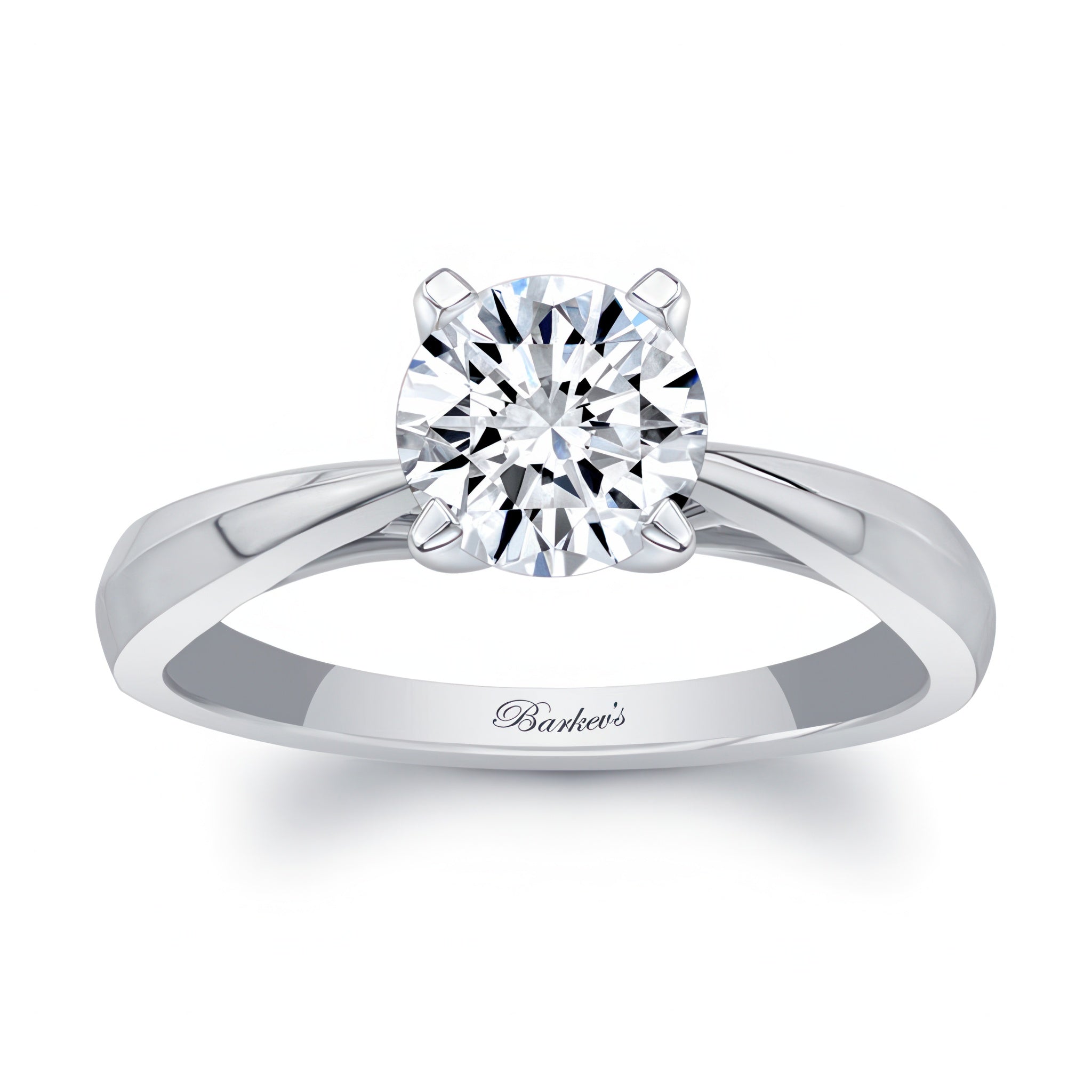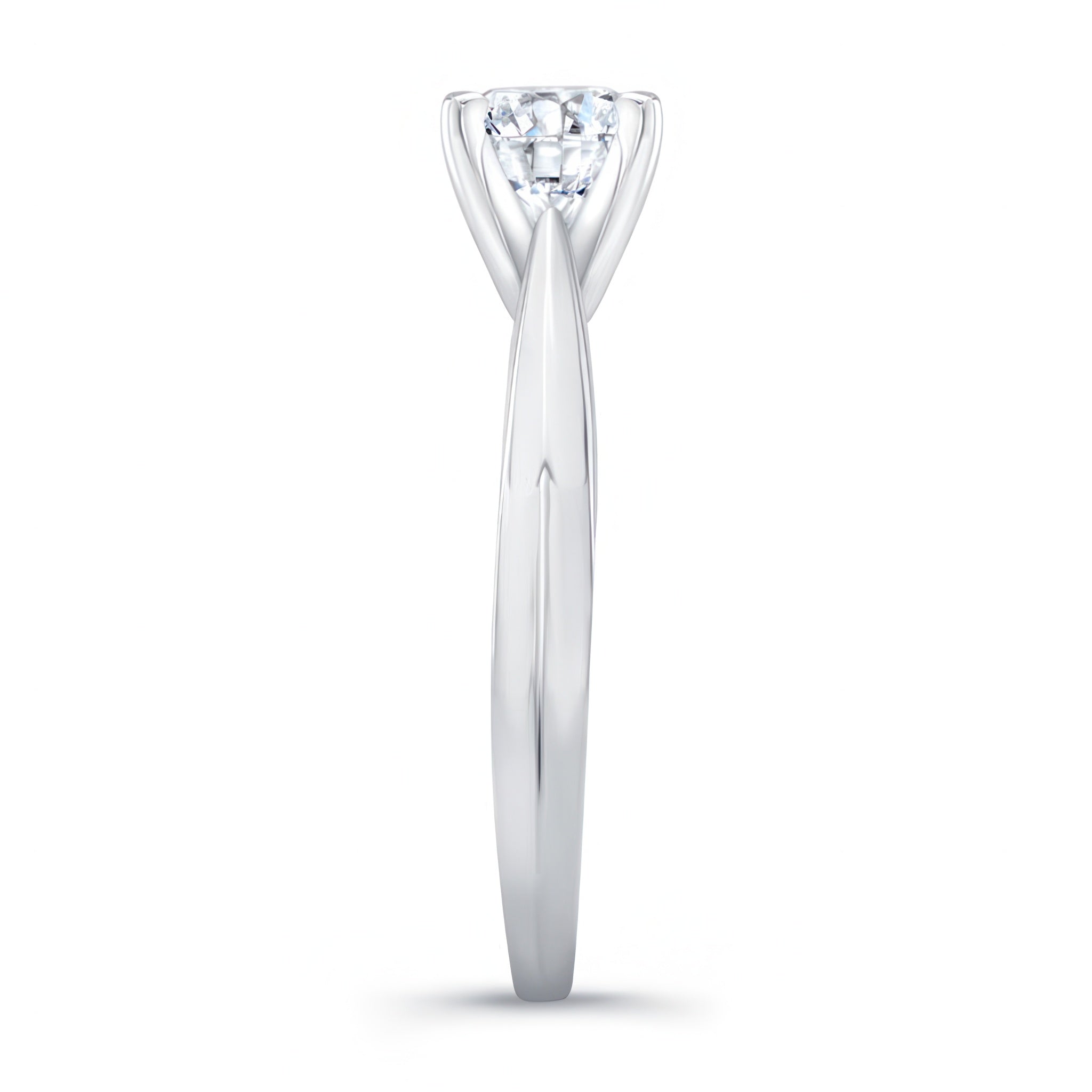 This tapered solitaire ring is graced with a delicately curved shank and a brilliant round center.