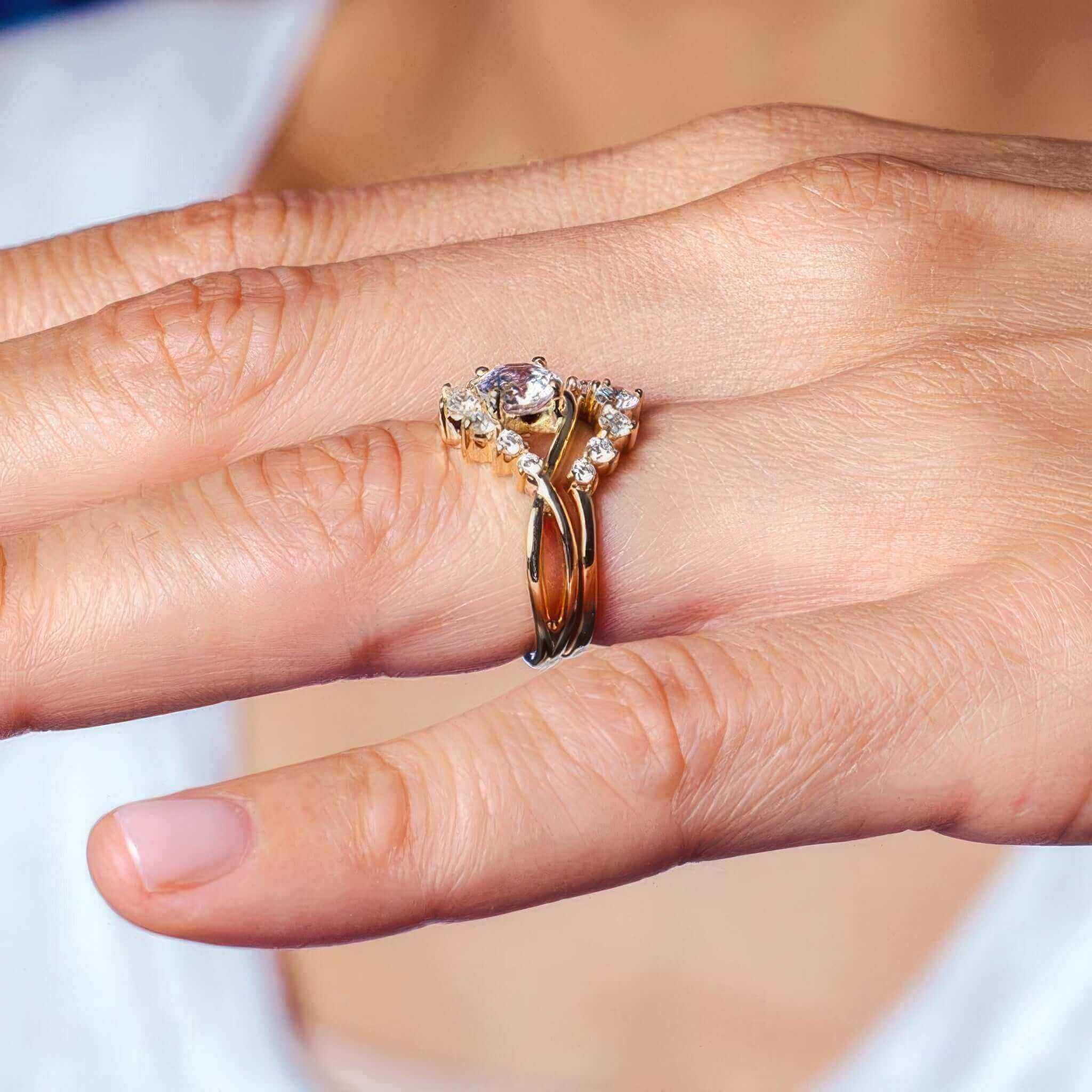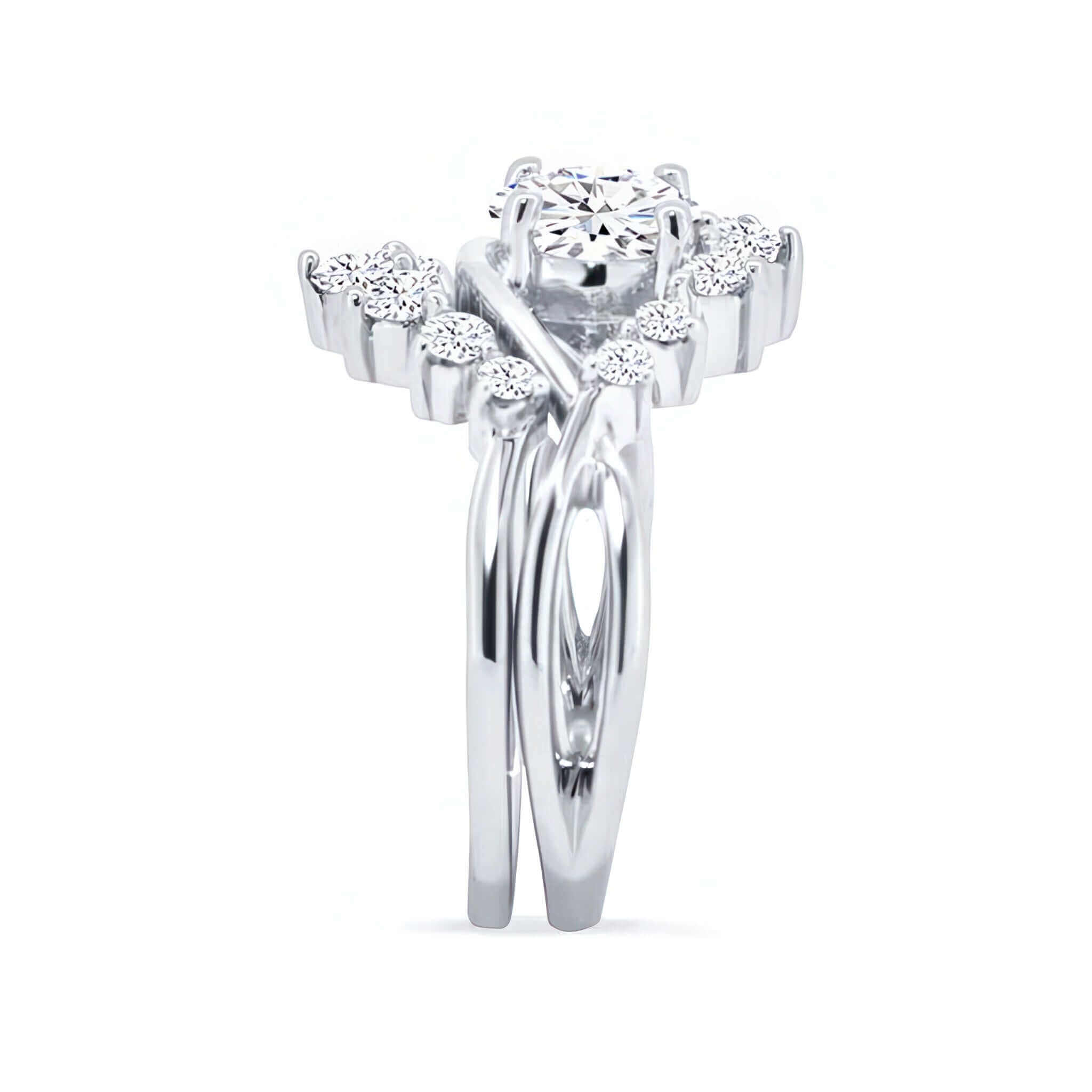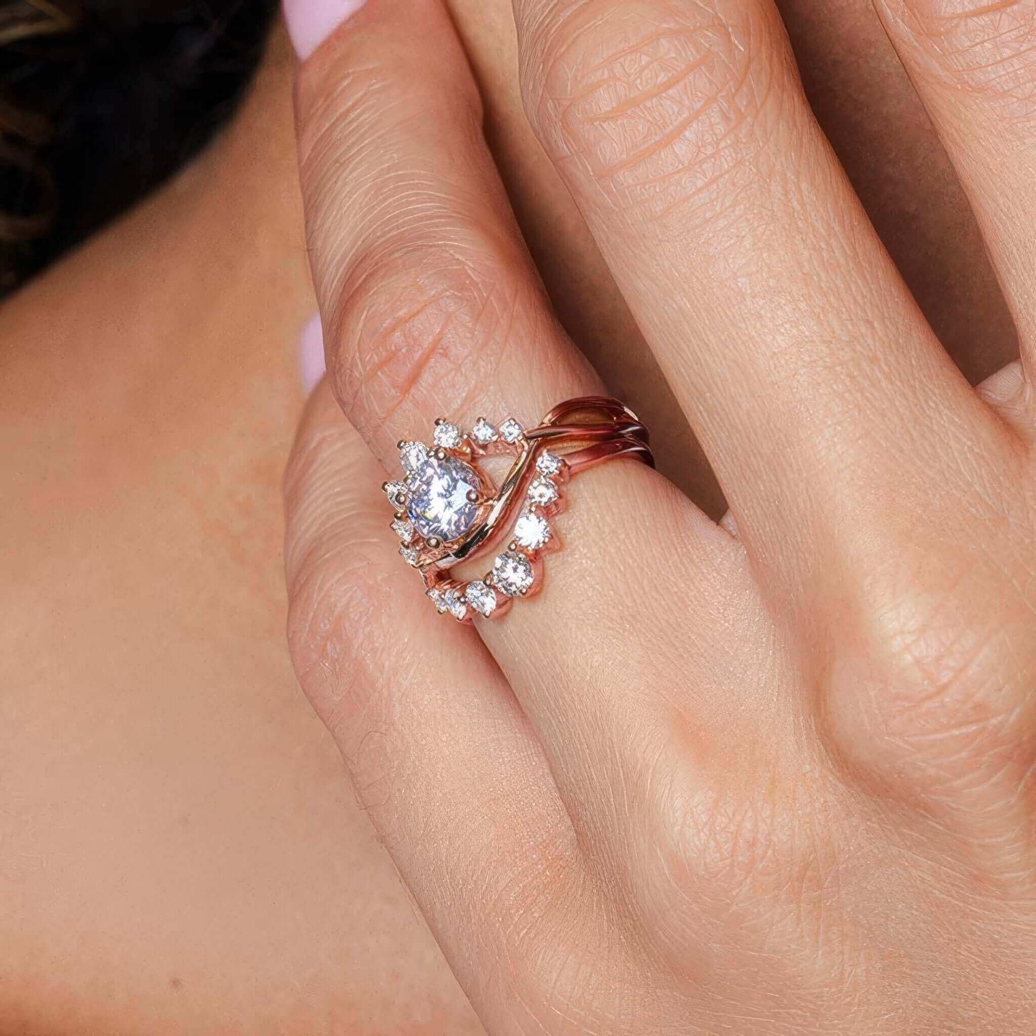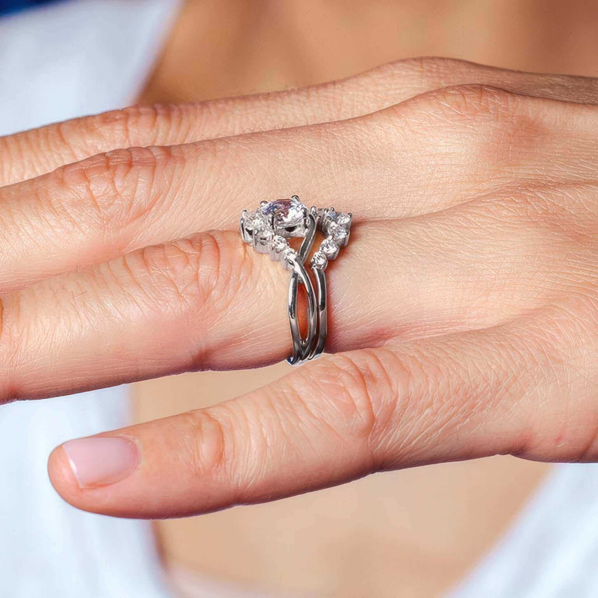 This unique wedding set grabs attention with a flare swirling on one side adorned with shared prong set diamonds and a round center stone. Comes with a matching diamond wedding band.