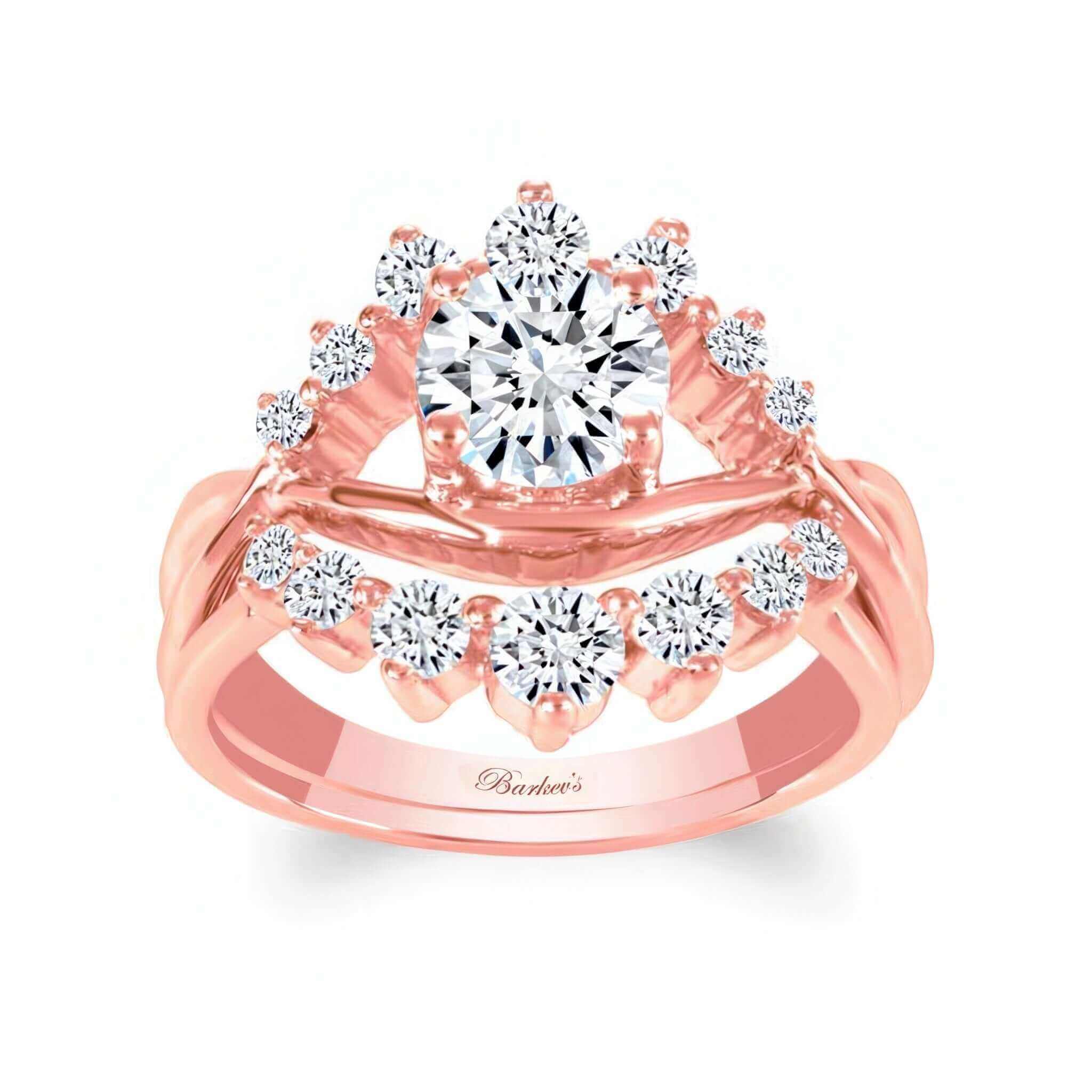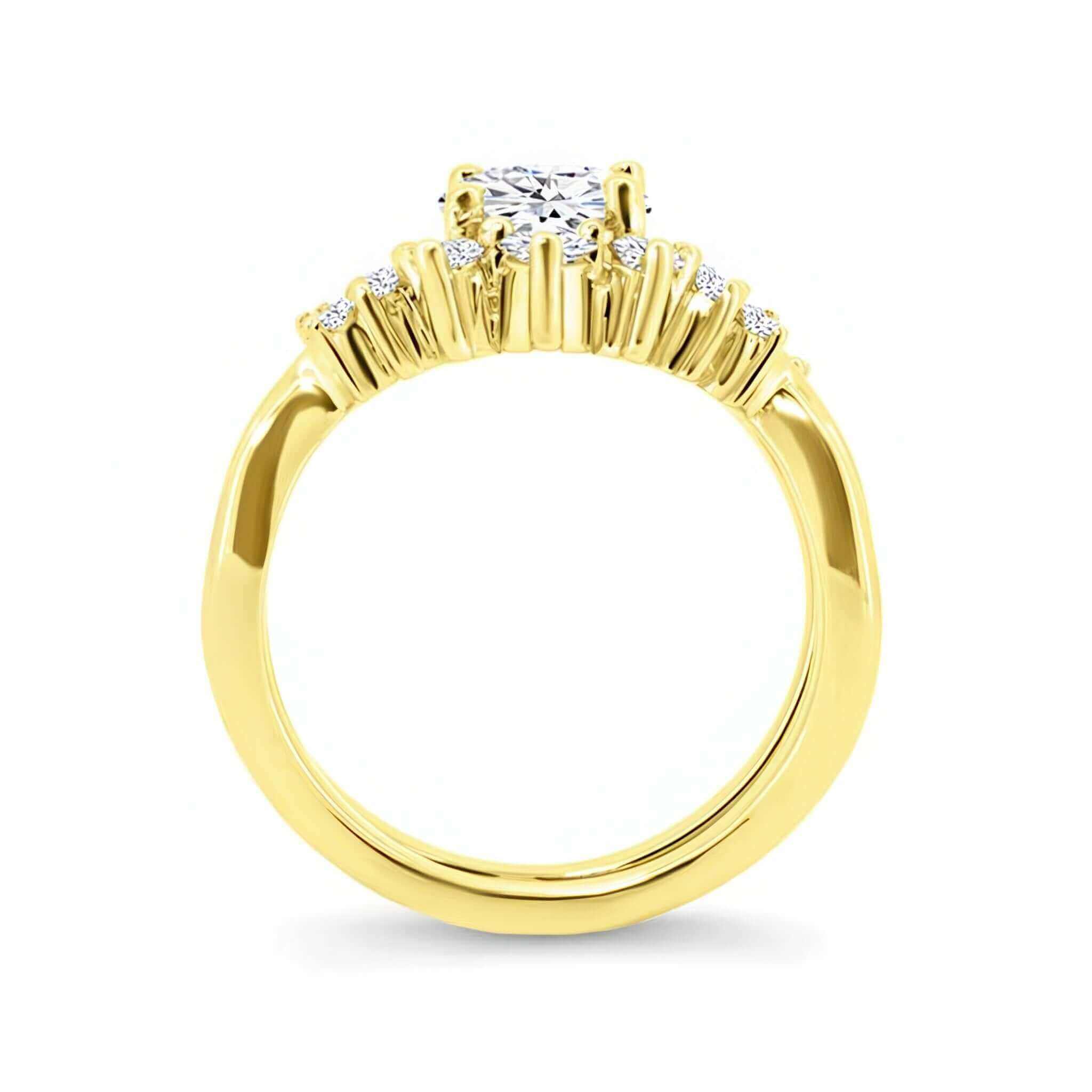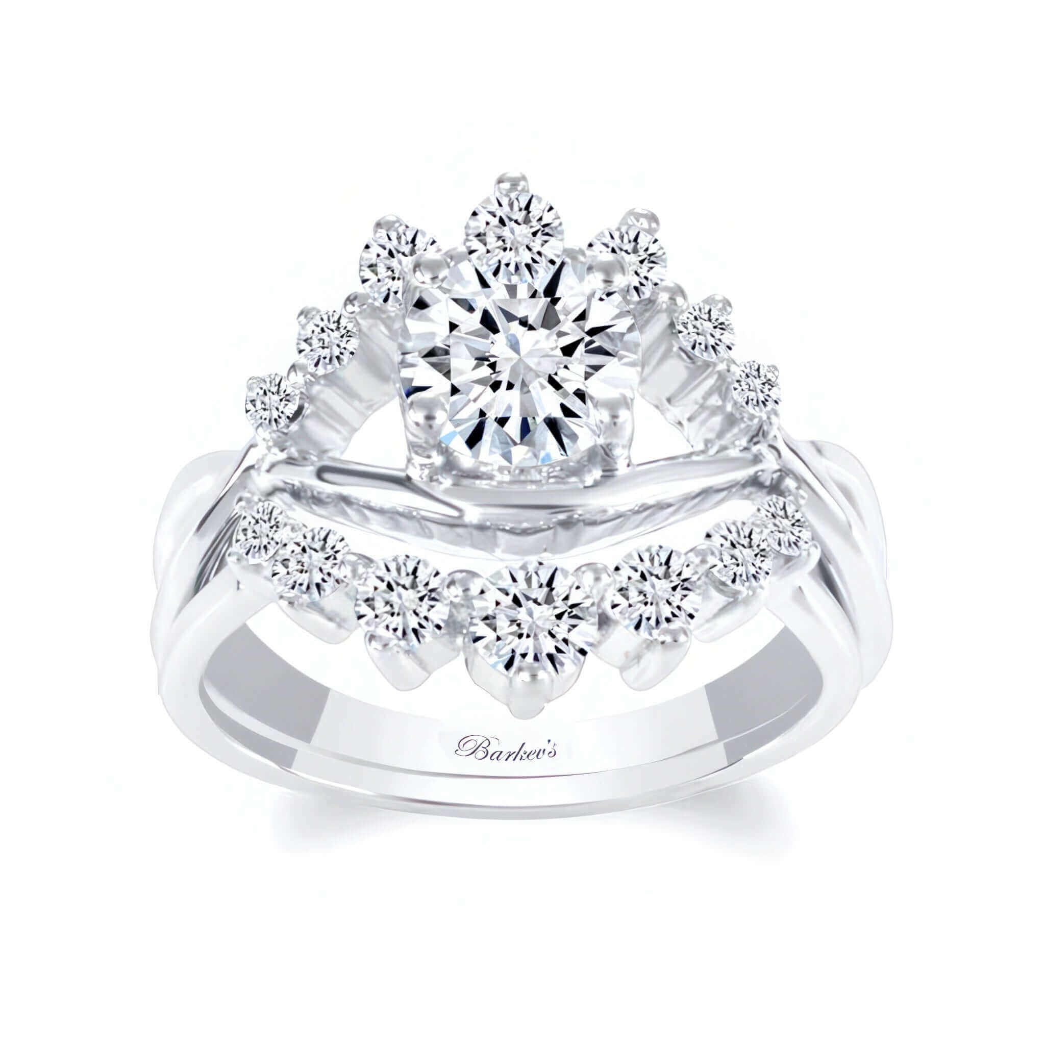 This unique wedding set grabs attention with a flare swirling on one side adorned with shared prong set diamonds and a round center stone. Comes with a matching diamond wedding band.