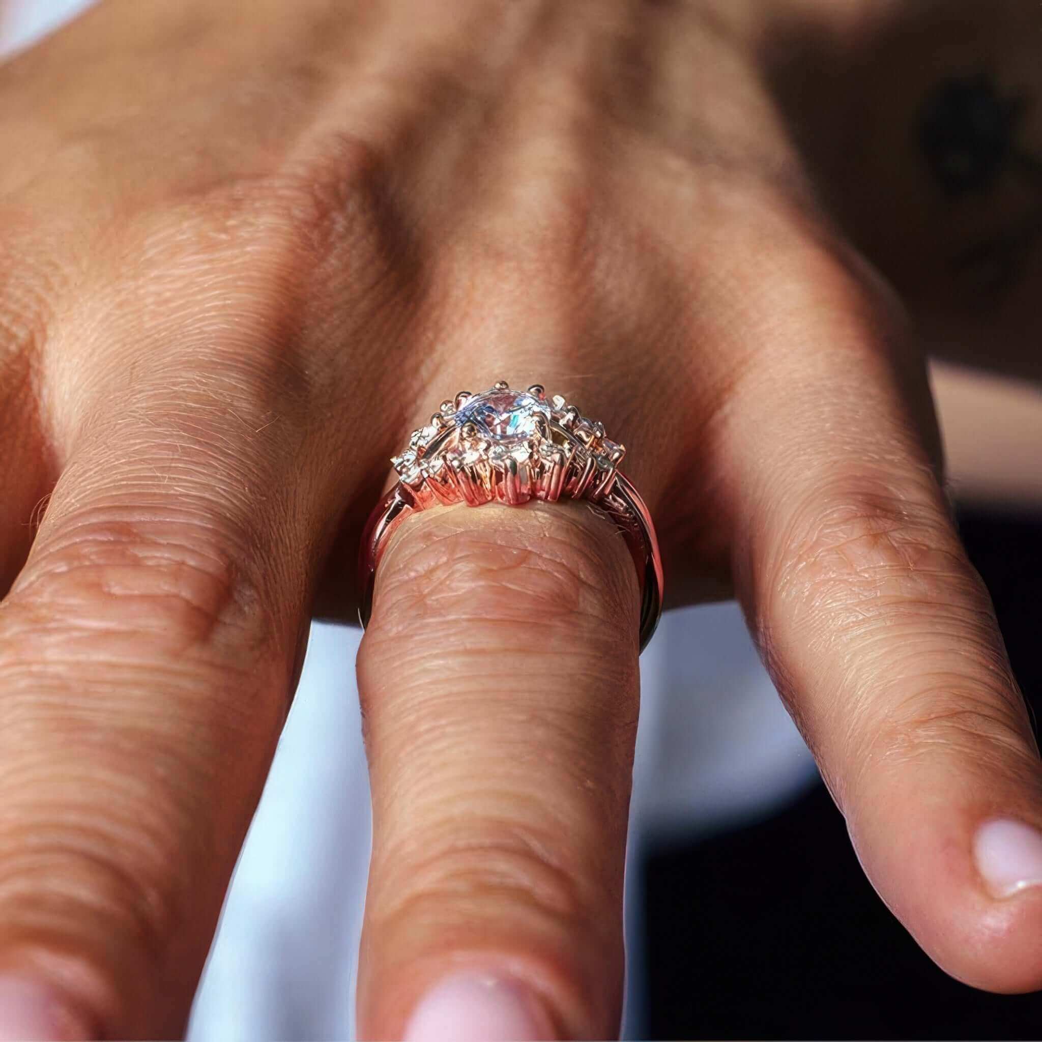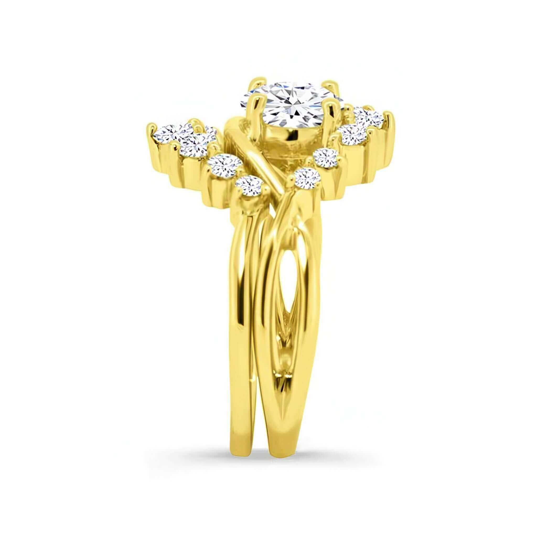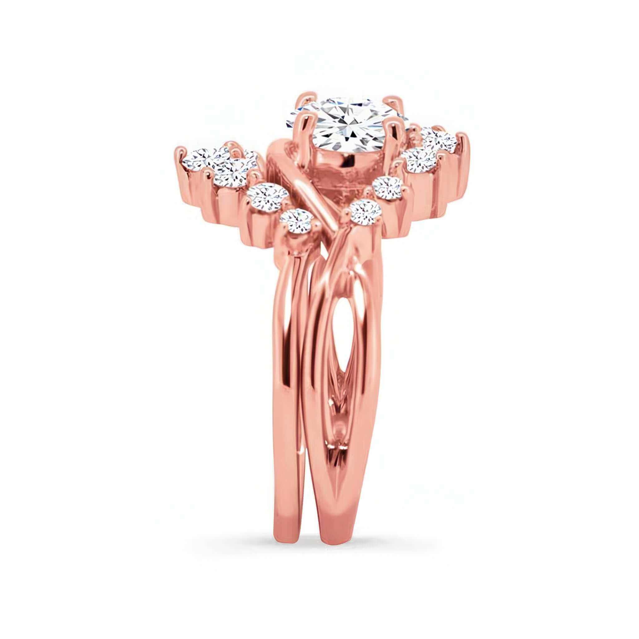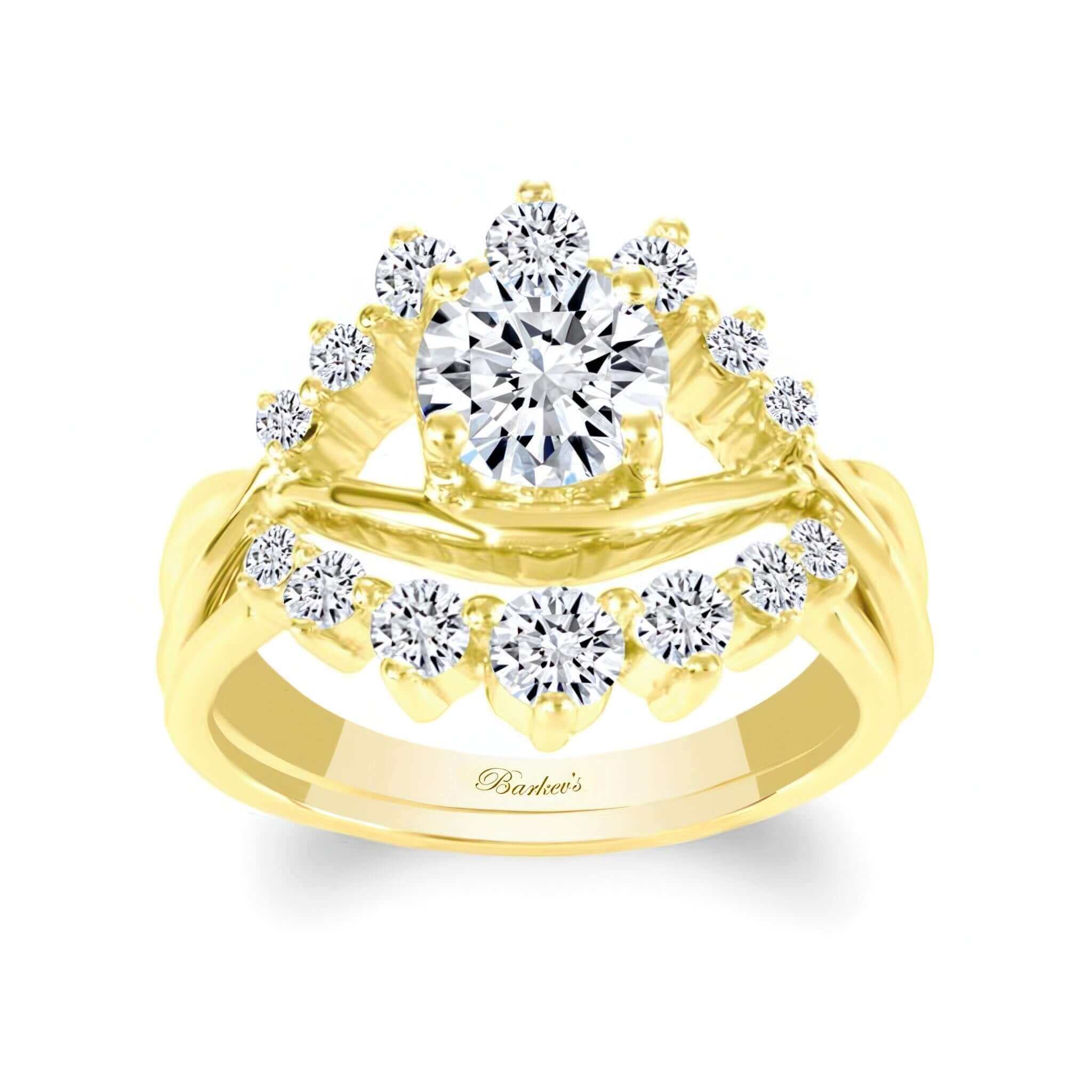 This unique wedding set grabs attention with a flare swirling on one side adorned with shared prong set diamonds and a round center stone. Comes with a matching diamond wedding band.