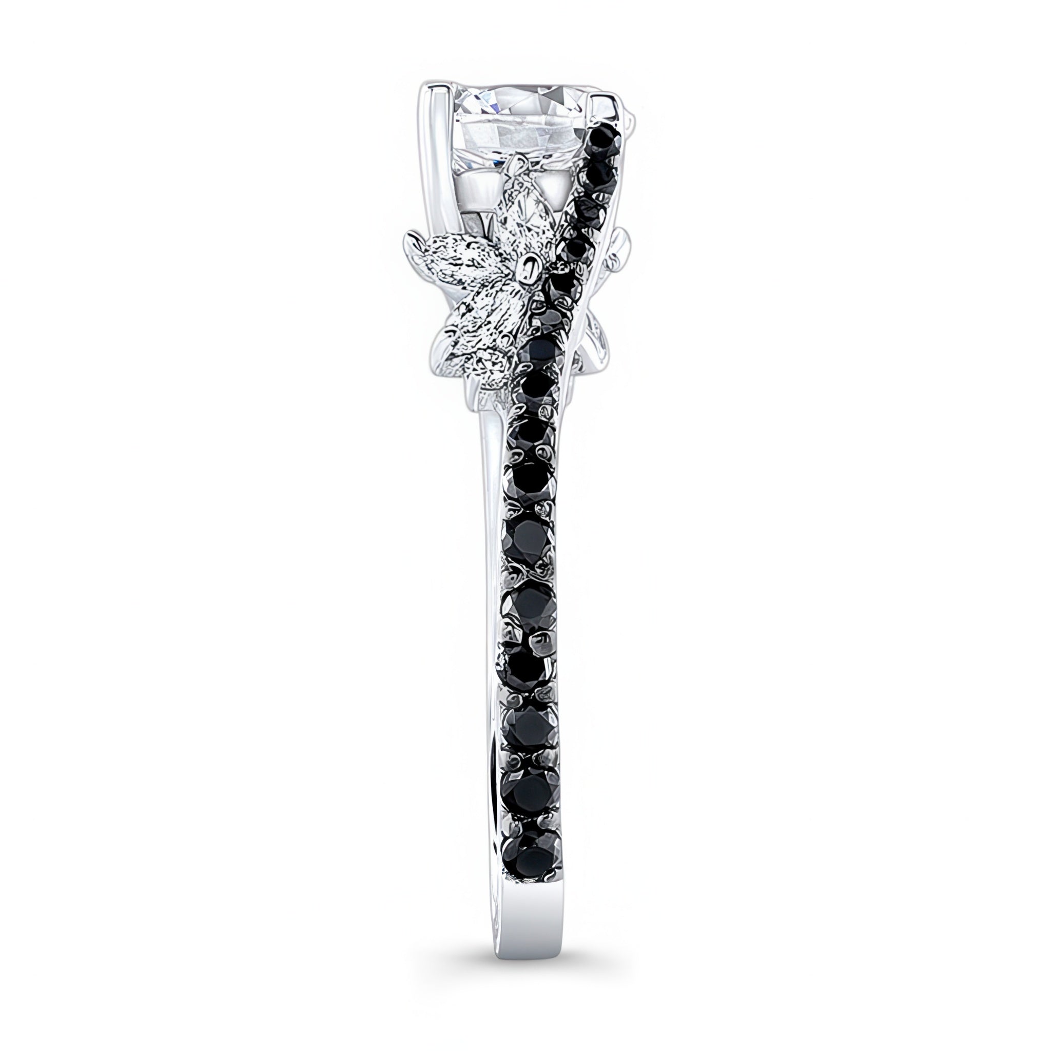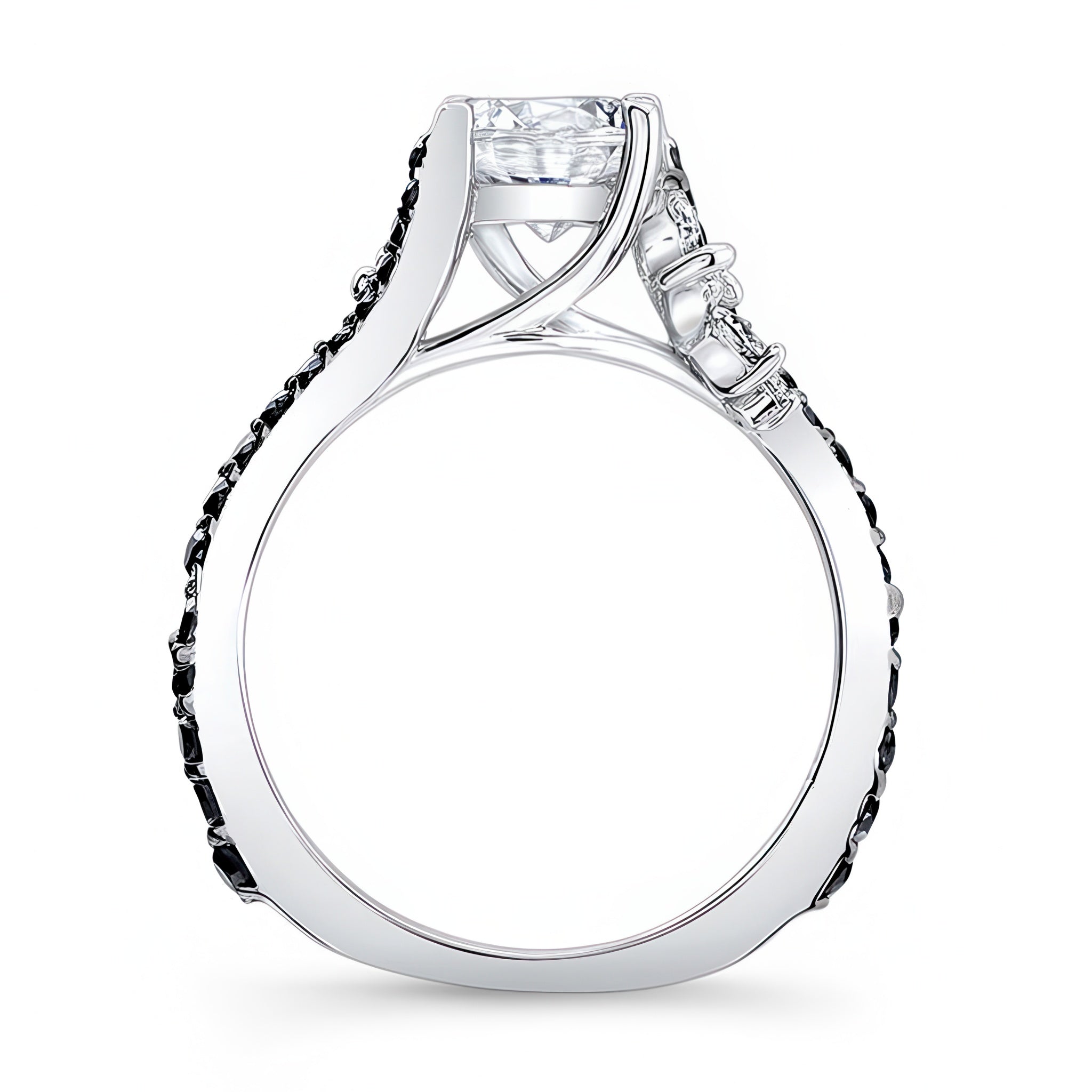 This elegant 1 carat round black diamond accent ring features a prong set center stone graced on each side with a flare of marquise and round white and black diamonds cascading down the dainty shank.