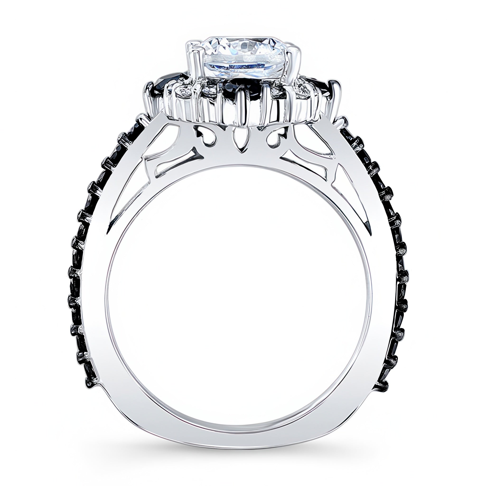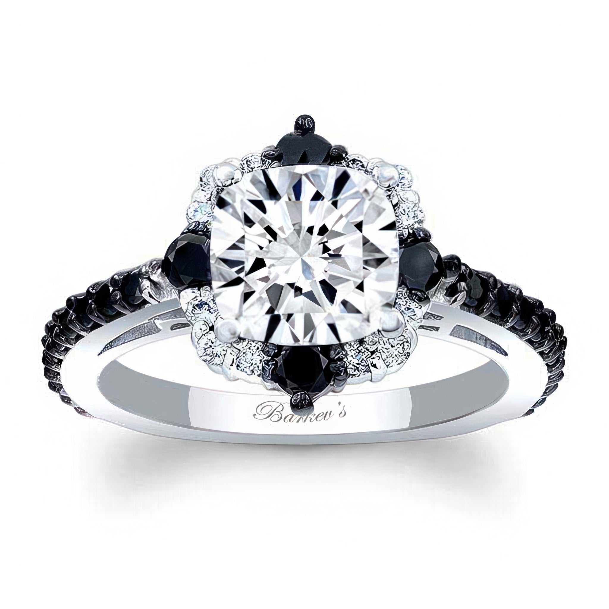 This halo cushion cut black diamond accent ring features a prong set center artfully embellished with shared prong set black and white diamond melees, with black diamond melees cascading down the shank for a striking twist on a traditional halo style ring.