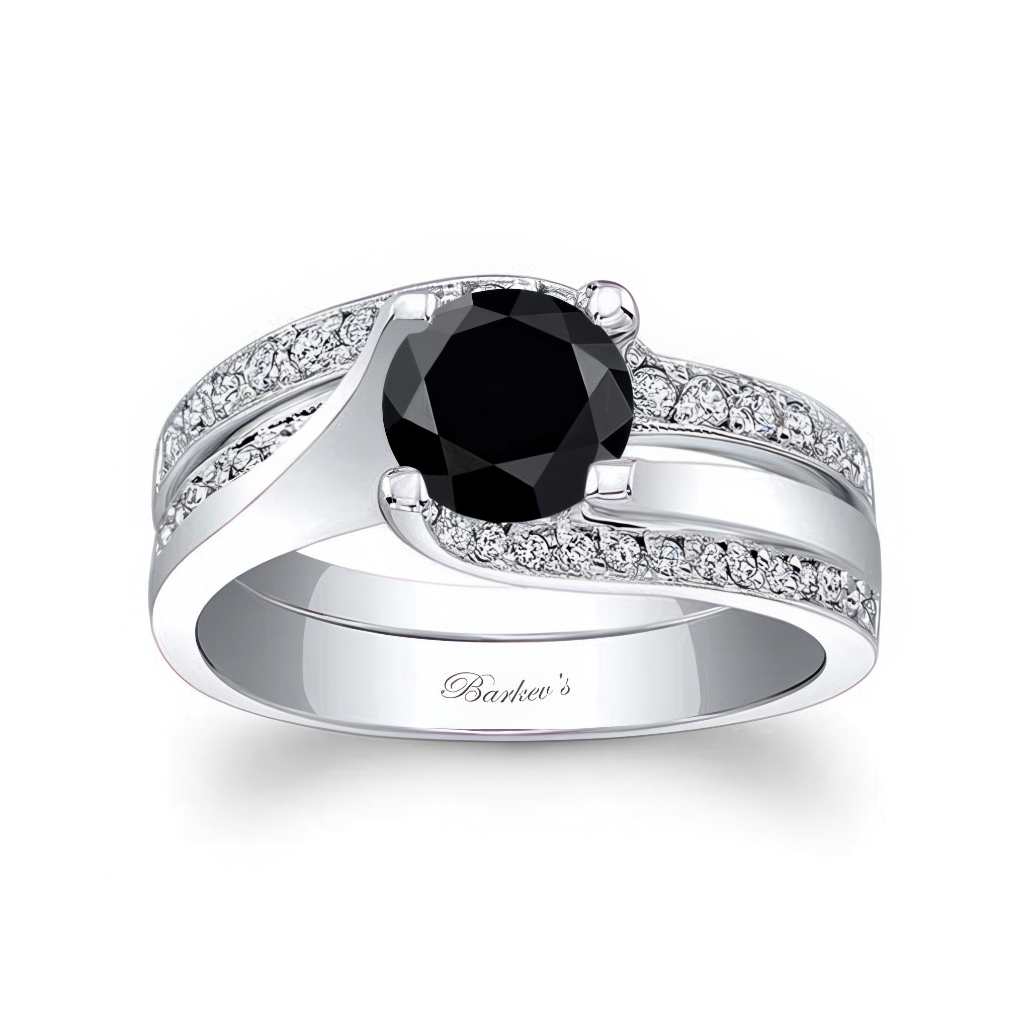 This 1 carat black and white diamond curved bridal set features a prong set round center with a swooping shank enhanced with pave set diamonds and milgrain detailing for a sophisticated aura. Comes with a matching diamond wedding band.