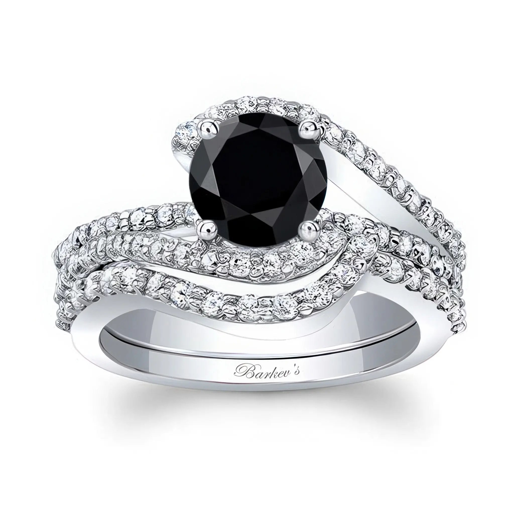 This 1 carat black and white diamond wedding set features an engagement ring with a split shank that curves around the prong set round center, a bridge running underneath and a matching wedding band all adorned with shared prong set diamonds for a classic yet brilliant look.