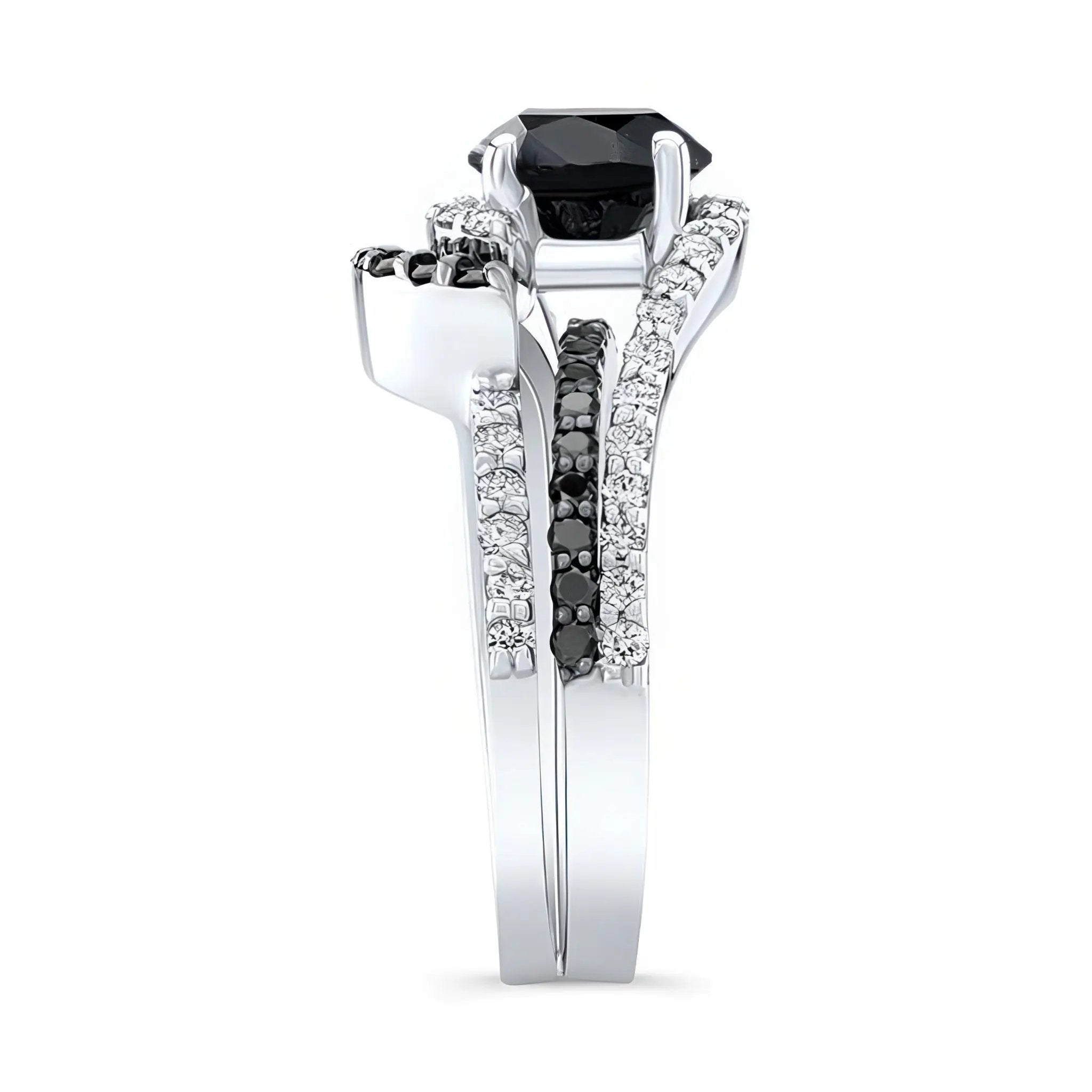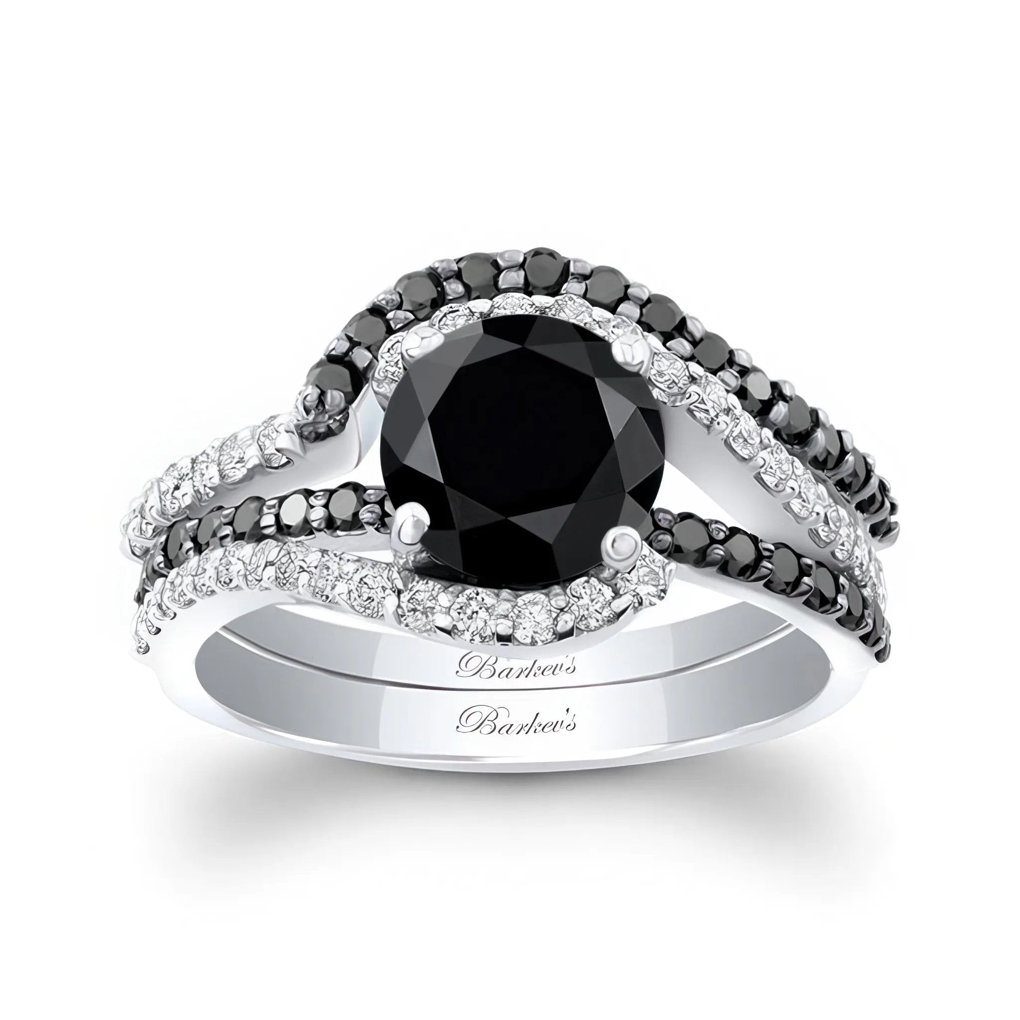This 1 carat black diamond wedding set features an engagement ring with a split shank that curves around the prong set round center, a bridge running underneath and a matching wedding band all adorned with shared prong set black and white diamonds for a classic yet brilliant look.