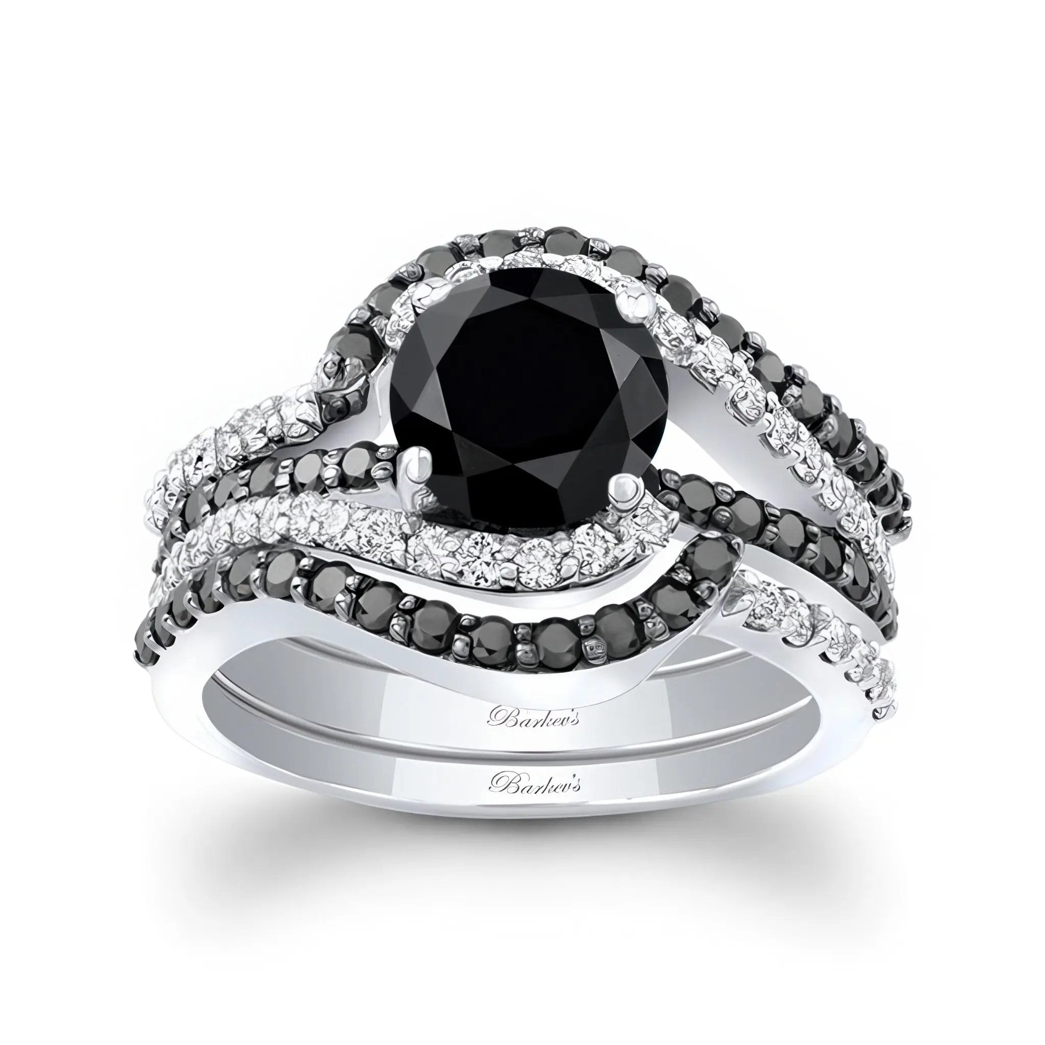 This 1 carat black diamond wedding set with 2 bands features an engagement ring with a split shank that curves around the prong set round center, a bridge running underneath and a matching 2 wedding bands all adorned with shared prong set black and white diamonds for a classic yet brilliant look.