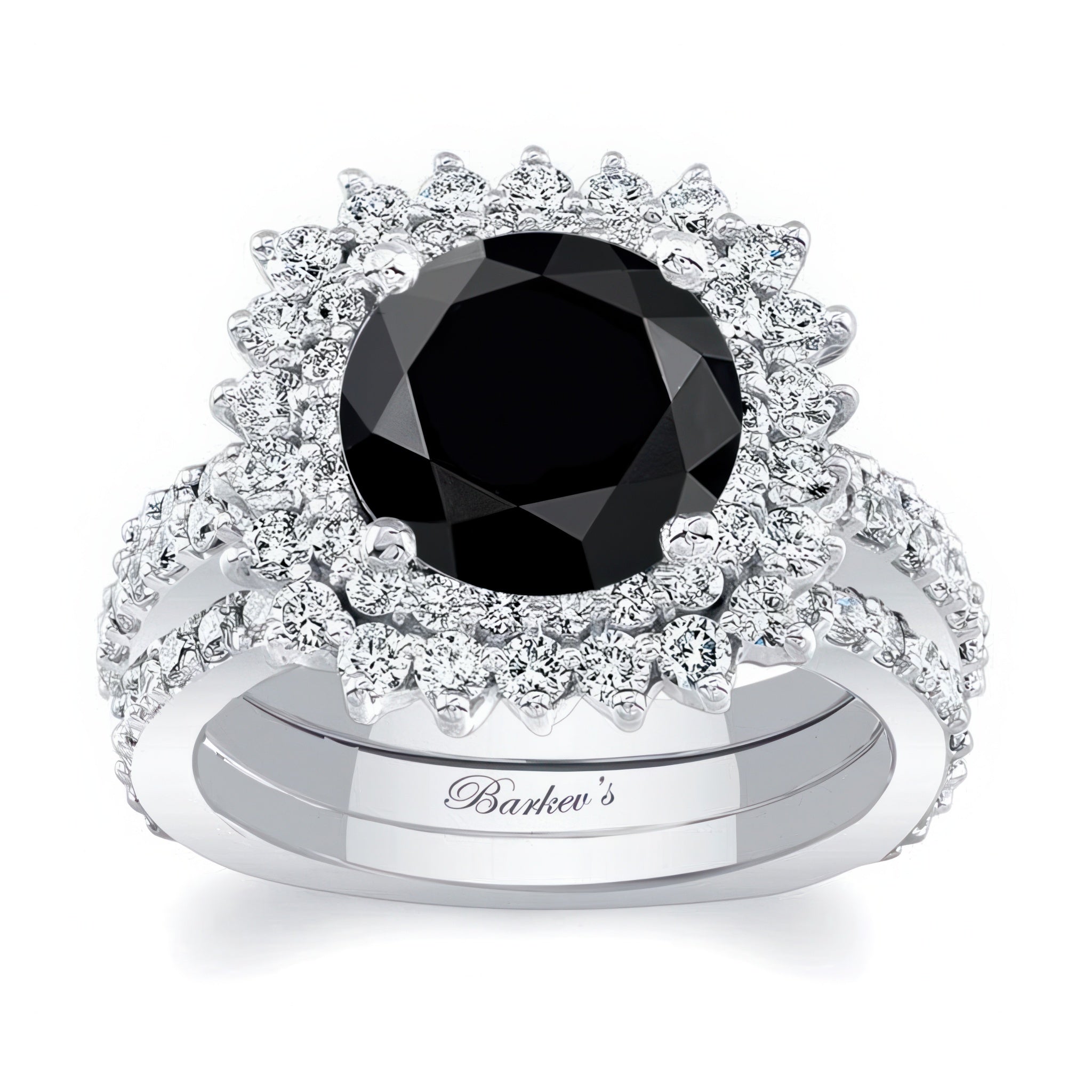 This 3 carat black and white diamond engagement ring set with 2 bands features a prong set round center framed by a diamond halo forming a starburst pattern with shared prong set diamond melees running down the shoulders and wedding bands for an added touch of glamour.