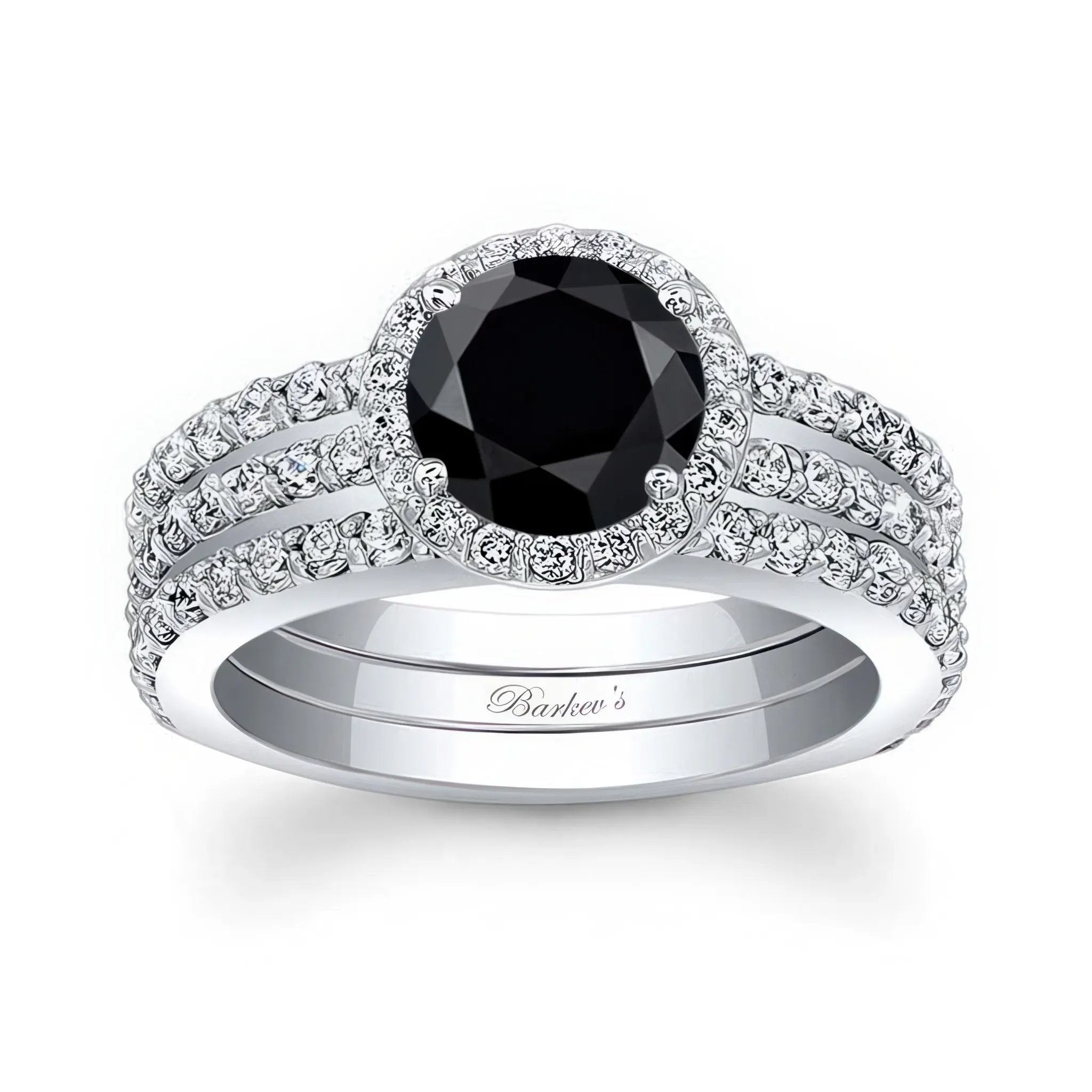 This black and white diamond 3 piece halo wedding ring set features a round center with a halo encircling it and diamonds cascading down the dainty shank for a look of sheer elegance. Comes with two matching wedding bands.