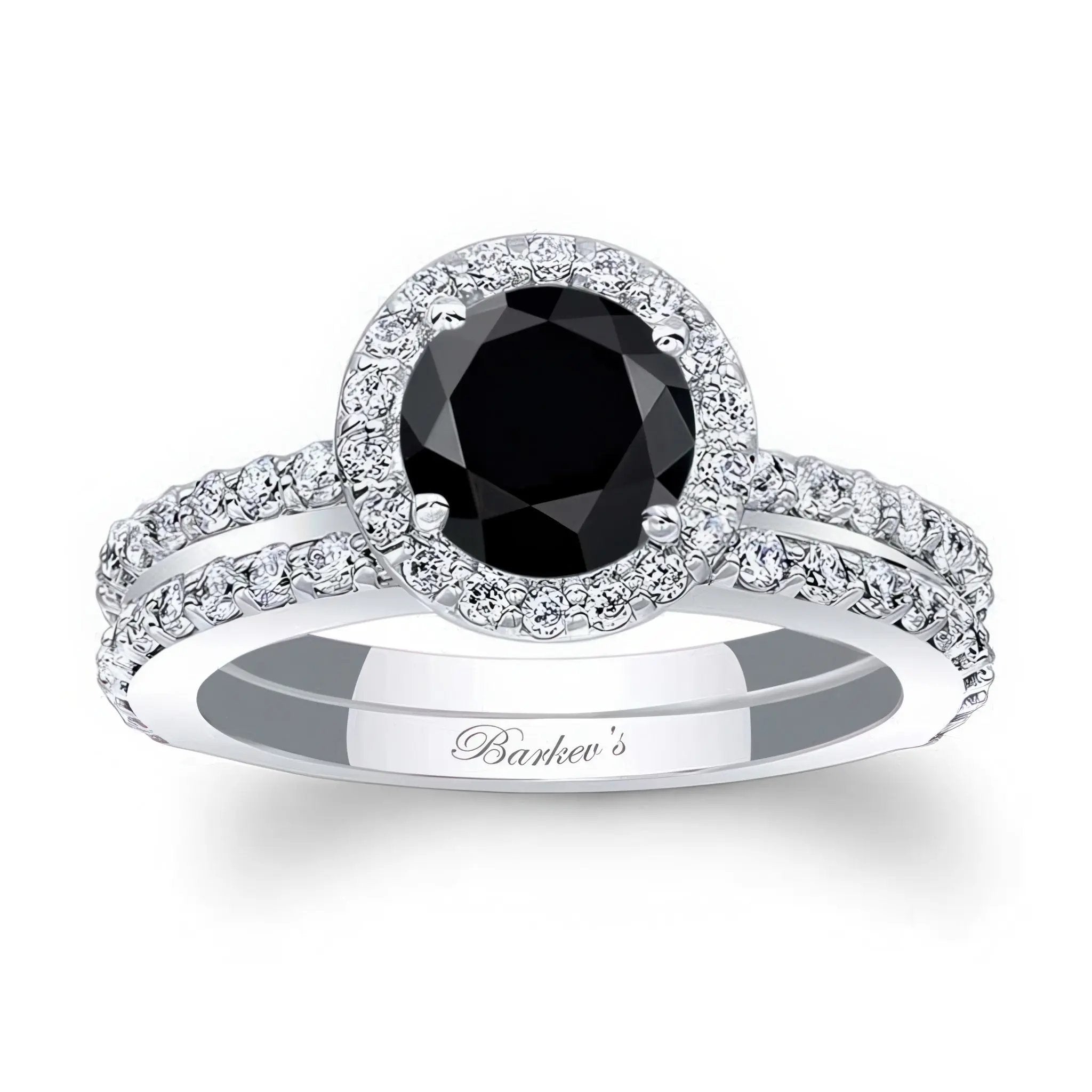 This black and white diamond halo wedding ring set features a round center with a halo encircling it and diamonds cascading down the dainty shank for a look of sheer elegance. Comes with a matching wedding band.