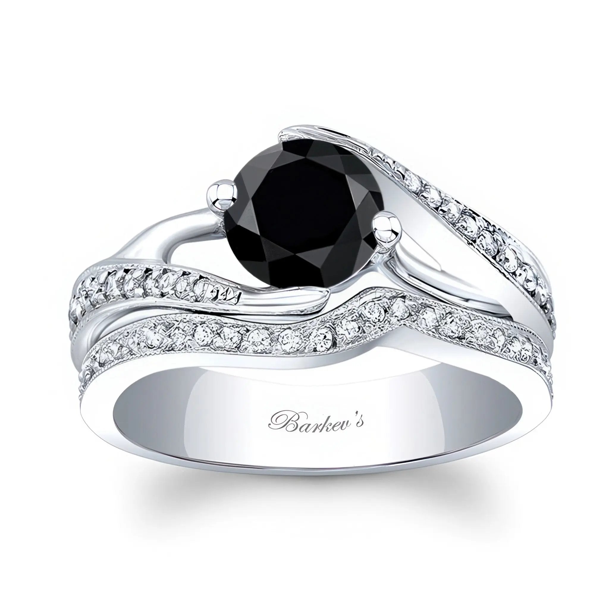 This modern bypass black and white diamond bridal set has a channel set round center with pave set diamonds on the shoulder and a milgrain finish for a touch of glam. Comes with a matching wedding band.