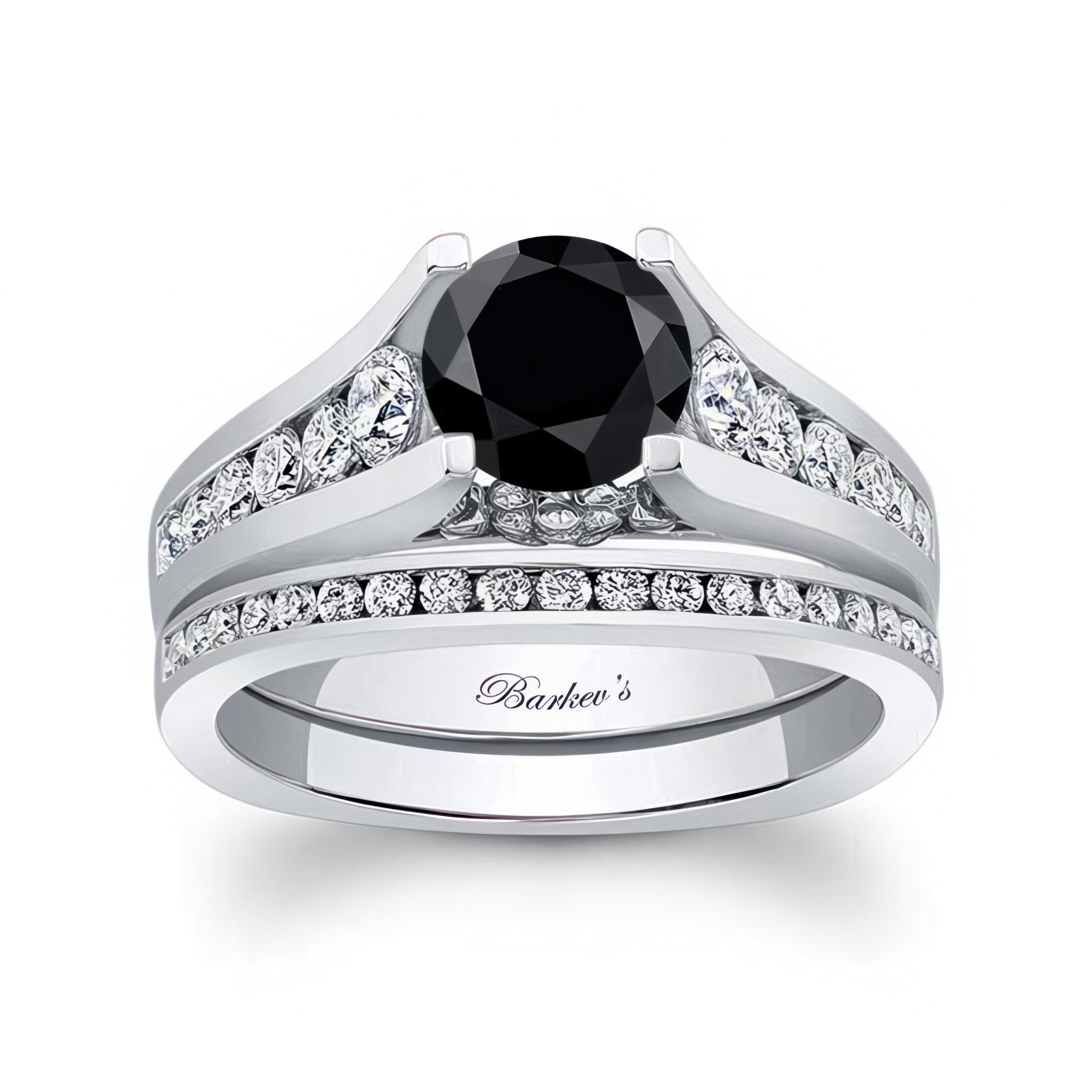 This classic black and white diamond channel bridal set features a prong set round center with channel set diamonds graduating down the shank. Comes with a matching diamond wedding band for a traditional feel.