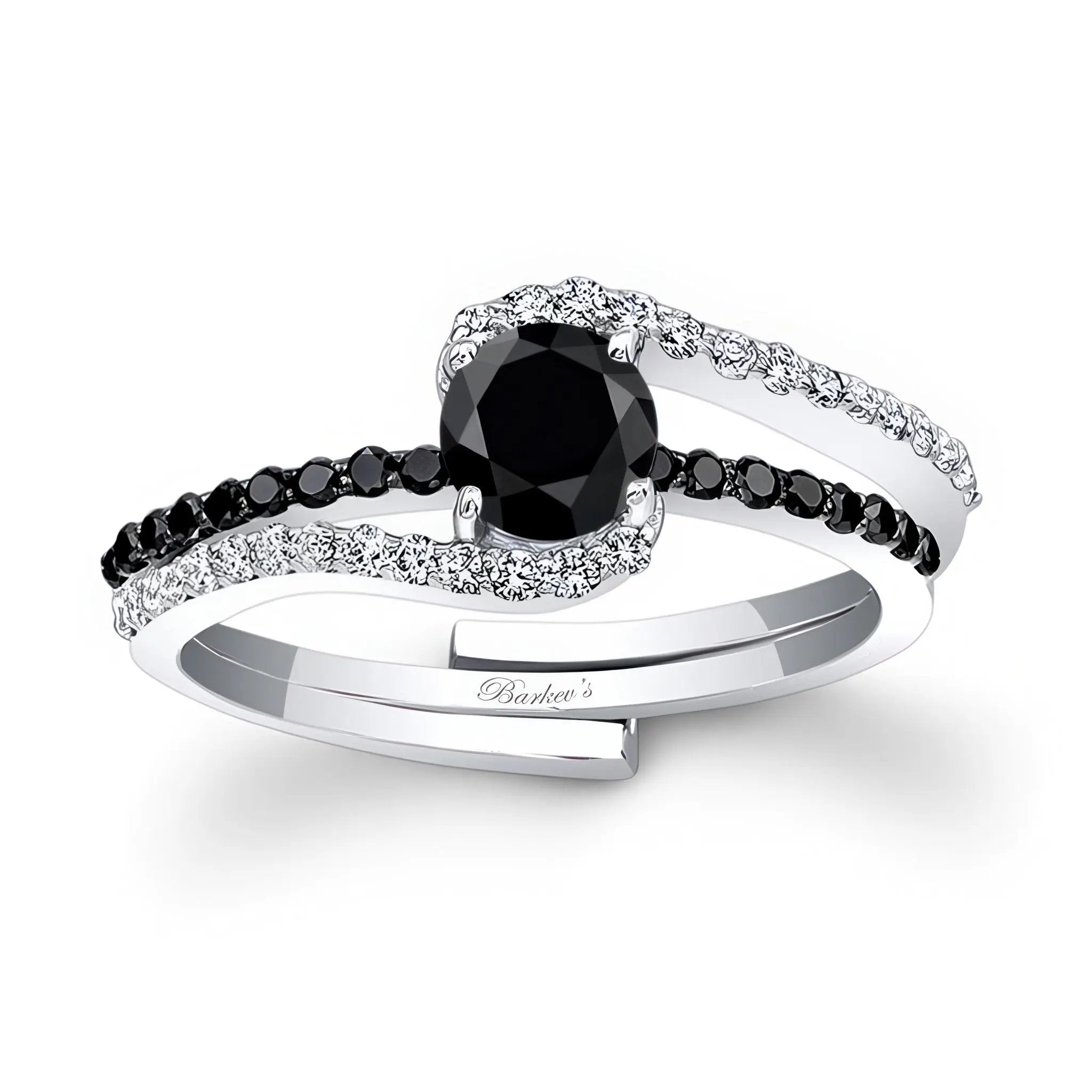 This half carat black diamond bridal set features a prong set round center with pave diamonds and a black diamond wedding band that slips in between the split shank.