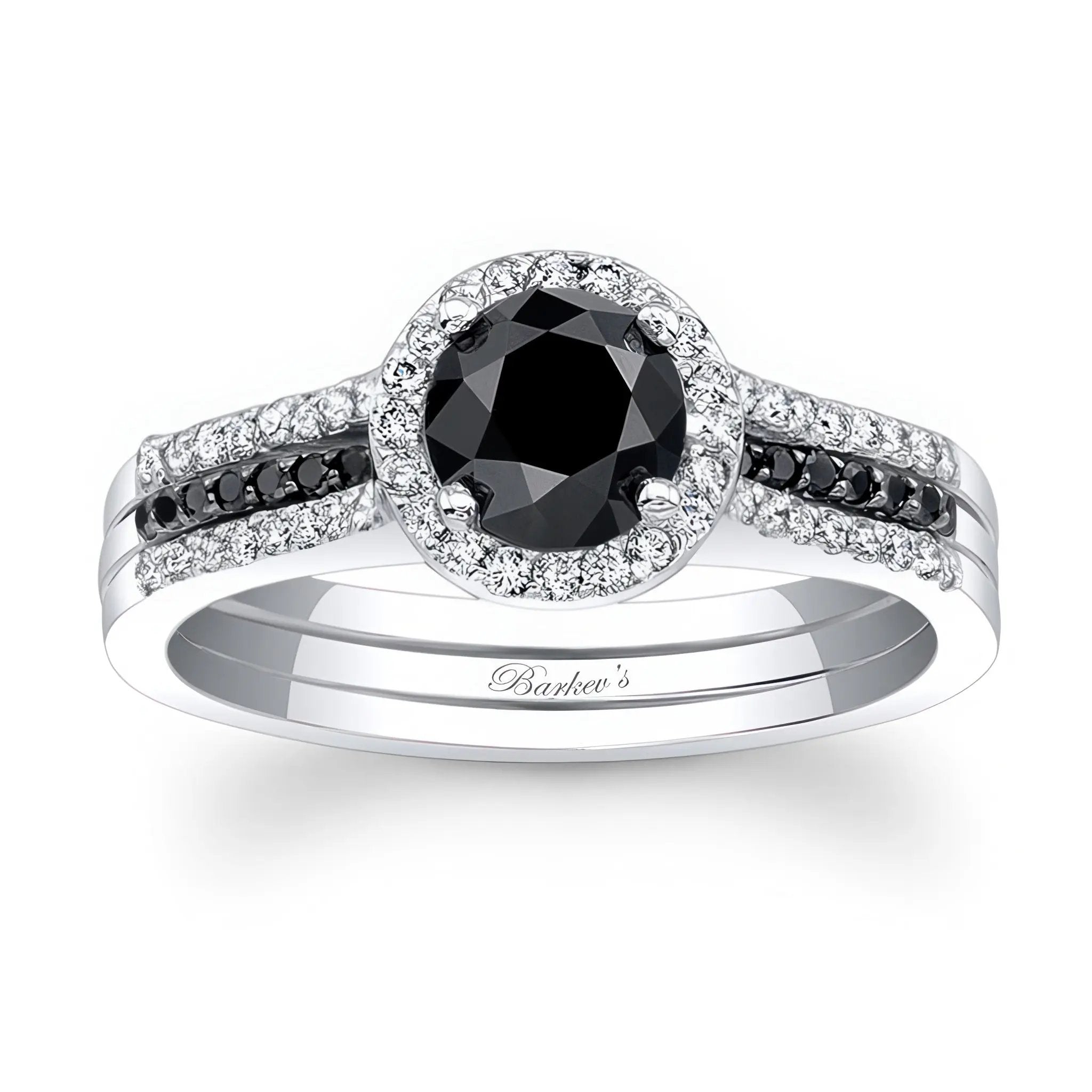 This half carat interlock halo black diamond bridal set features a round prong set center with a diamond halo around it and diamonds cascading down the shoulders. Comes with a matching black diamond wedding band that slips into the ring.