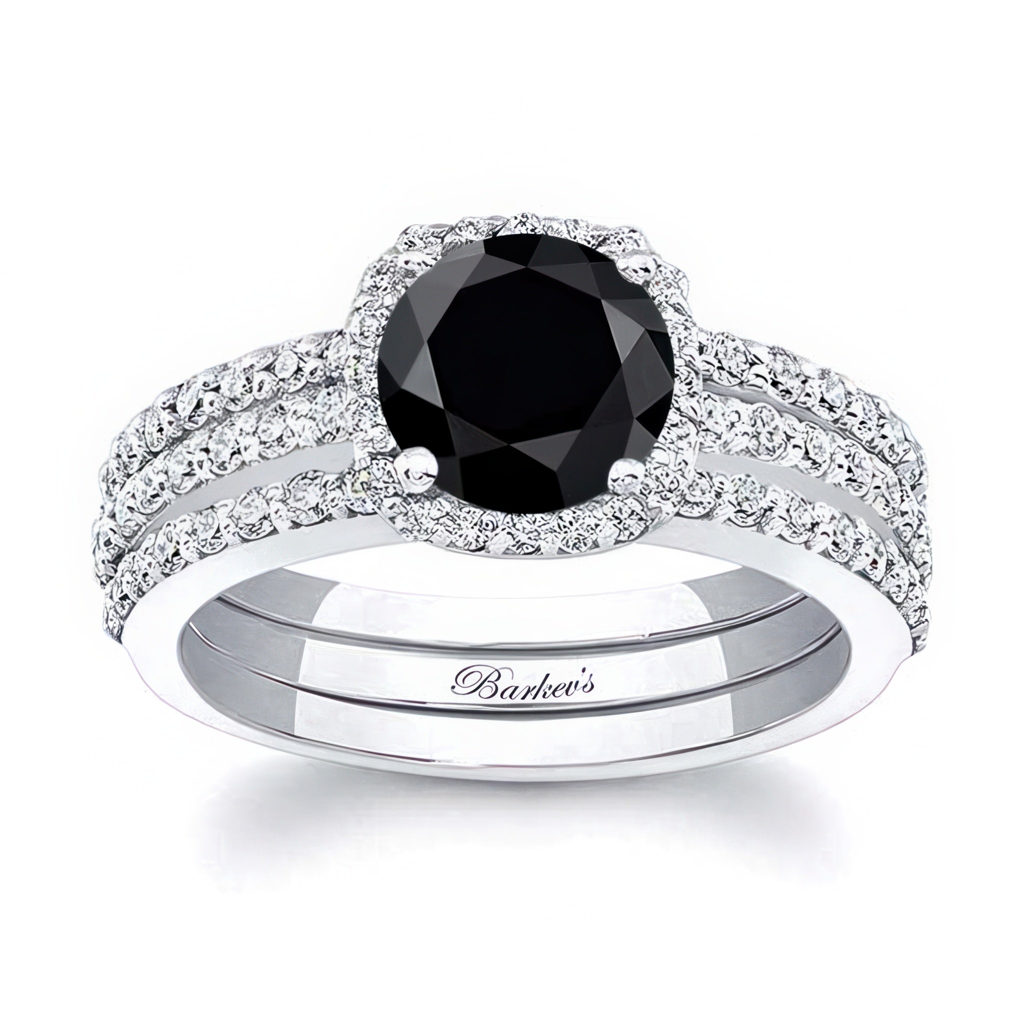 This halo black and white diamond wedding set features micro pave diamonds encircling the round center and cascading down the shank with two matching diamond wedding bands on the sides for a look of sheer elegance.