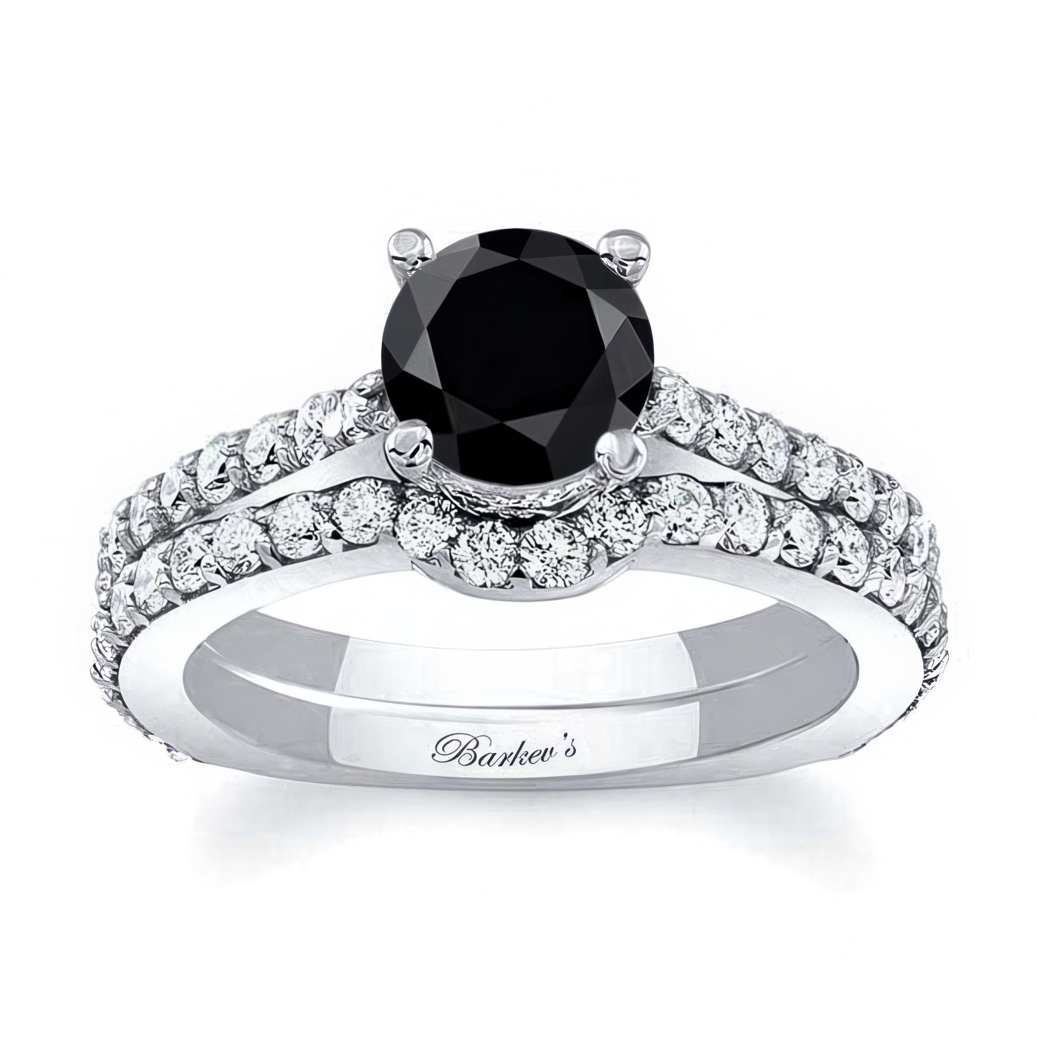 This traditional black and white diamond ring set features a prong set round center with shared prong set diamonds gracing the shoulders and matching wedding band.
