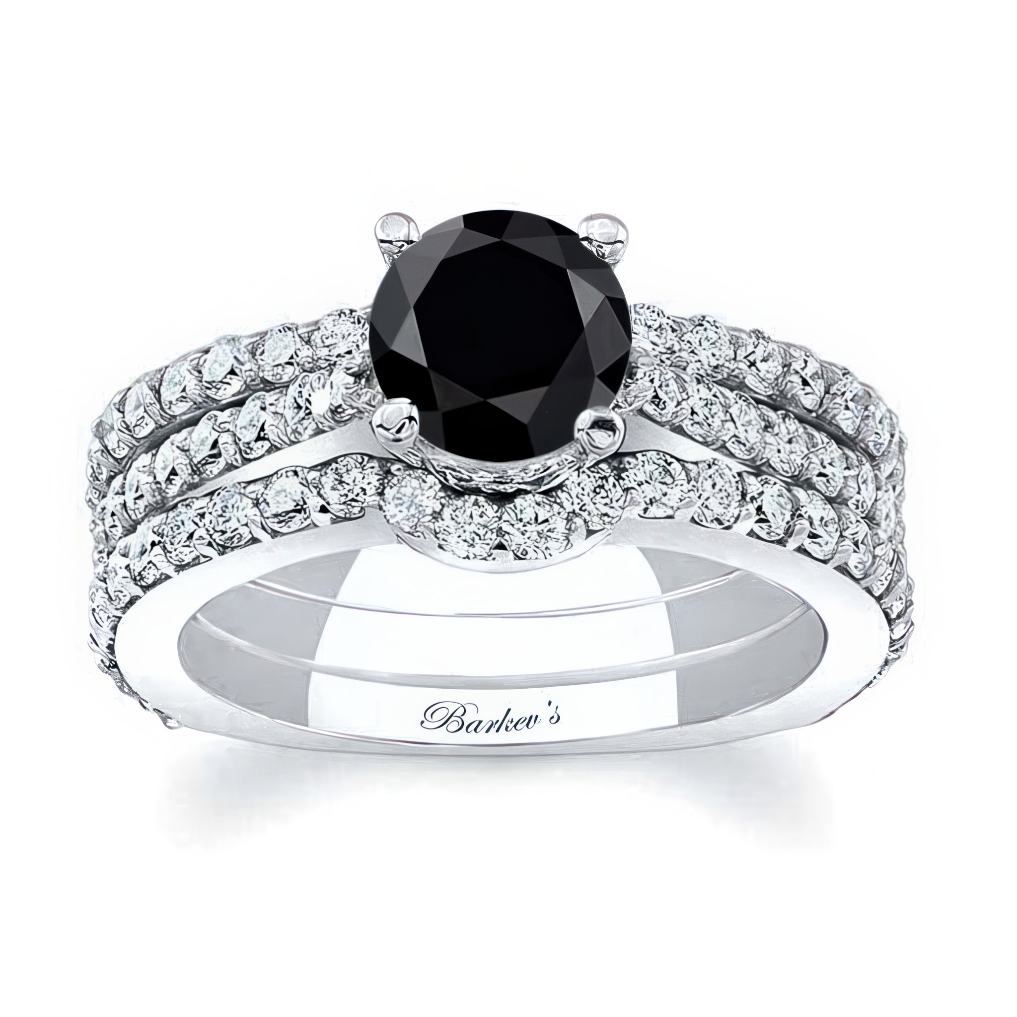 This traditional black and white diamond ring set with 2 bands features a prong set round center with shared prong set diamonds gracing the shoulders and matching wedding bands.