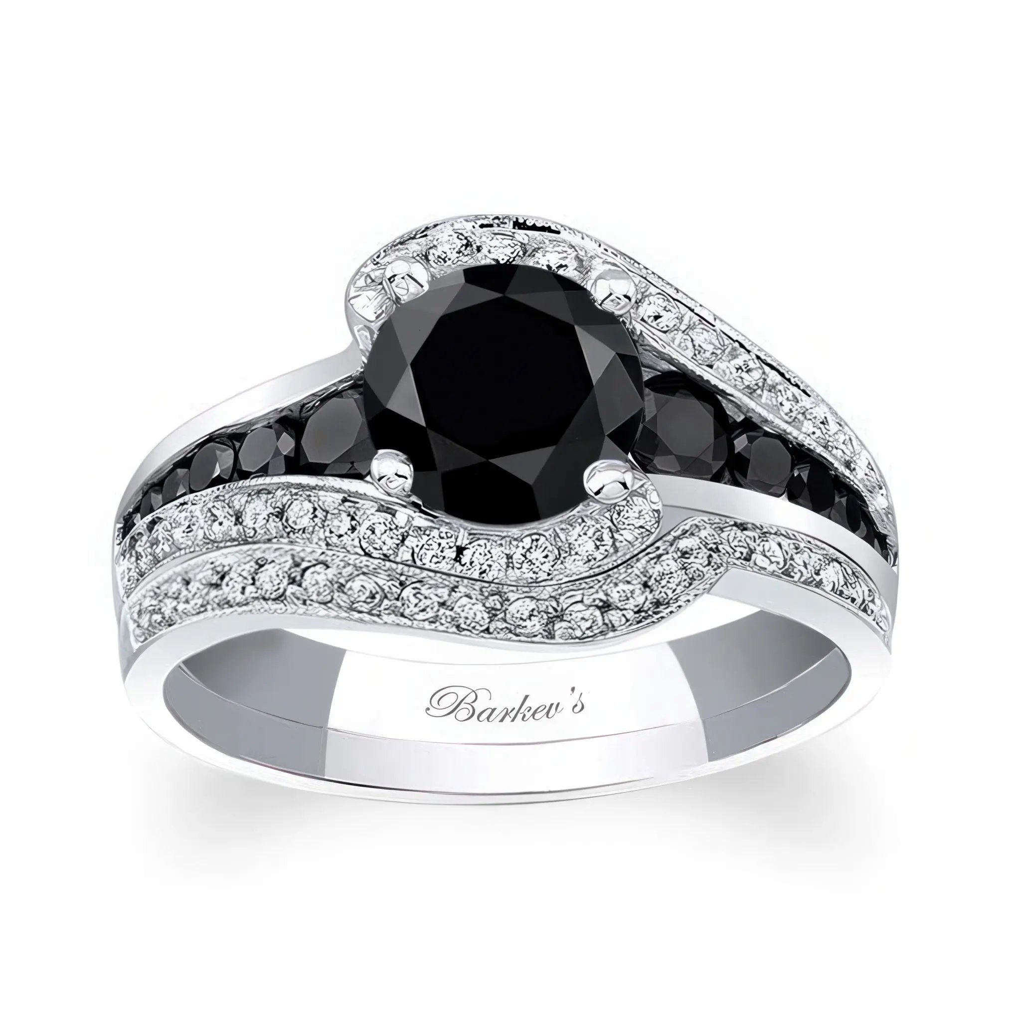 This unique black diamond bridal set features a prong set round center. The shoulders split and curve up to the center with pave set diamonds, while channel set black diamonds grace the sides. Comes with a matching wedding band.