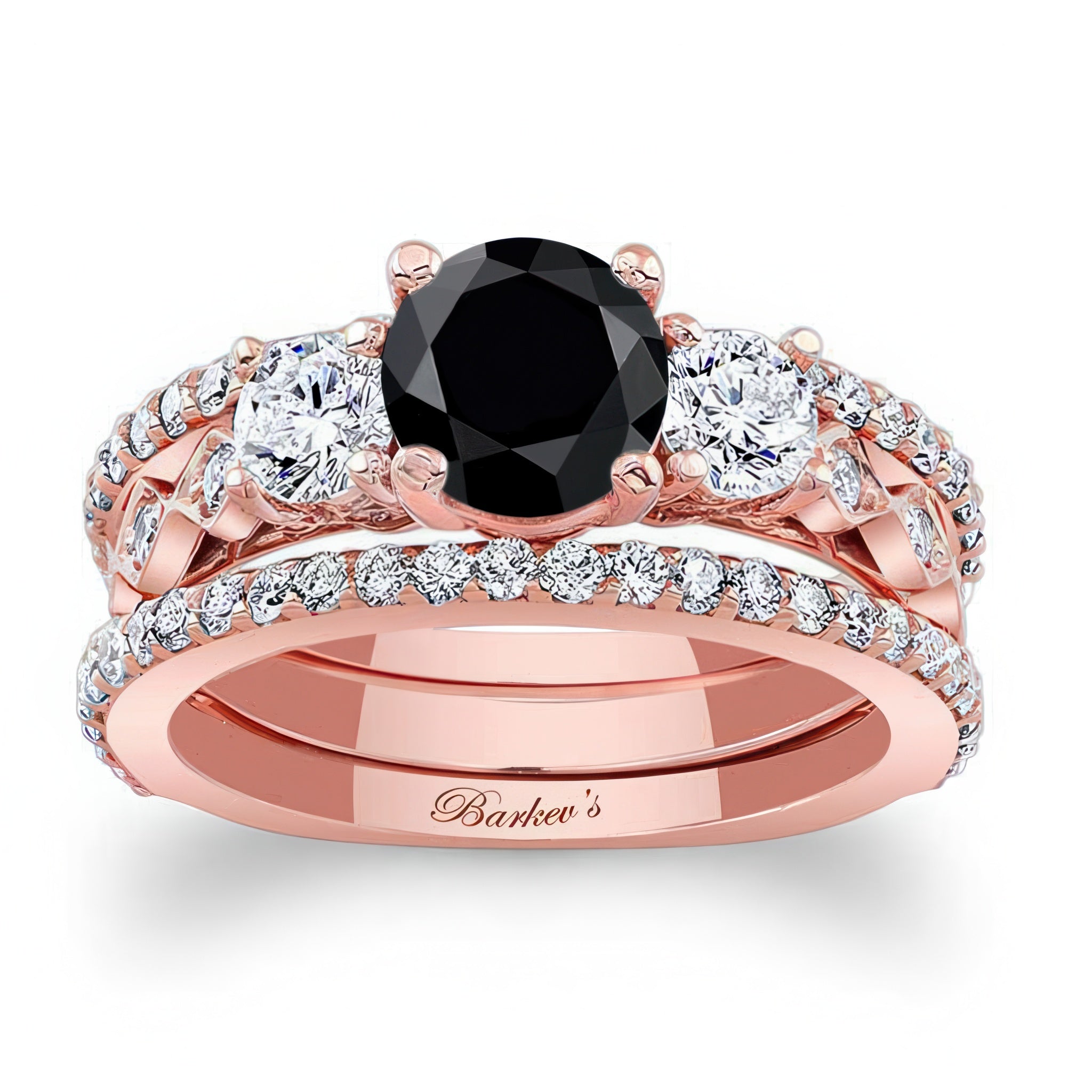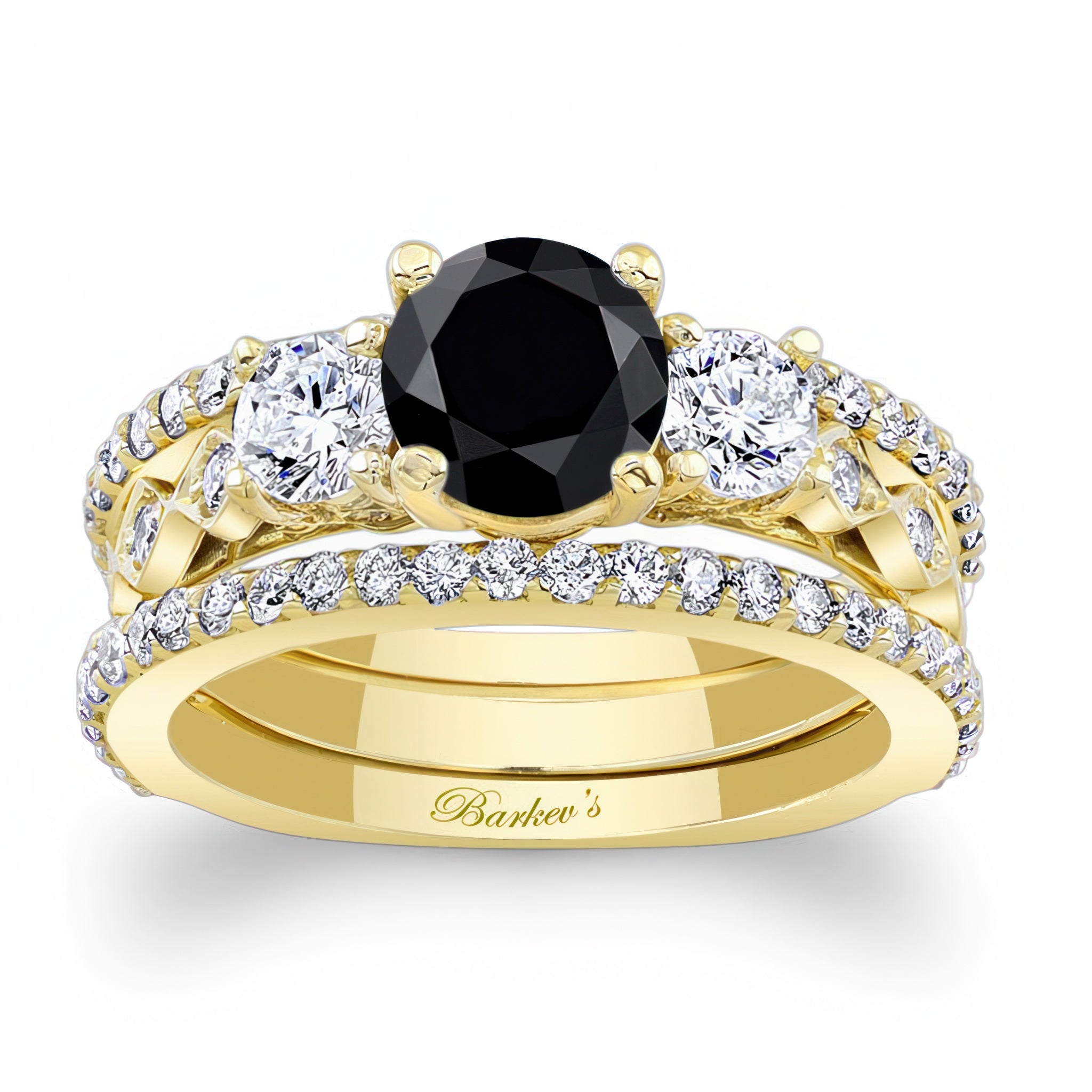 Vintage 3 Stone Black And White Diamond Ring Set With 2 Bands