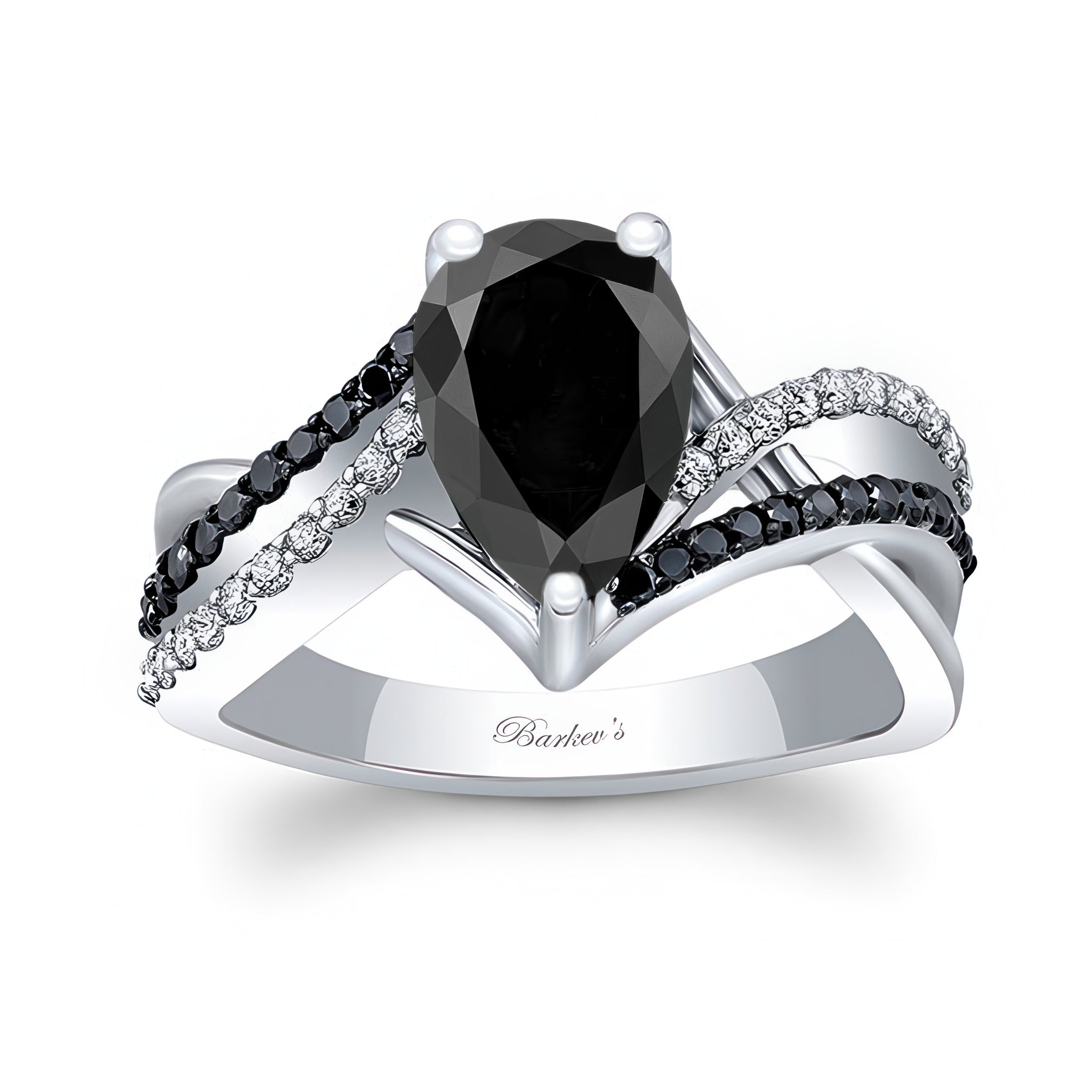 A black diamond teardrop ring featuring a pear shaped center that sits beautifully between interwoven rows of melees which descend gracefully down the curves. This uniquely designed ring will surely catch the eyes of many admirers.