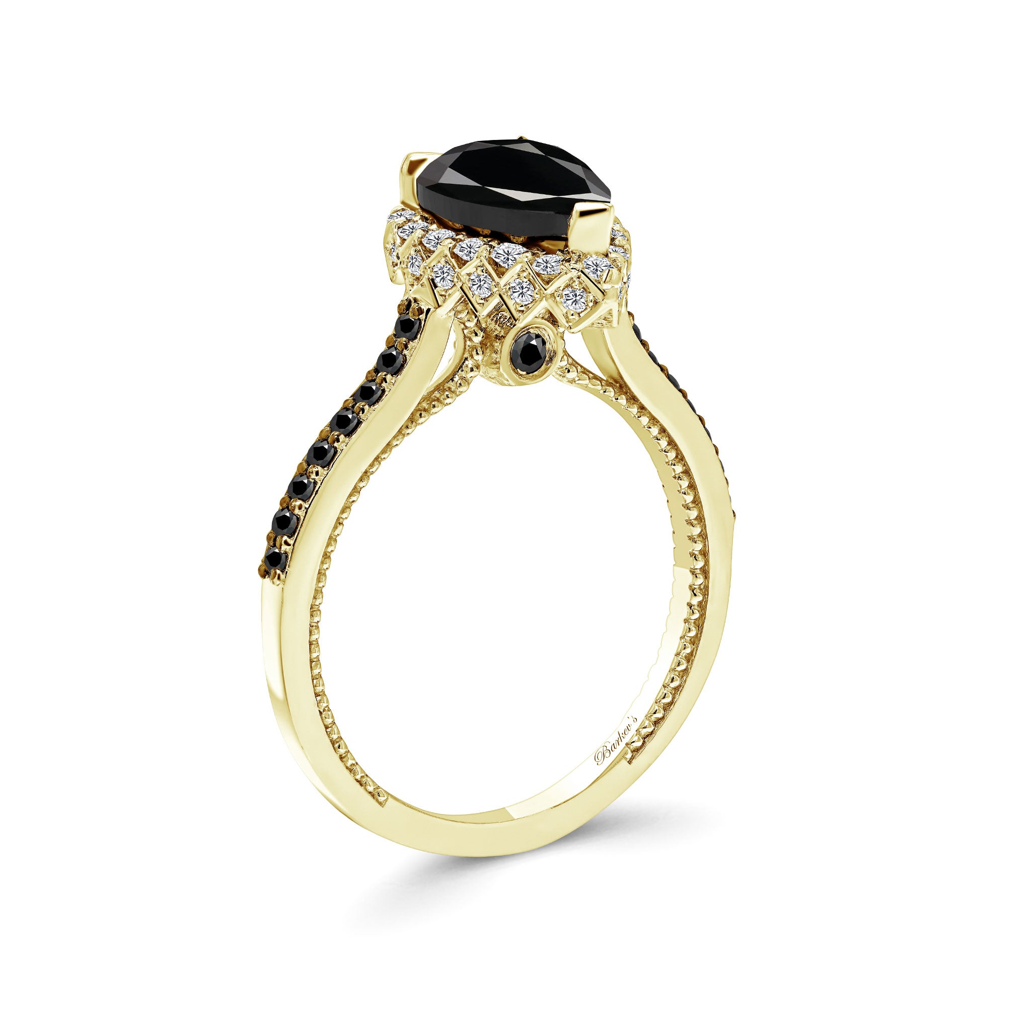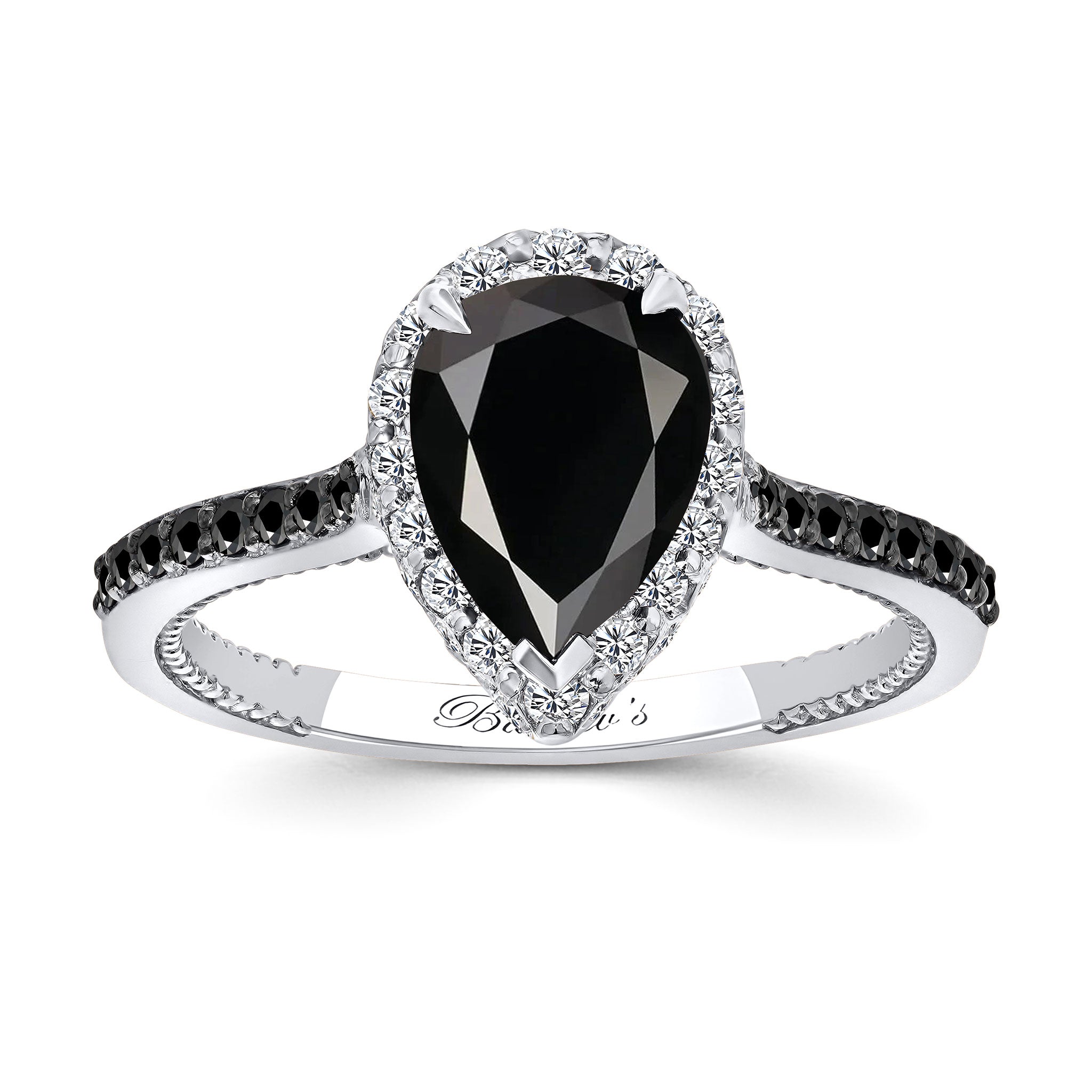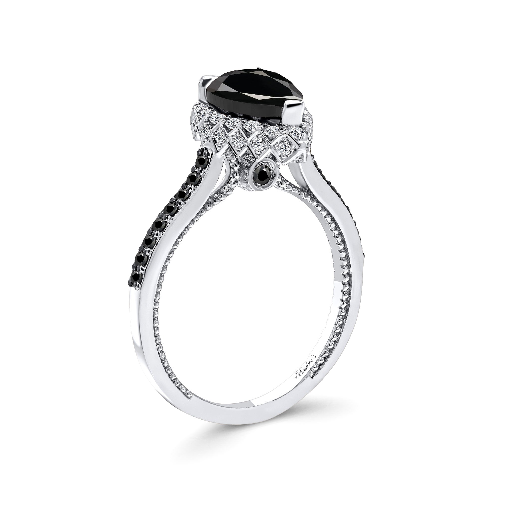 A beautiful pear shaped black diamond halo ring featuring a teardrop center with black diamond melees flowing down the shank. The profile reveals a second set of diamonds surrounding the center from underneath with two bezel set black diamonds.