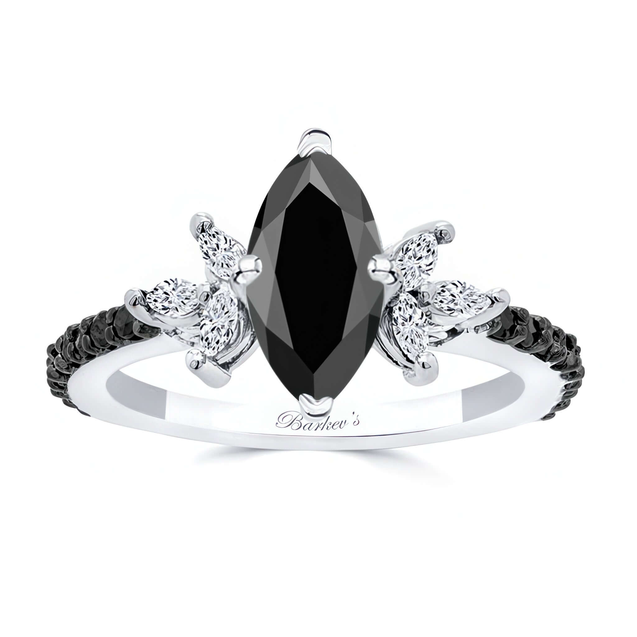 Discover timeless elegance with this stunning marquise cut black diamond engagement ring. The centerpiece is a dazzling marquise black diamond, accentuated by six additional marquise diamonds arranged in a floral-inspired design. Completing the look, 18 round black diamonds shimmer along the delicate shank, adding brilliance to every angle. A perfect blend of sophistication and romance, this ring is crafted for those who appreciate unique and graceful details.