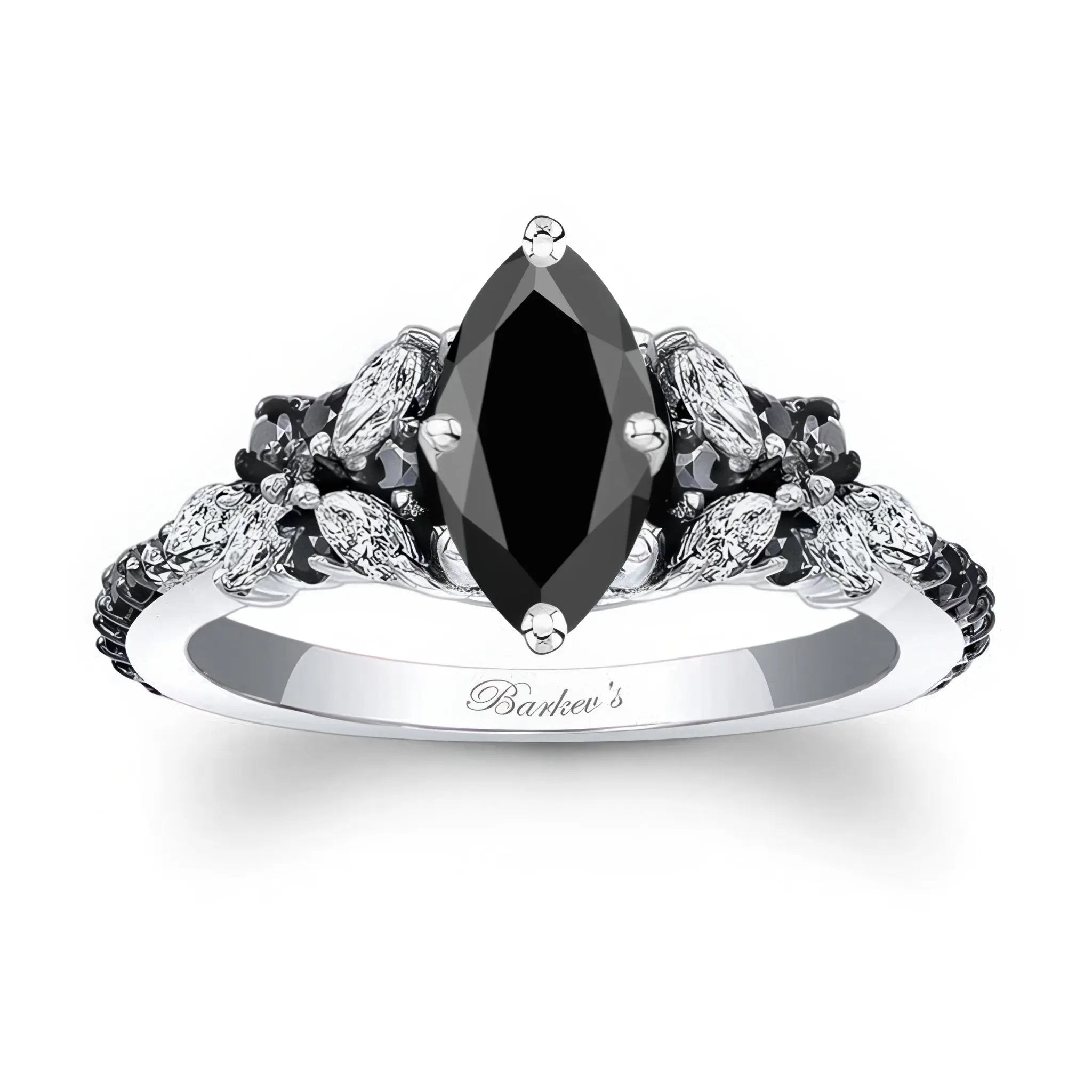 An exquisite marquise vintage black diamond engagement ring featuring a prong set marquise center and cathedral shoulders artfully adorned with marquise diamond melees and round black diamonds.