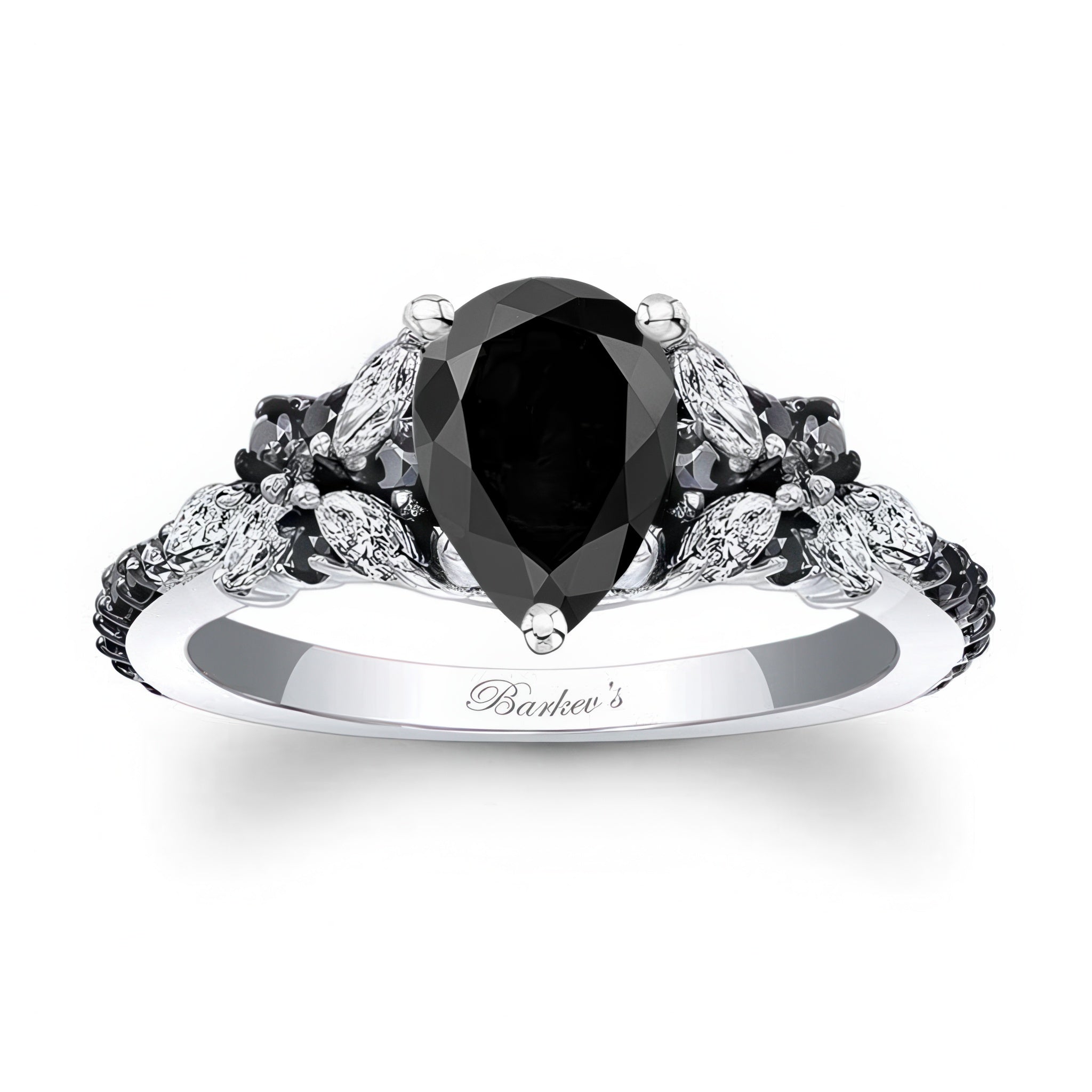 An exquisite pear shape vintage black diamond engagement ring featuring a prong set pear shape center and cathedral shoulders artfully adorned with marquise diamond melees and round black diamonds.