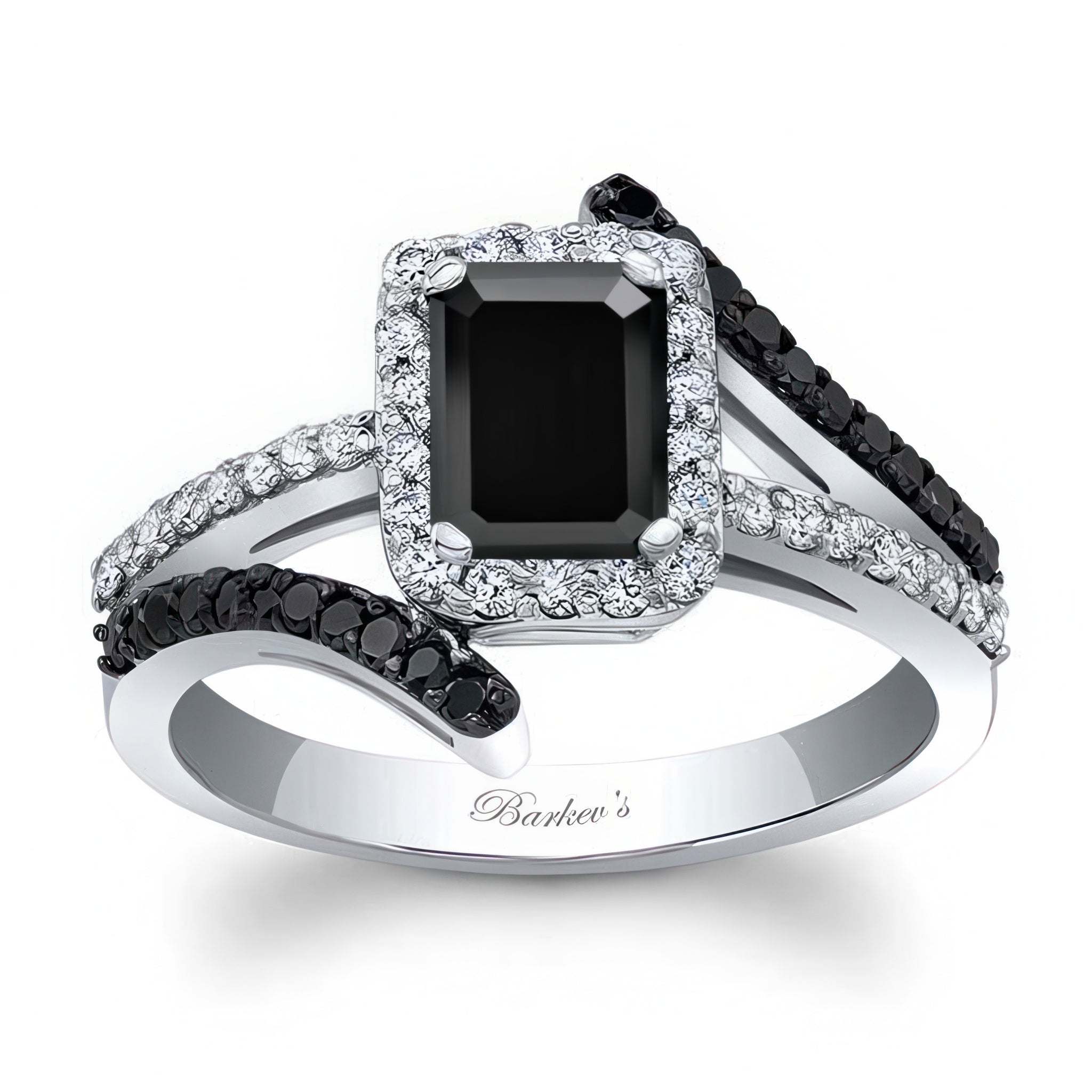 This rectangle halo black diamond engagement ring features a prong set center encircled with diamonds and a split shank adorned with shared prong set white and black diamonds for an added touch of elegance.