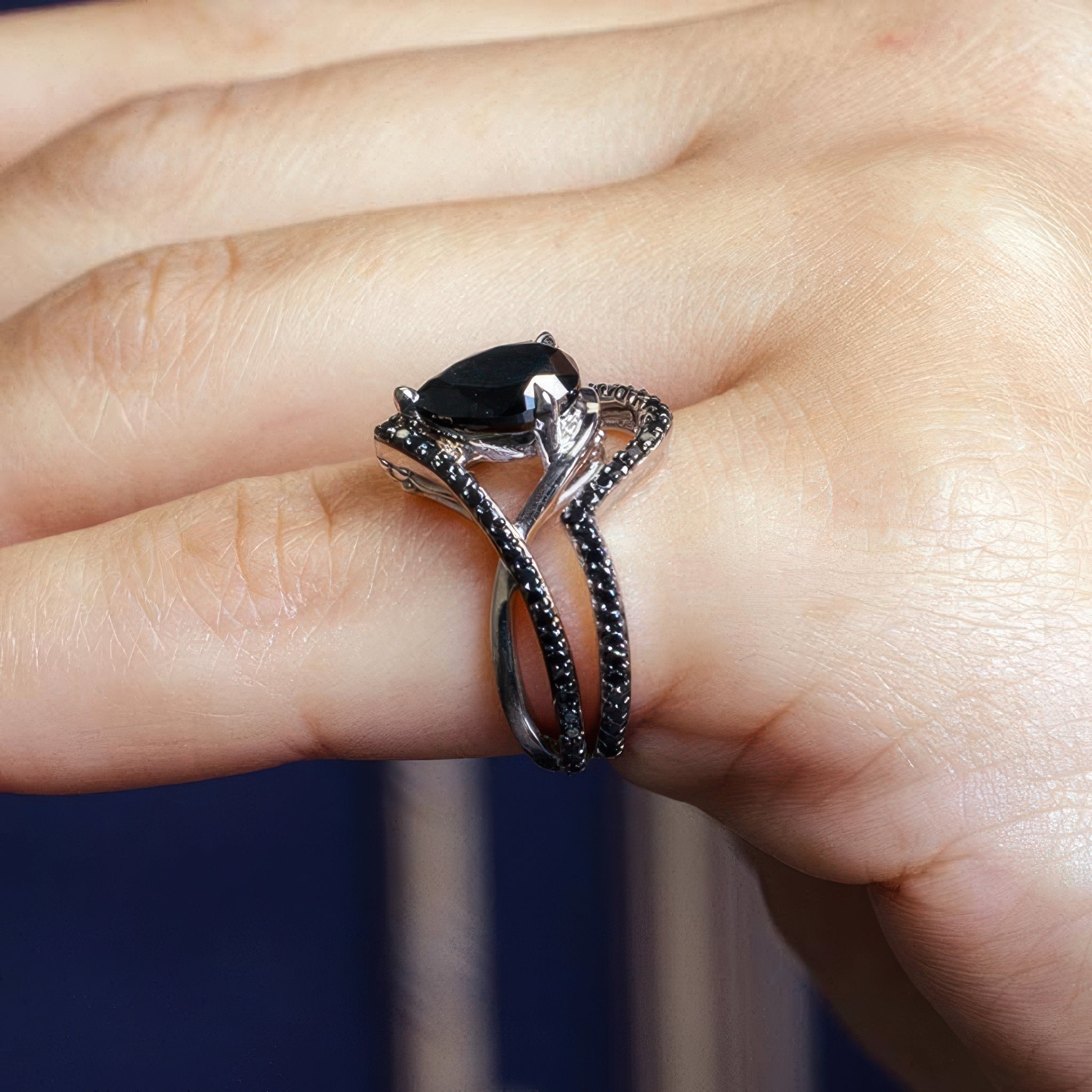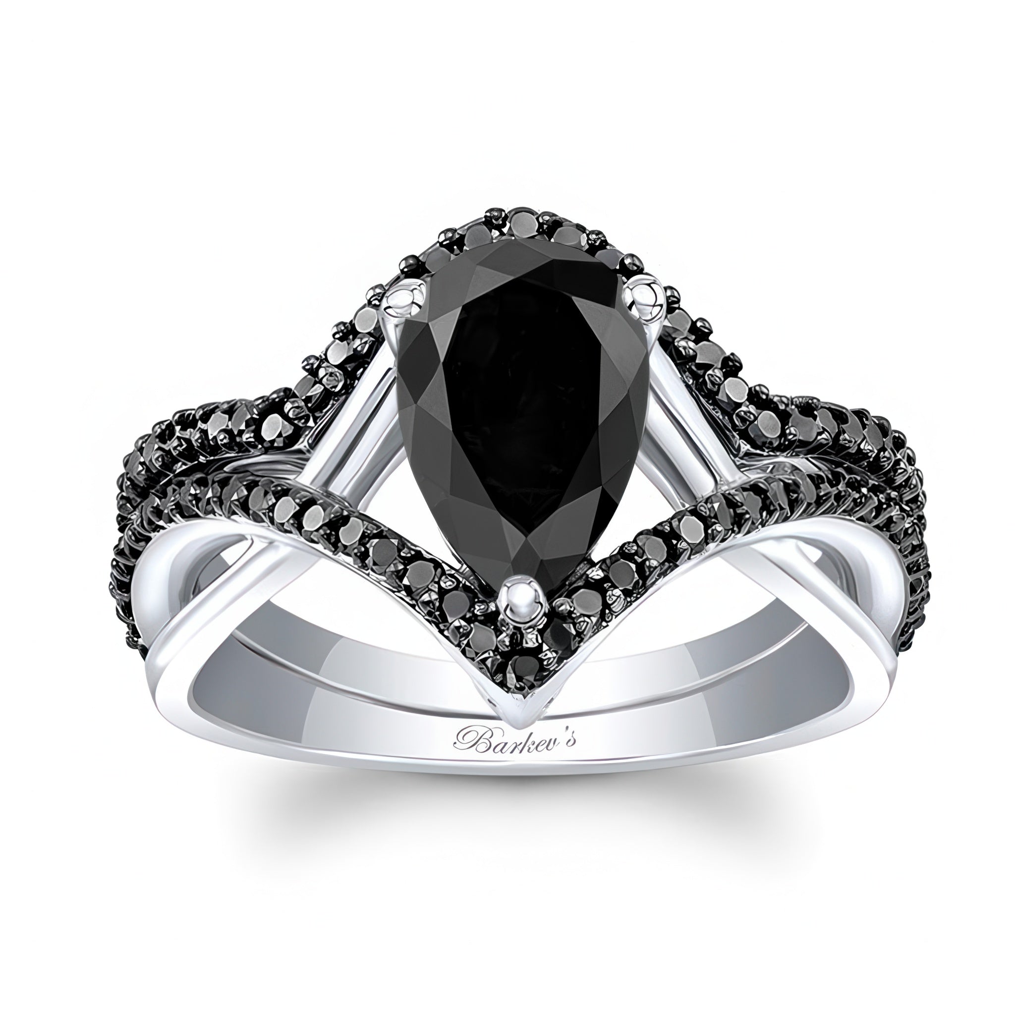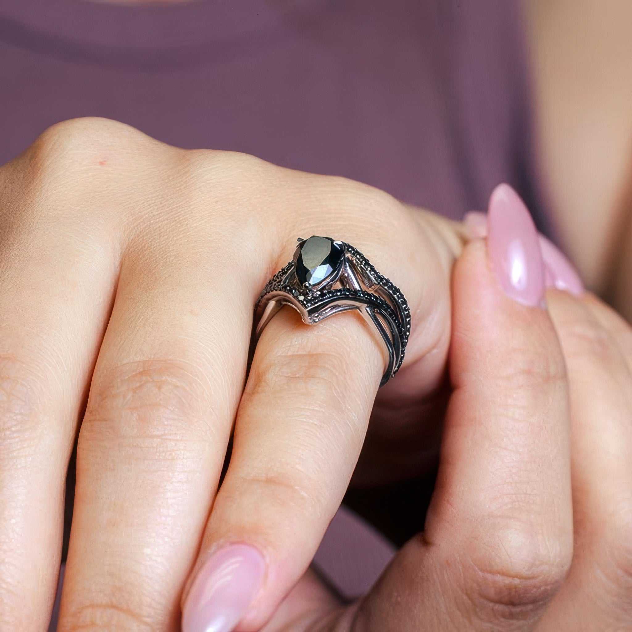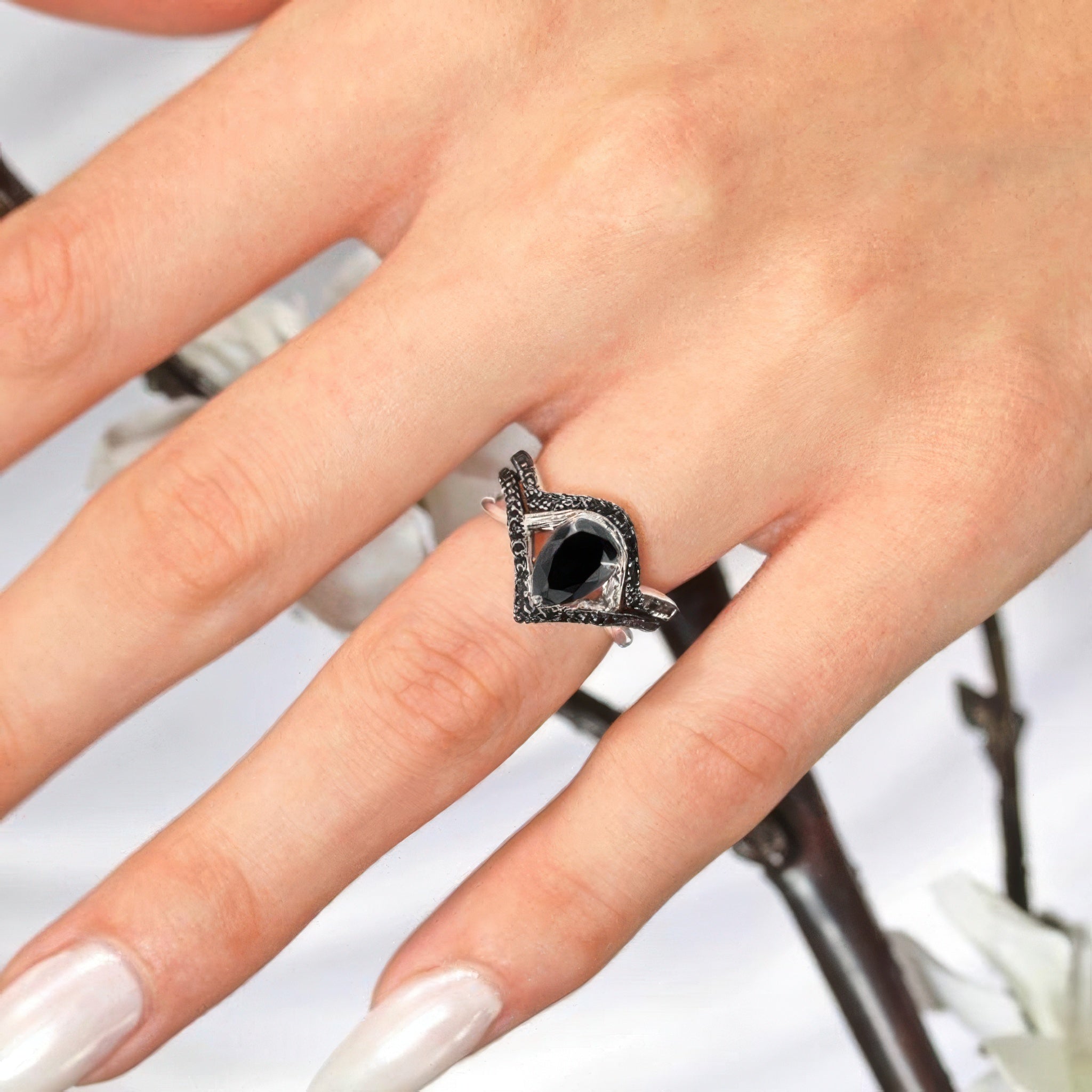 Dare to stand out with the Unique Pear Shaped Black Diamond Wedding Set, where edgy elegance meets timeless craftsmanship. The striking pear-shaped black diamond center captivates with its mysterious allure, set on a twisting band that blends modern design with classic romance.