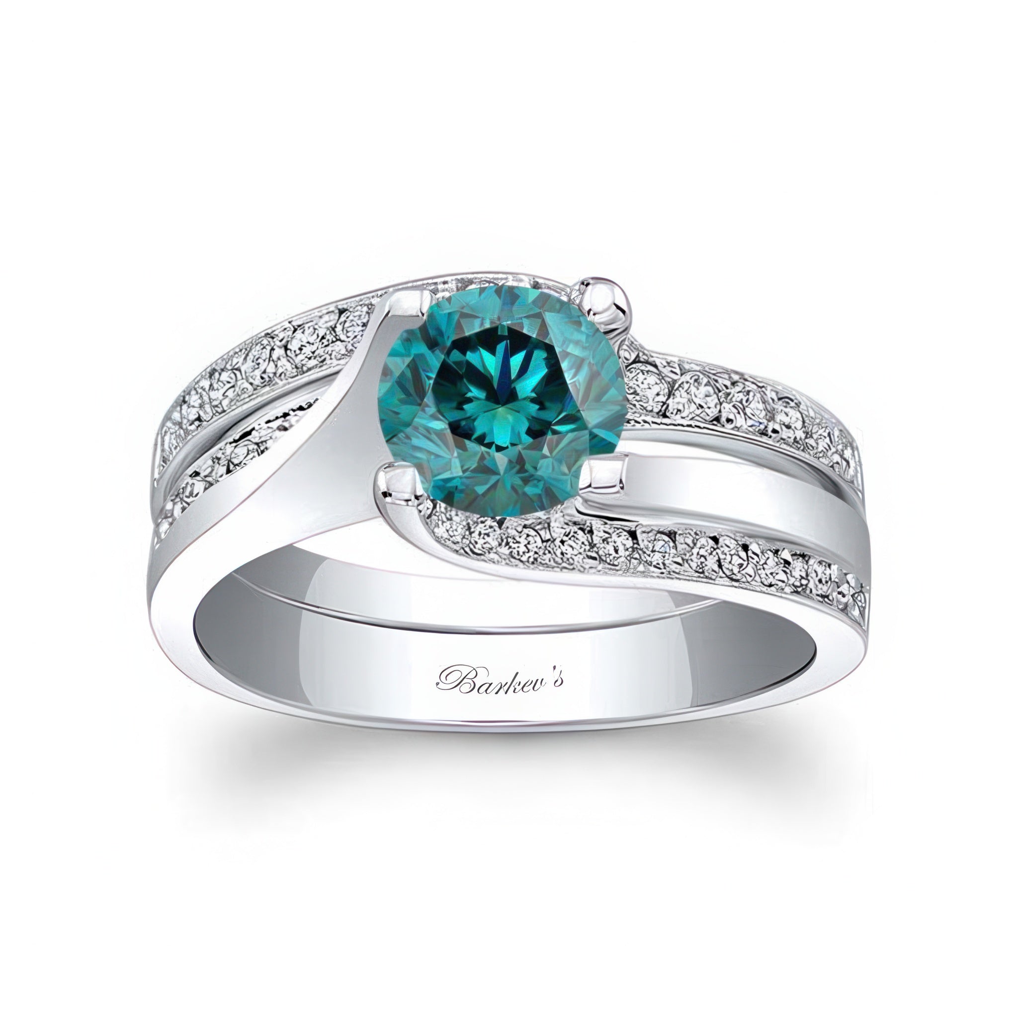 This 1 carat blue and white diamond curved bridal set features a prong set round center with a swooping shank enhanced with pave set diamonds and milgrain detailing for a sophisticated aura. Comes with a matching diamond wedding band.