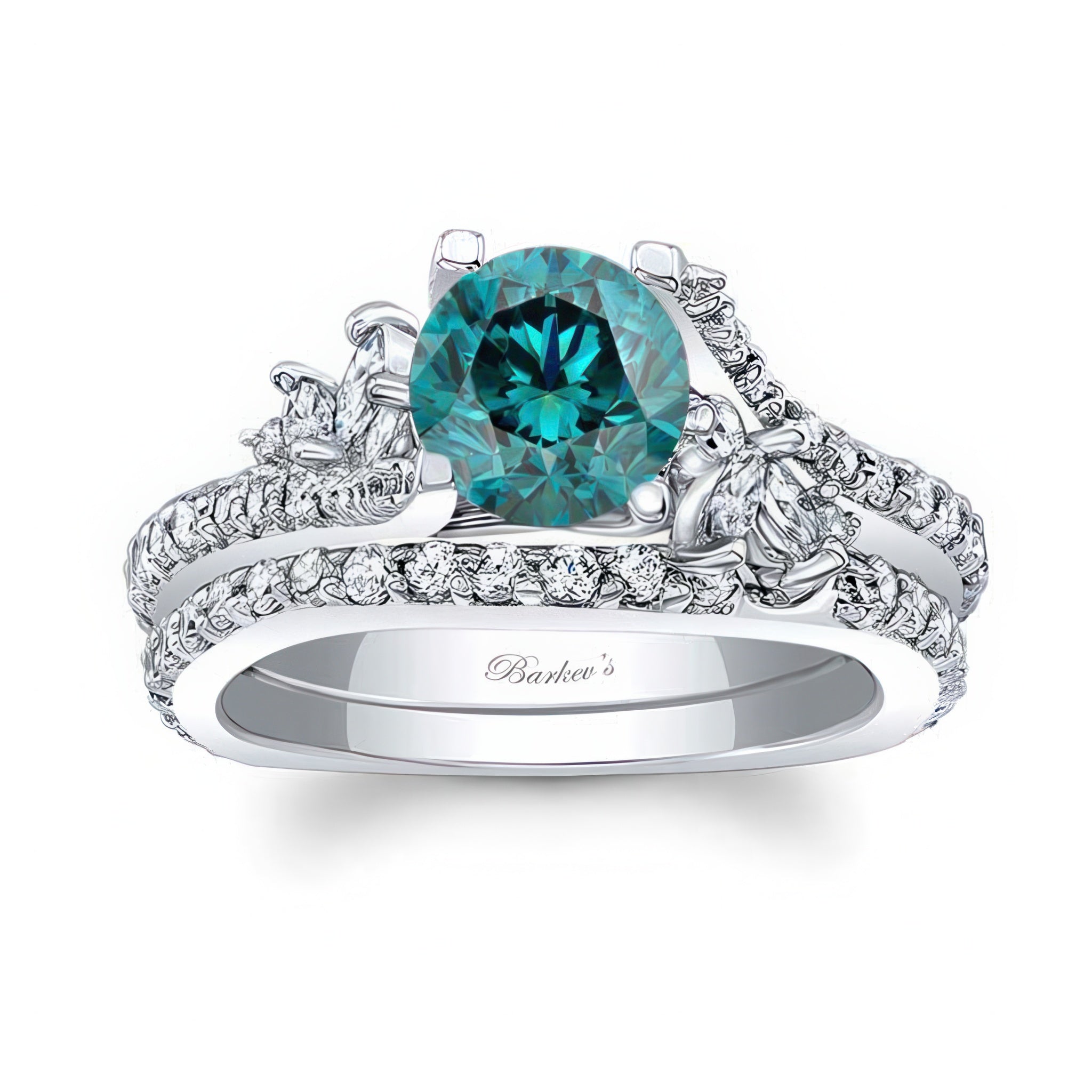 This elegant 1 carat round blue and white diamond bridal set features a prong set center stone graced on each side with a flare of marquise and round diamonds cascading down the dainty shank. Comes with a matching wedding band.