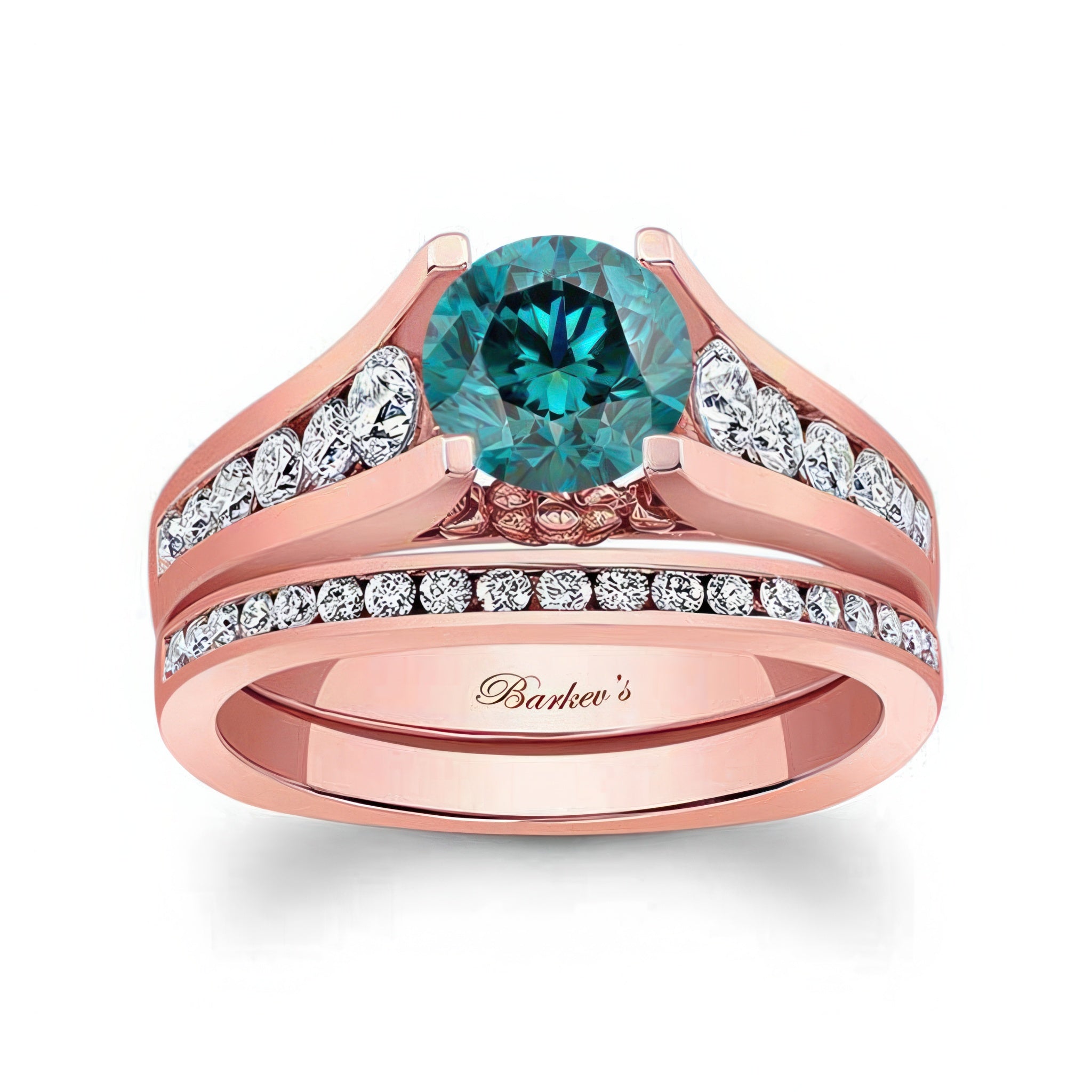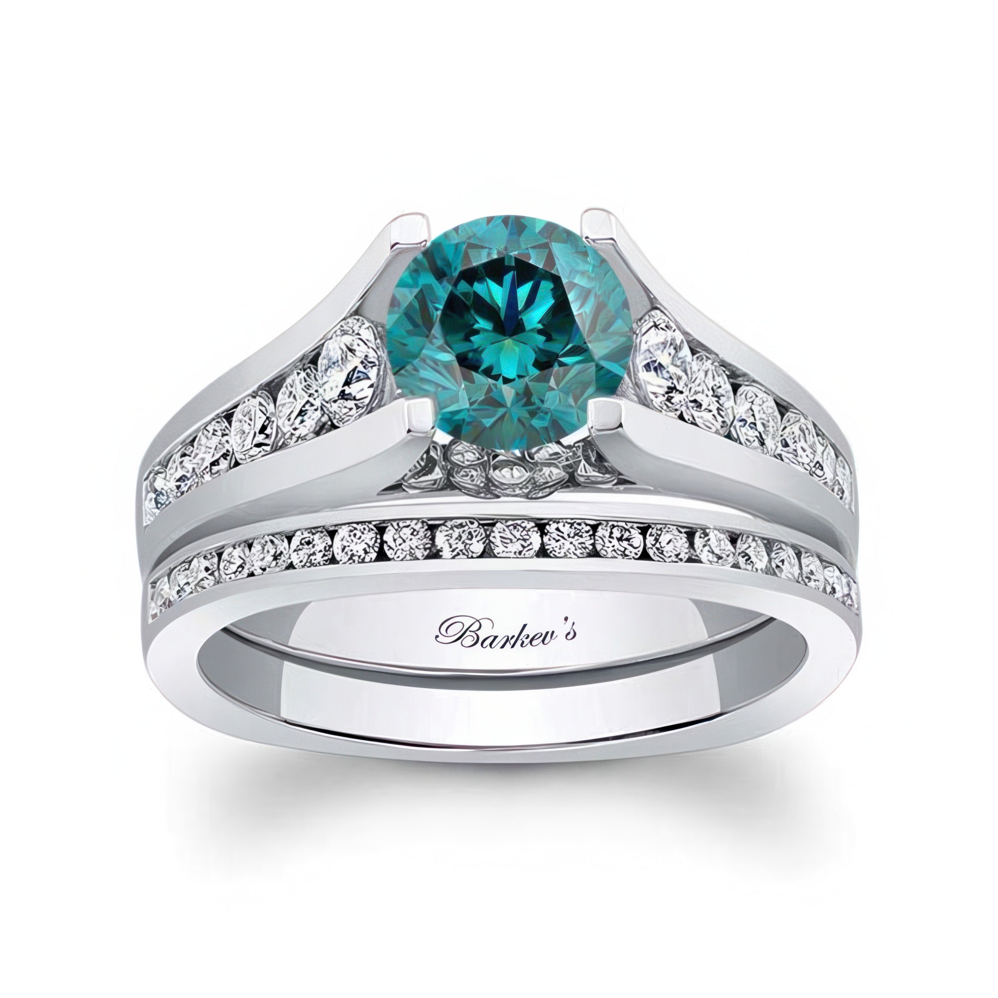 This classic blue and white diamond channel bridal set features a prong set round center with channel set diamonds graduating down the shank. Comes with a matching diamond wedding band for a traditional feel.