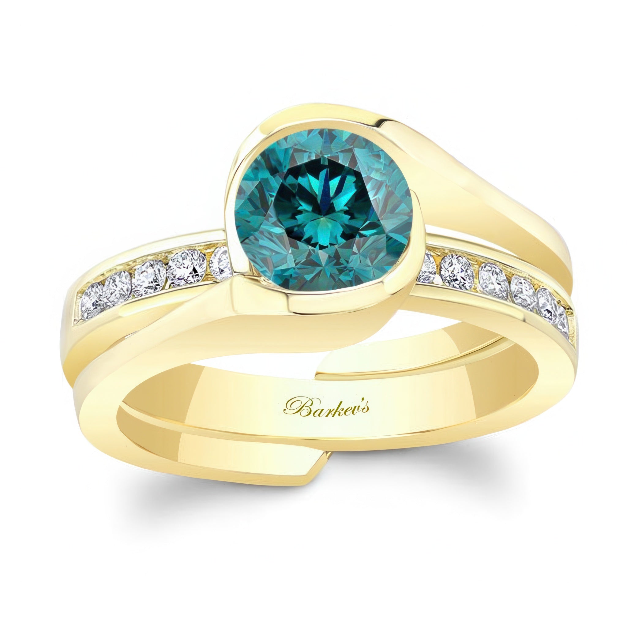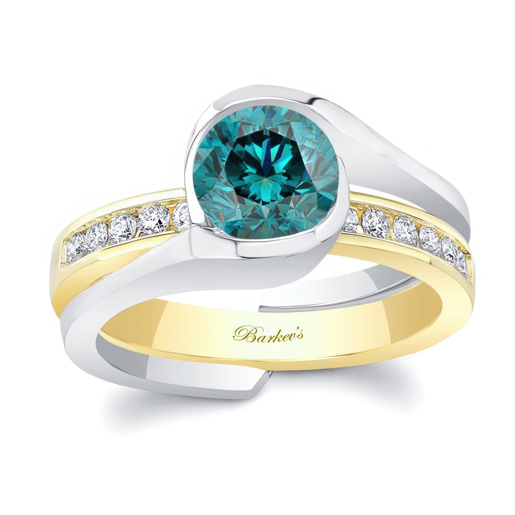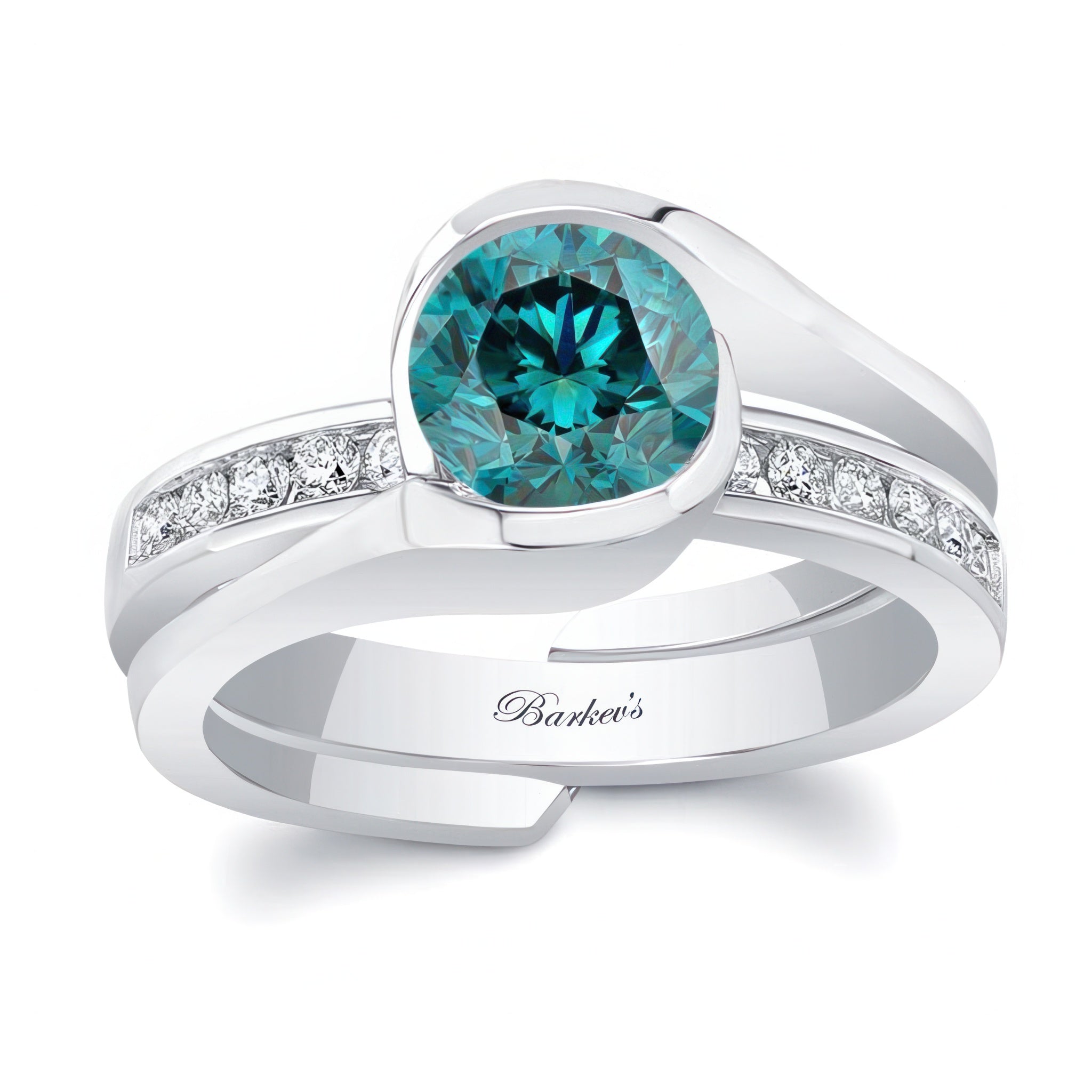 This half bezel blue and white diamond interlocking bridal set features a classic round center and a channel set diamond wedding band that slips into the ring for a display of true elegance.