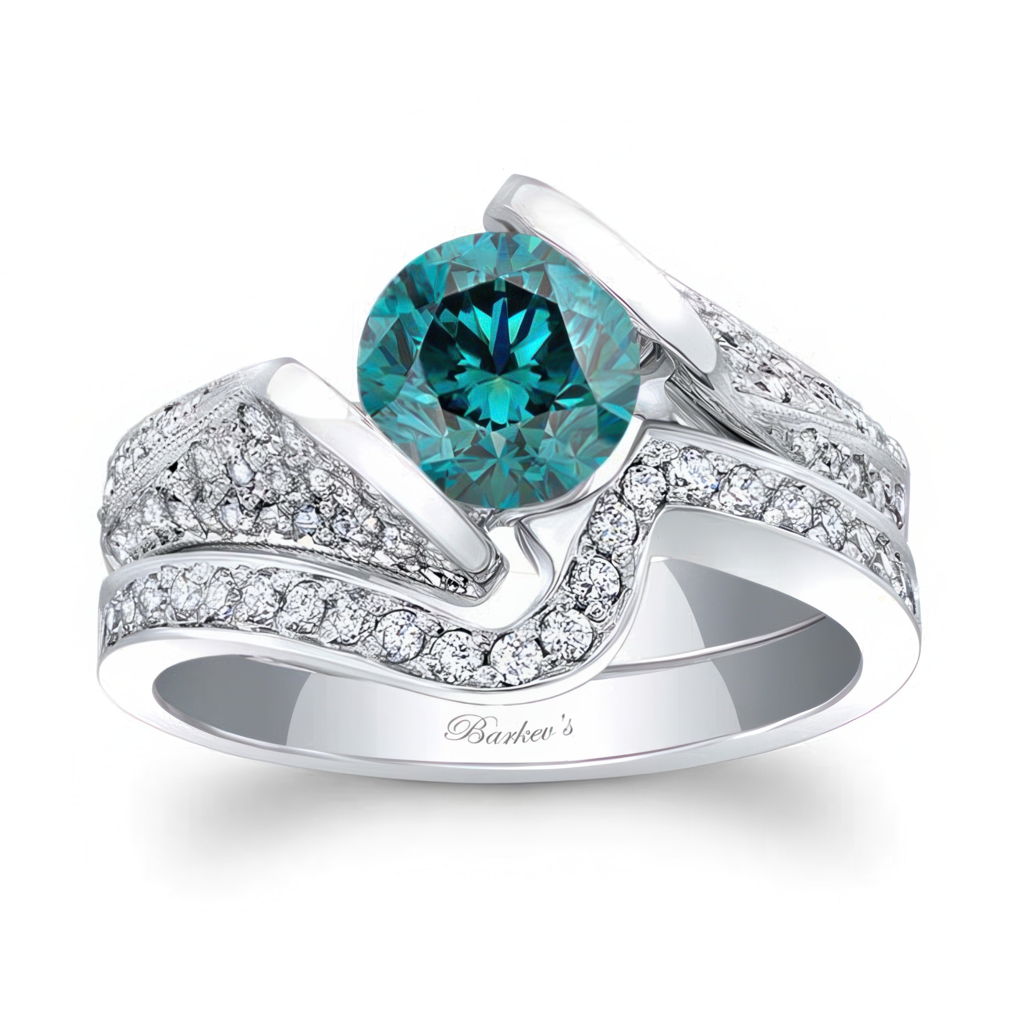 This pave round blue and white diamond ring set features a channel set round center with pave set diamonds cascading down the shoulders. Comes with a matching wedding band.