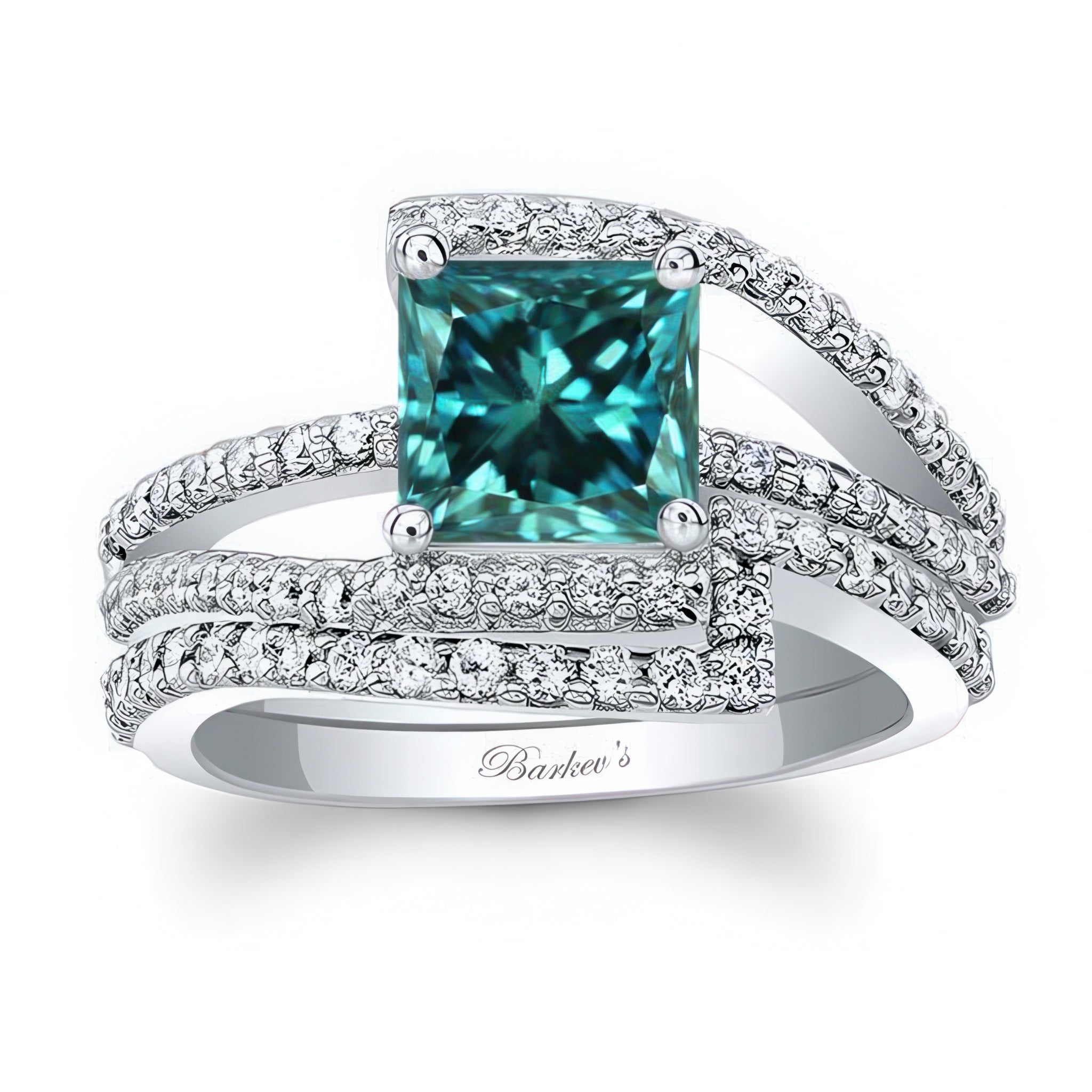 This split shank princess cut blue and white diamond bridal set features a prong set center with shared prong diamonds on the shank, shoulders and bridge. A matching diamond wedding band closely follows the engagement ring's curves for an added touch of elegance.