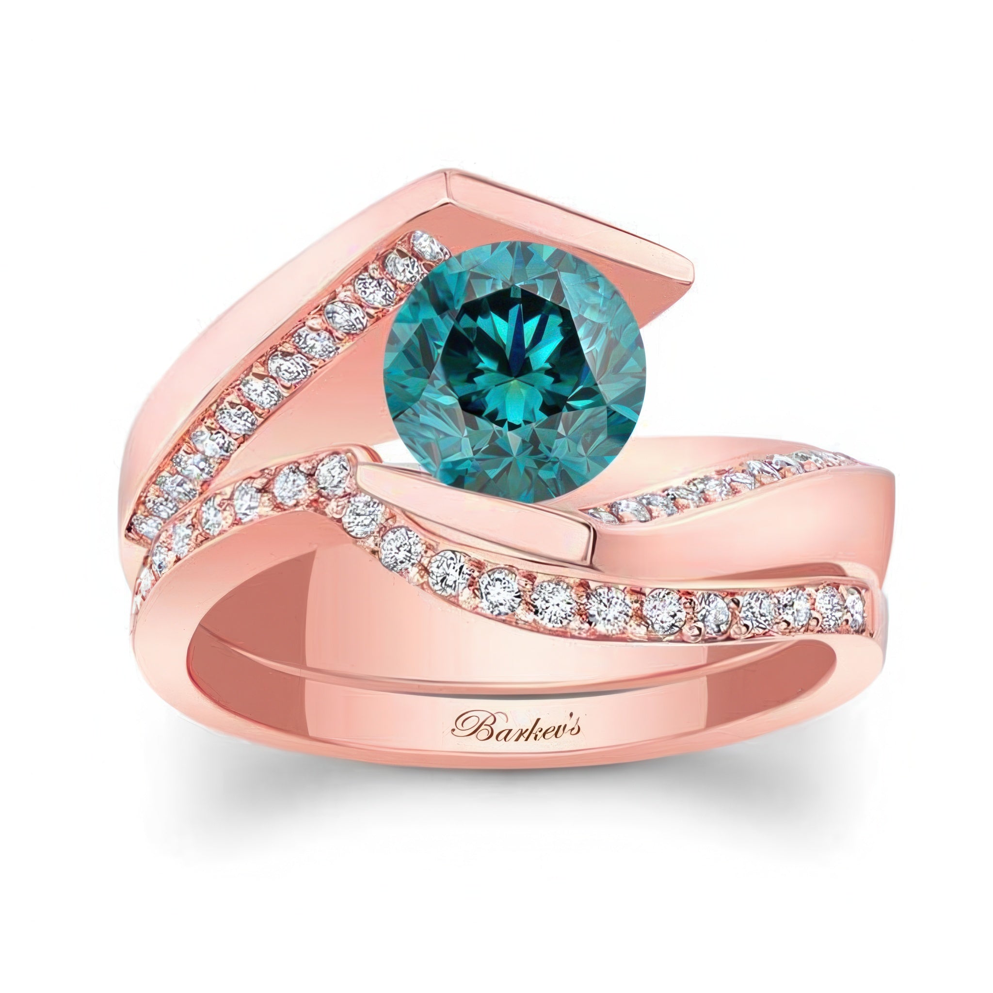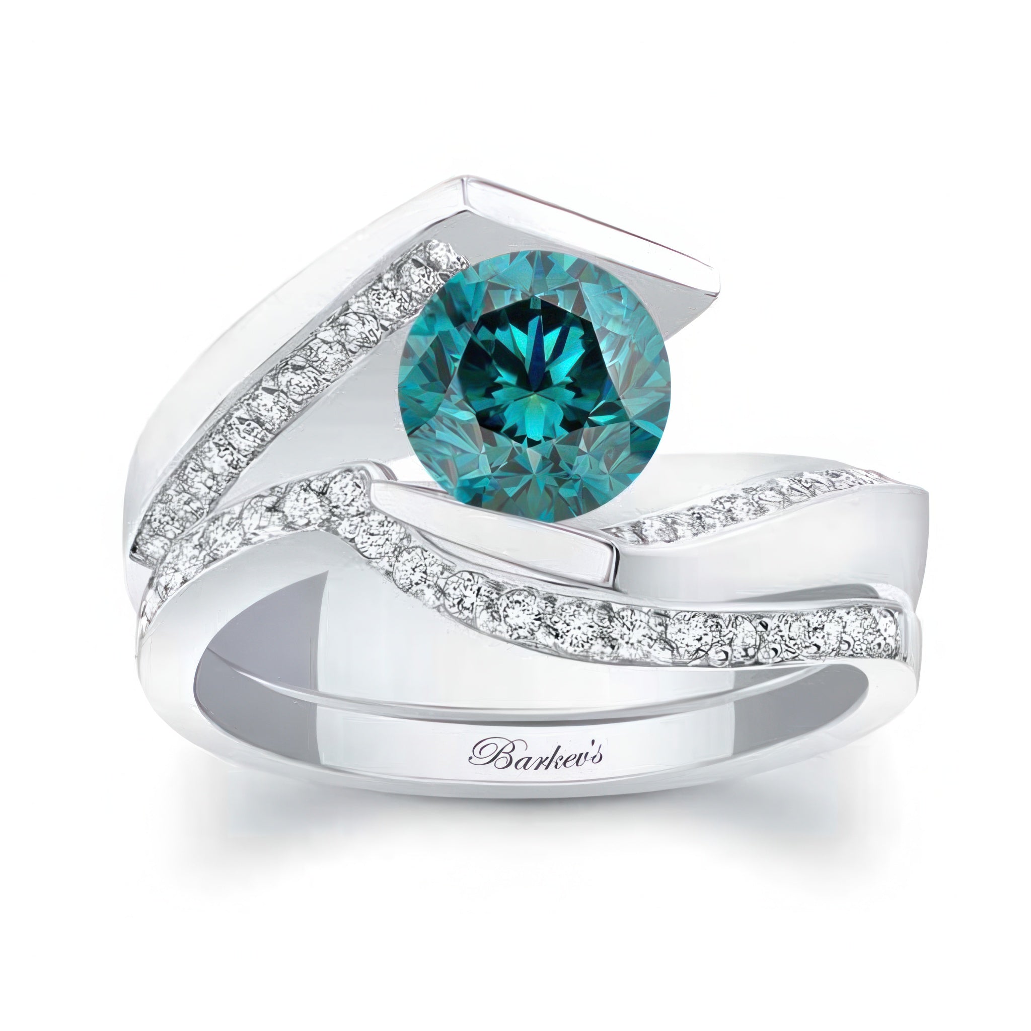 This stunning tension setting blue and white diamond bridal set is decorated by channel set diamonds on both sides of the shank, the ring gracefully twists whilst embracing the elevated center in a tension setting. Comes with a matching diamond wedding band.